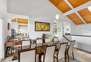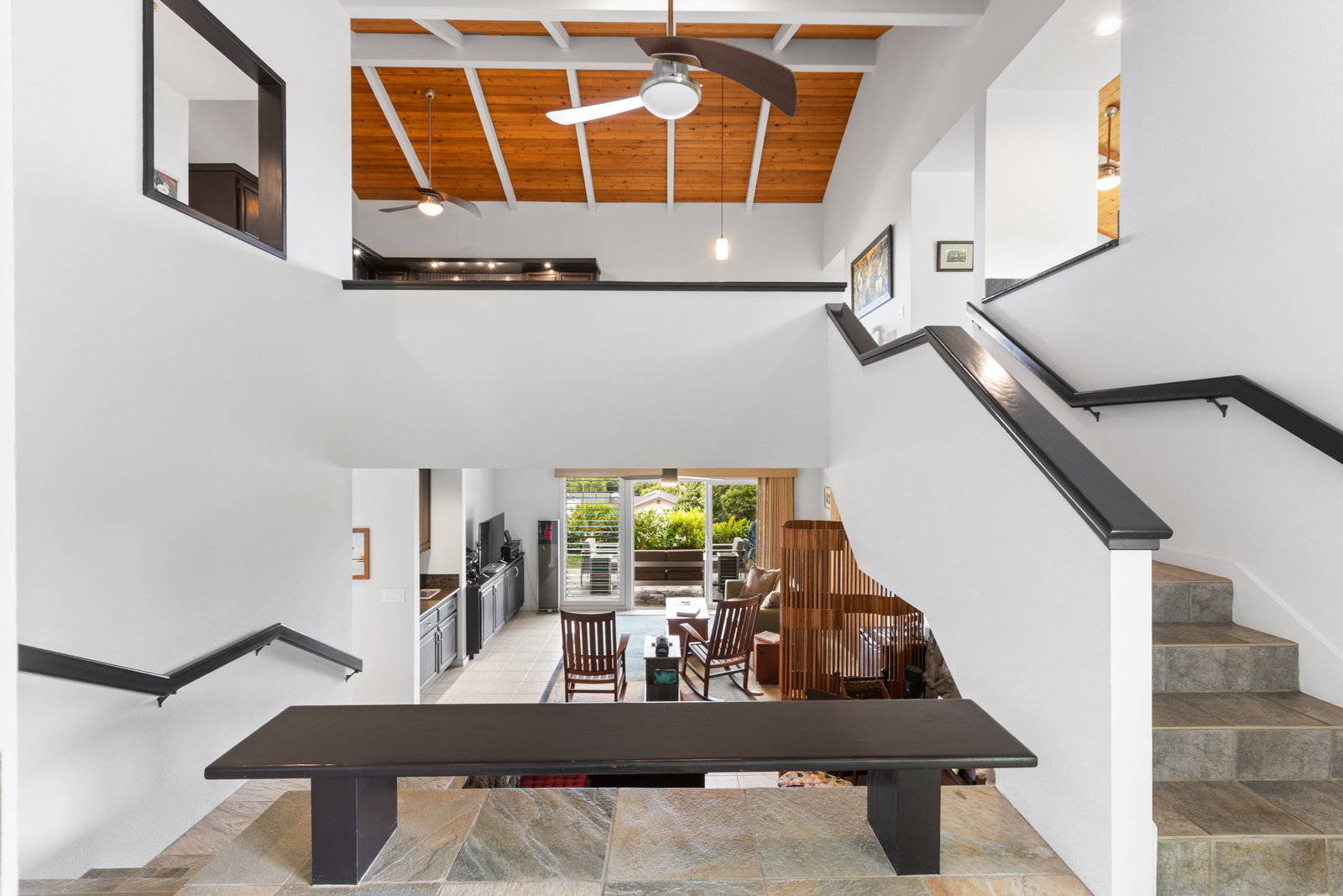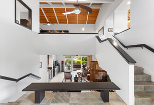 The dramatic, skylit foyer leads up to the main living area, open beam ceilings throughout.