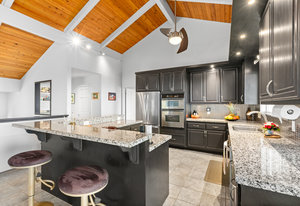 The beautiful, centrally located island kitchen has granite counters and ample cabinets.