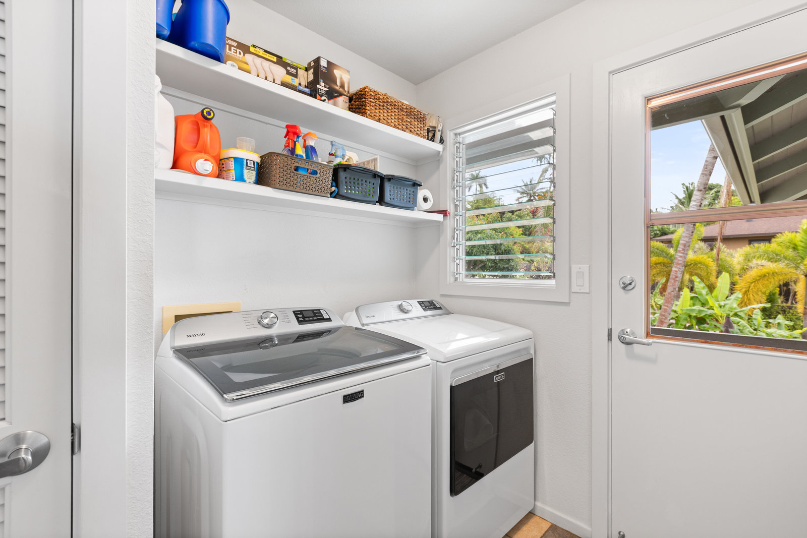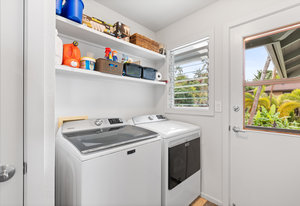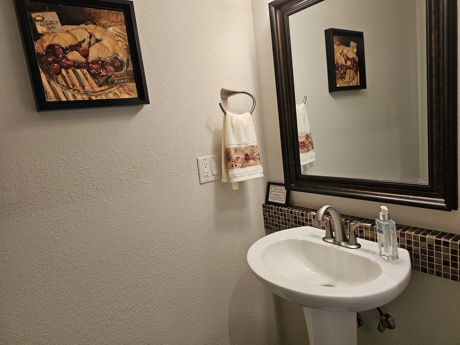 There is a powder room in the hallway to the laundry room, with easy access to the pool.