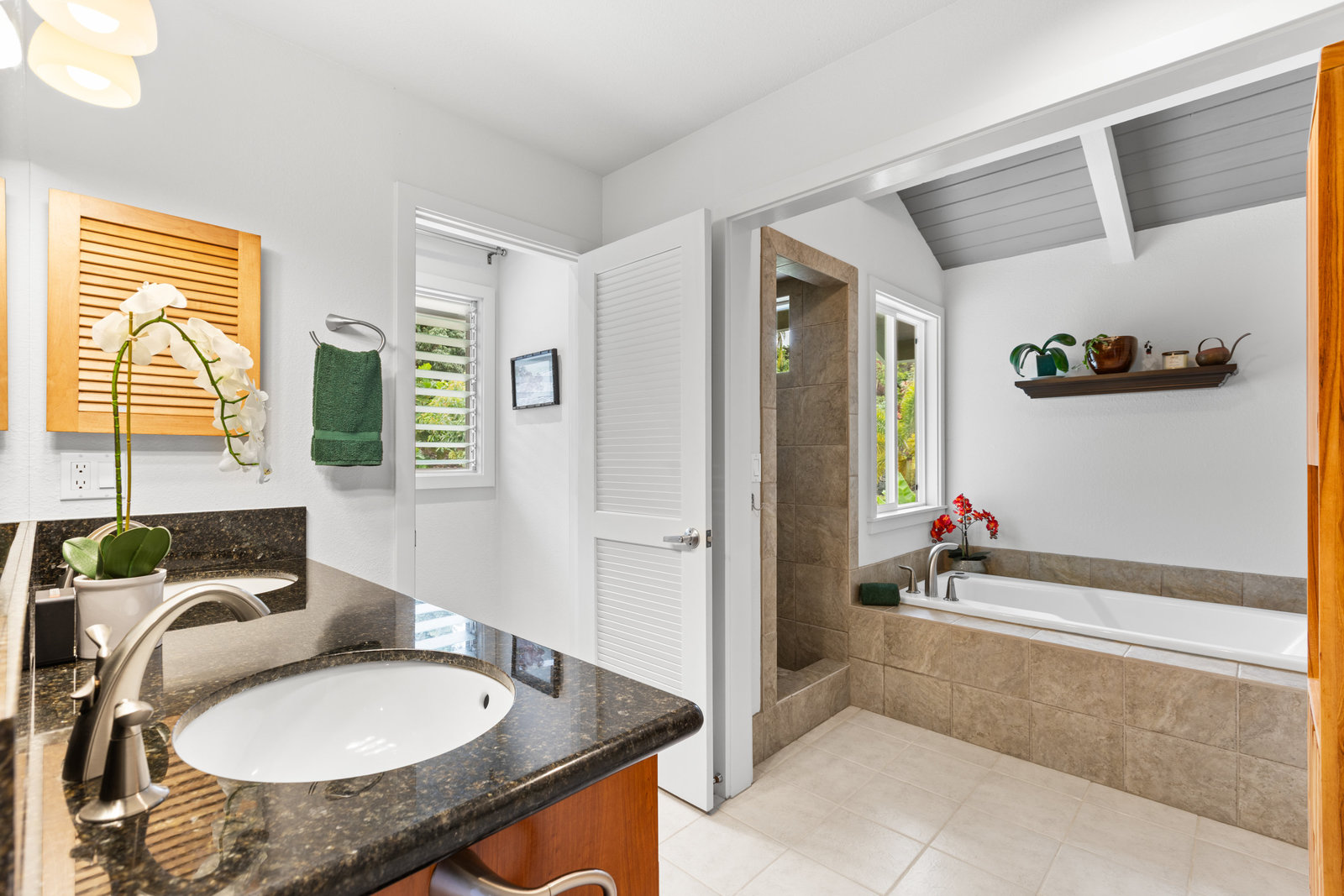 The spacious primary bathroom has a soaking tub, separate tiled shower and dual vanities.
