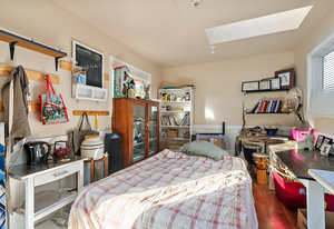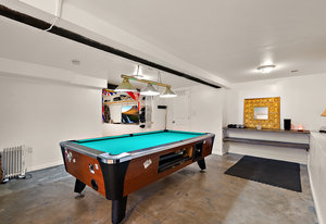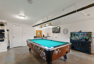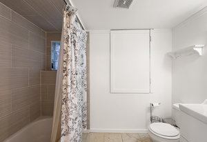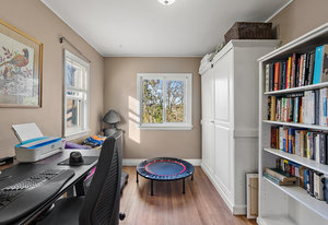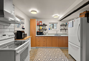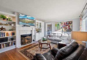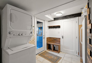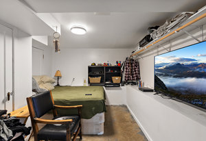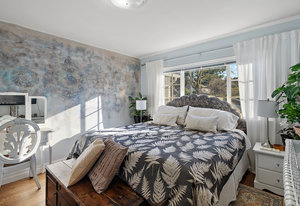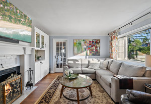 The main living area bathes in natural light, complemented by built-in storage and seamless flow into a formal dining space, ready to host over eight guests. The renovated kitchen is a chef’s delight, with ample storage and views of the enchanting outdoor greenery. Bedrooms on the main level offer flexibility, including a Murphy bed in the second bedroom for dual use as an office or gym, alongside a spacious primary bedroom with ample closet space.
