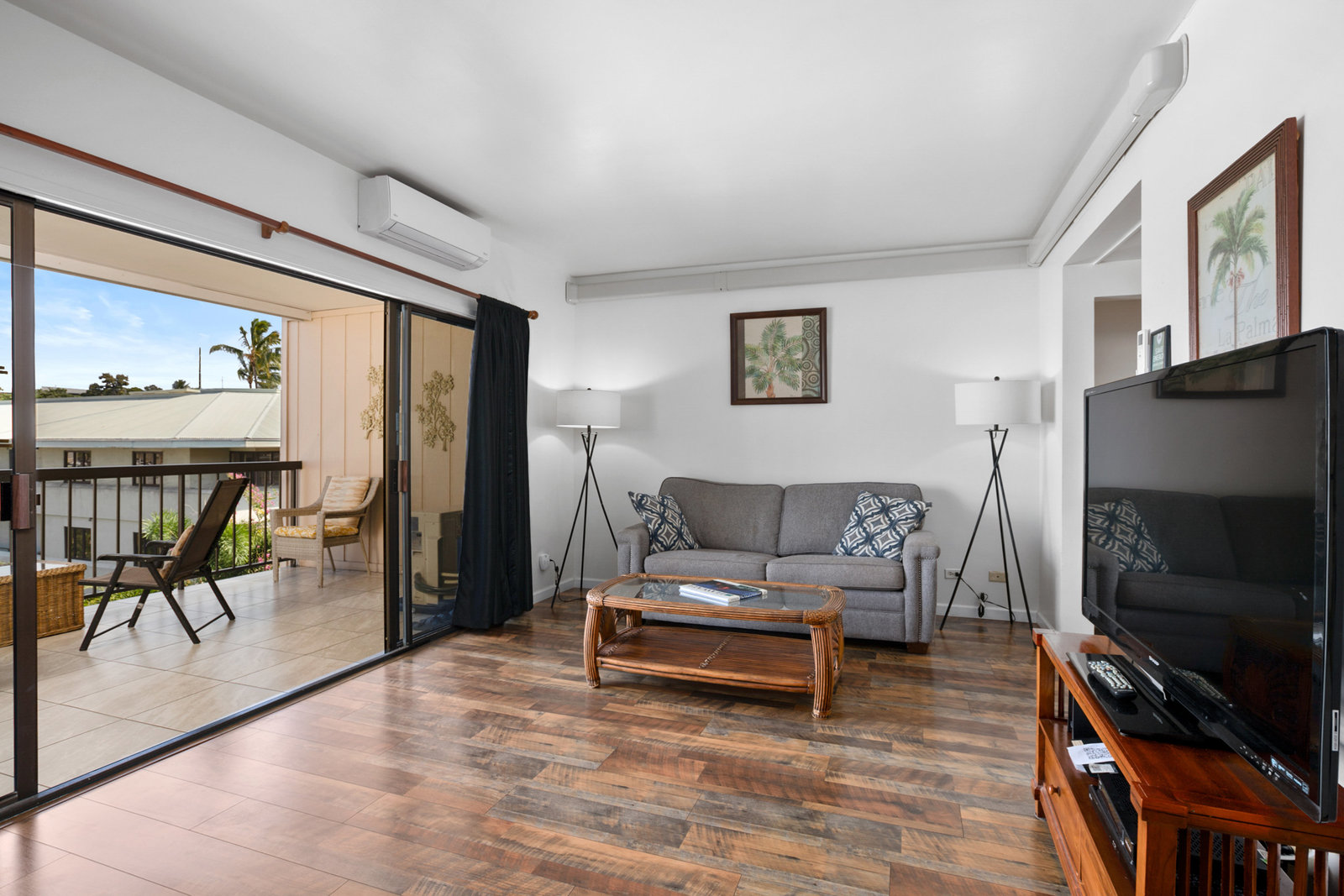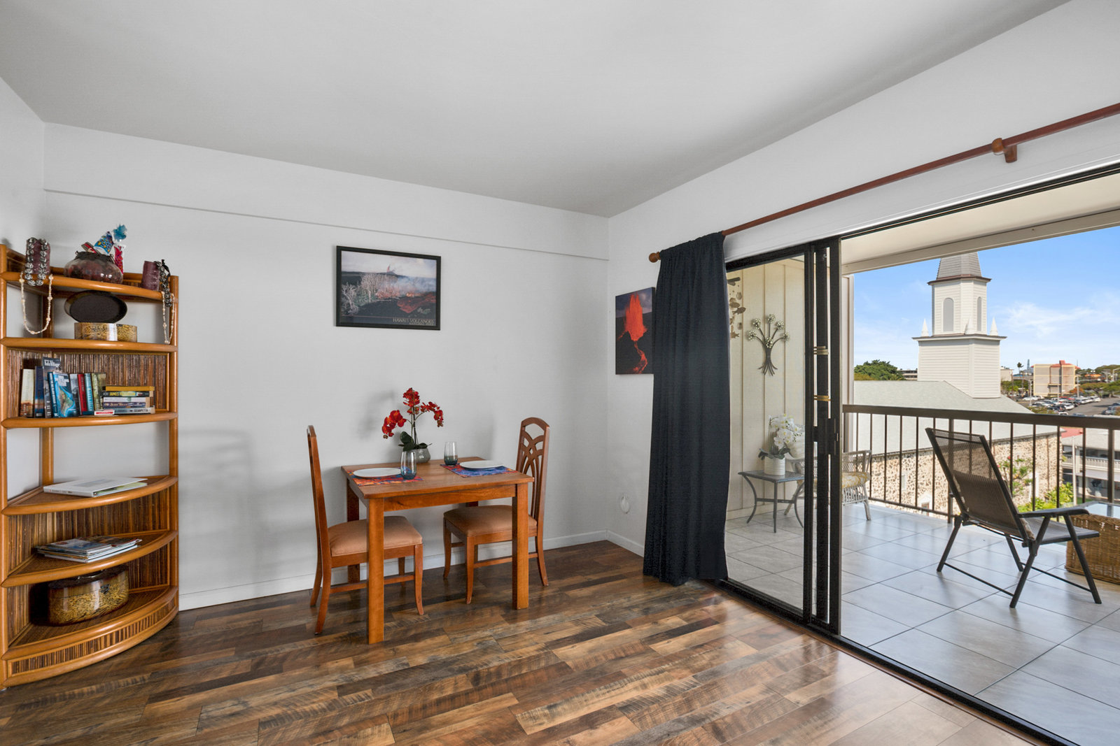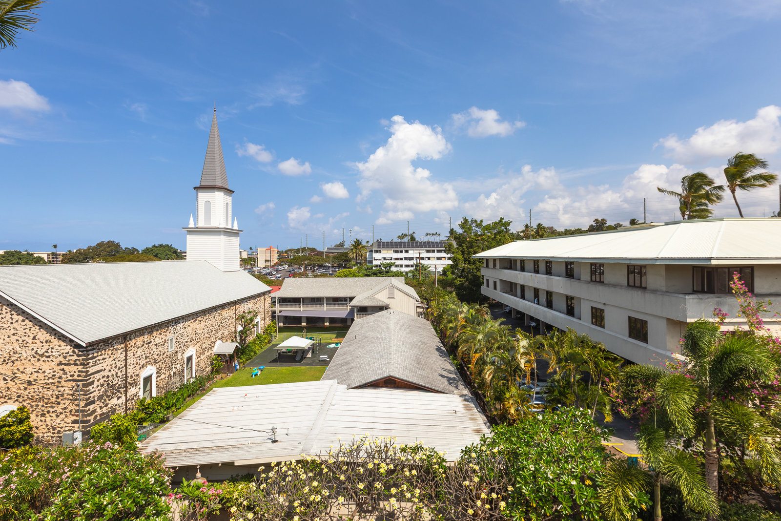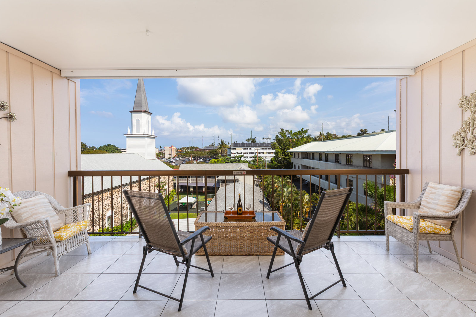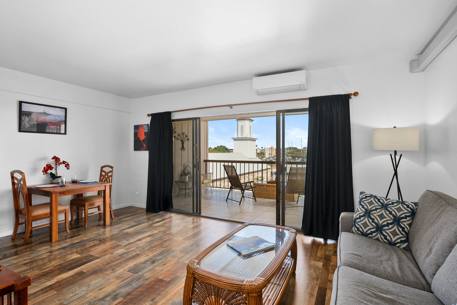 Fully furnished living room and spacious lanai overlook Mokuaikaua Church.