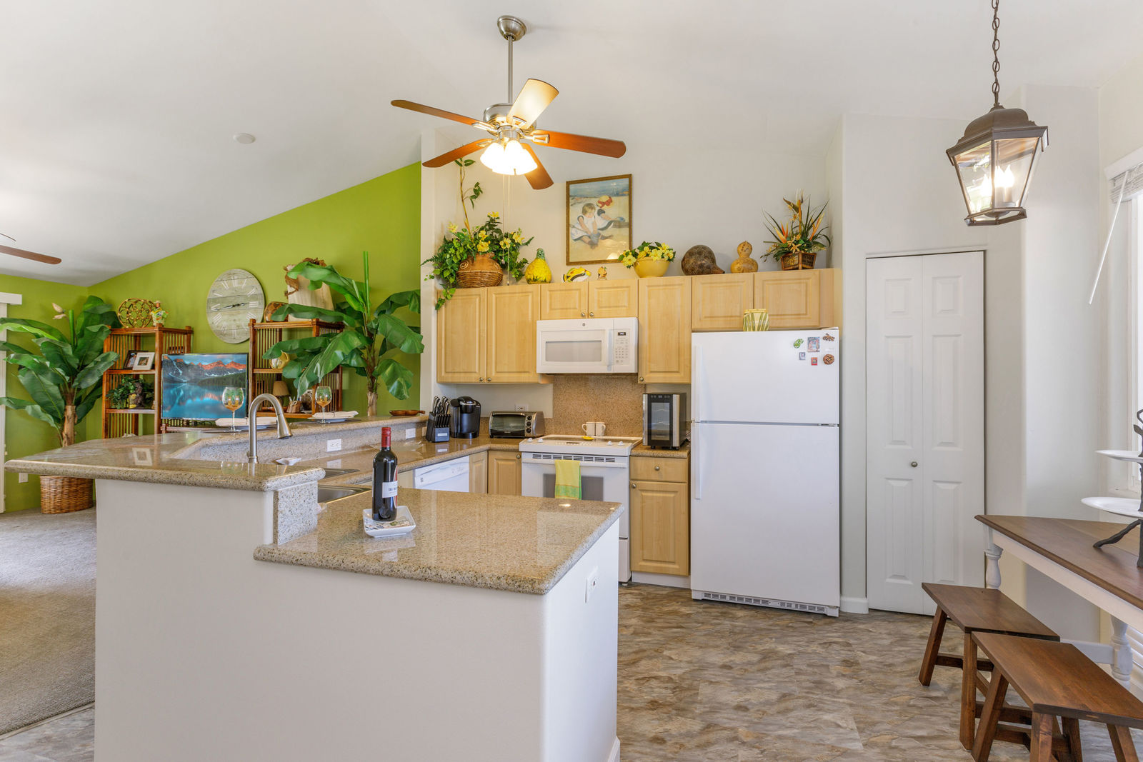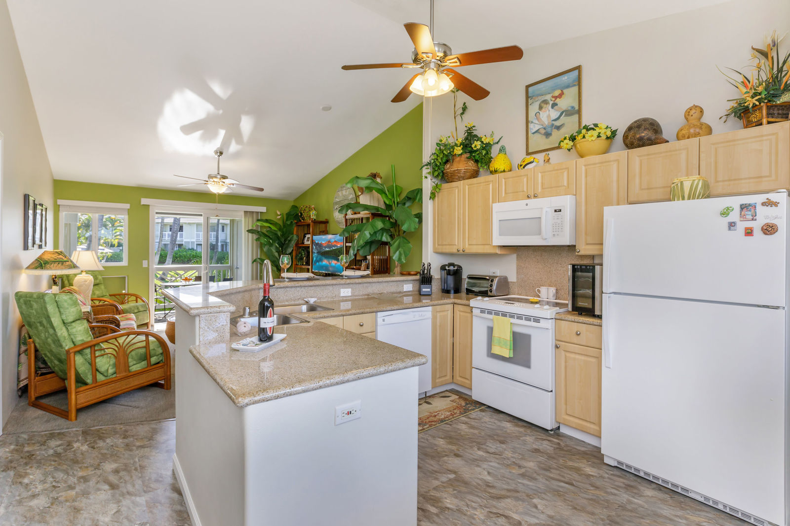 Granite countertops, vaulted ceilings in living/kitchen area, all flooring recently replaced.