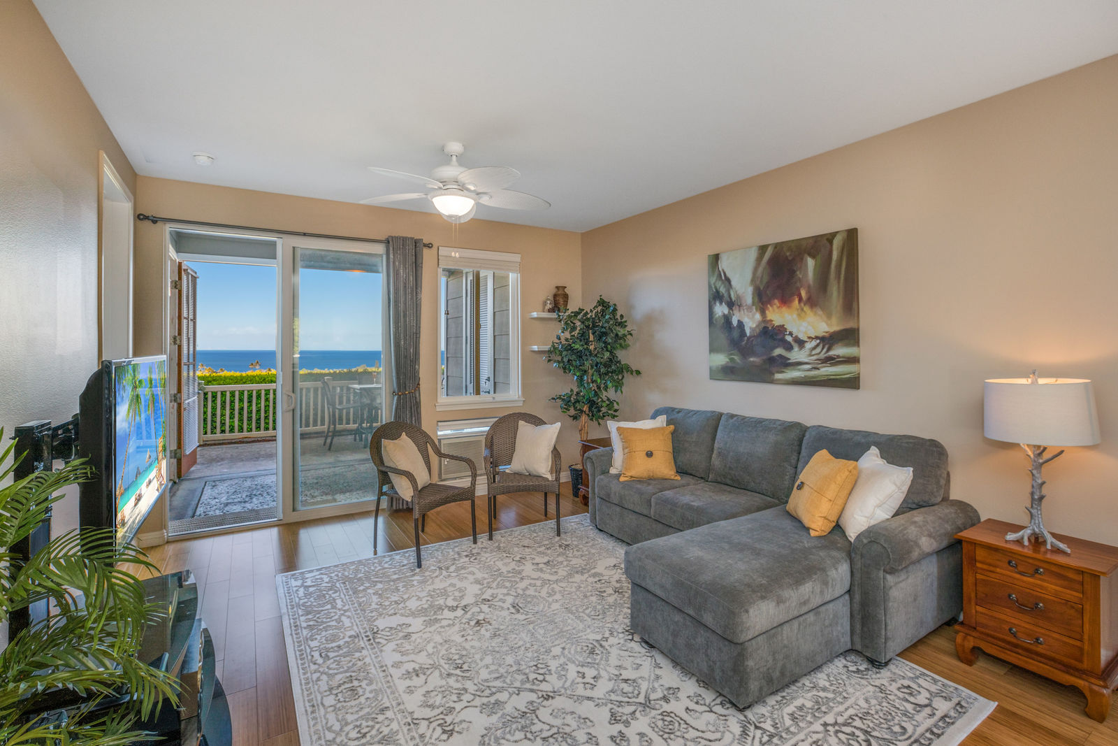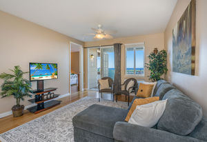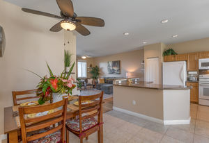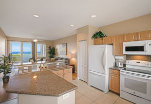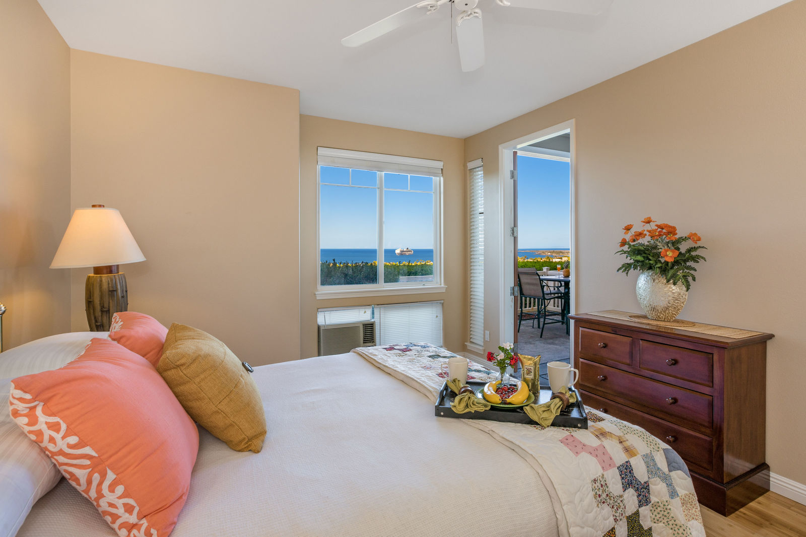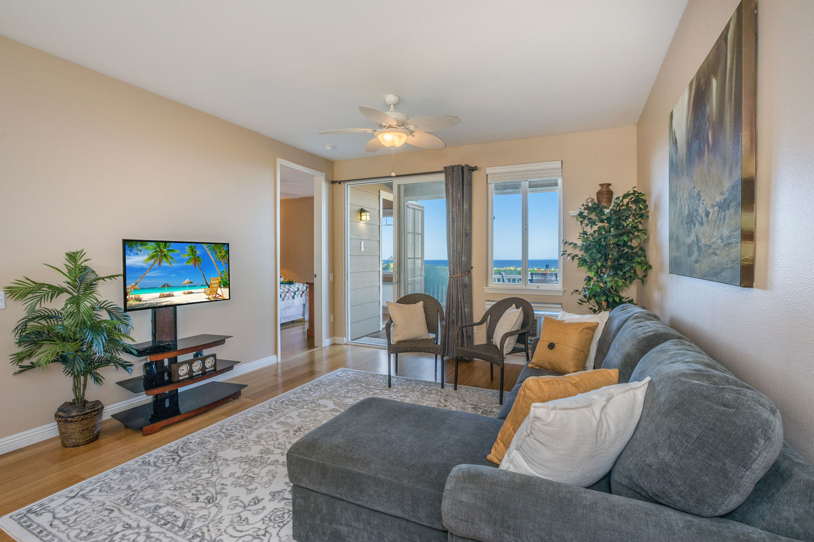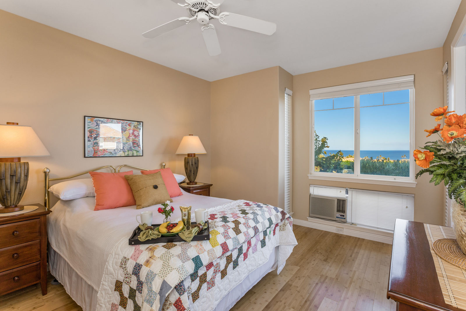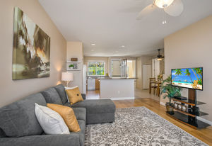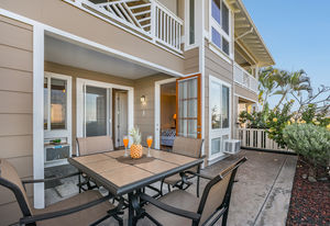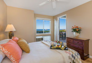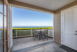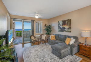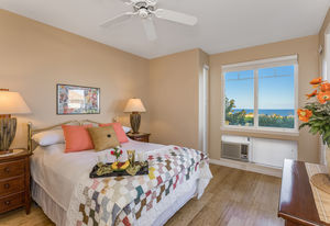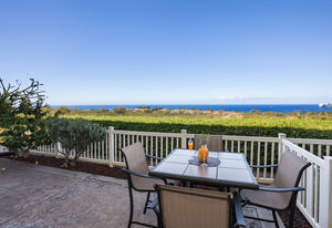 Amazing Ocean Views from this spacious apartment with huge patio and ginormouse ocean views. Exceptional floor plan with kitchen, living, dining area, 2bedroom/2bathroom. Upgraded with bamboo flooring, newer appliances, new Hunter Douglas Blinds throughout. Open floor plan boasts 9' ceilings and most rooms look out to the beautiful Pacific Ocean. Located in a small gated complex, this is a condo that feels like a home. Don't miss out on this special property located close to shopping, restaurants and the beach yet far enough away for peace and quiet. Single car garage and additional deeded parking stall included. The complex offers a community garden, Securely gated, pool, spa, work out room and BBcue area. The apartment is offered turnkey furnished, staging items excluded.