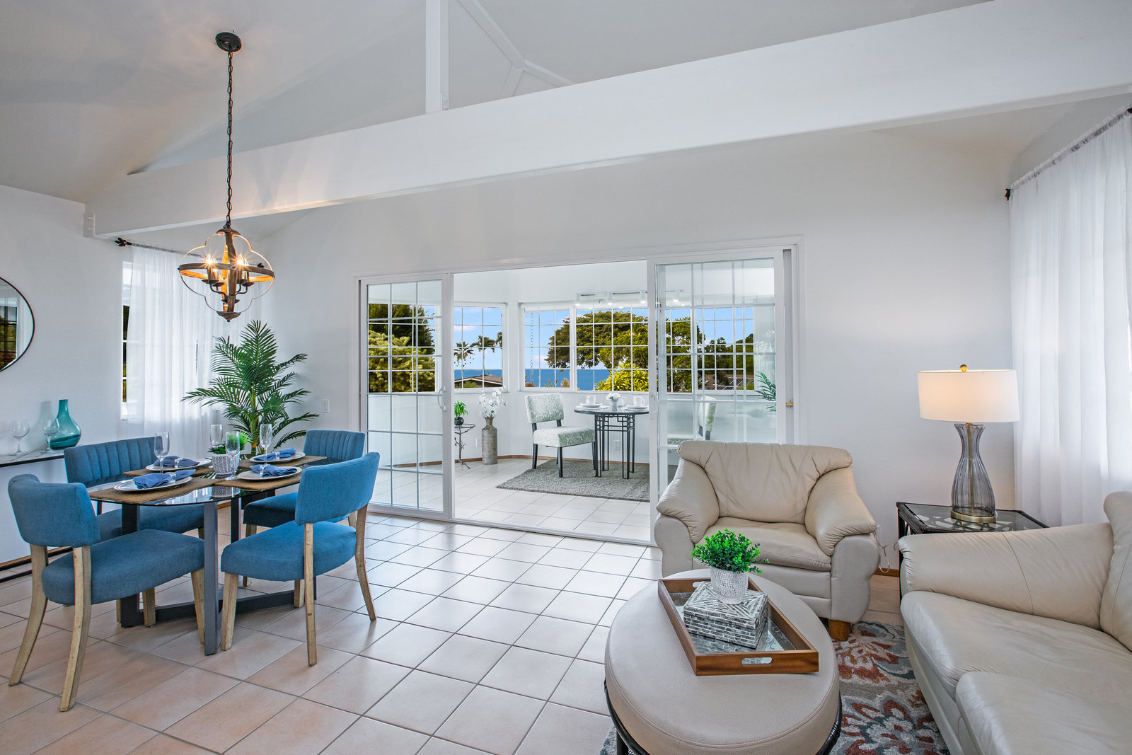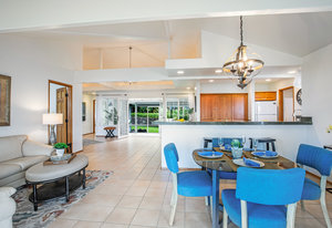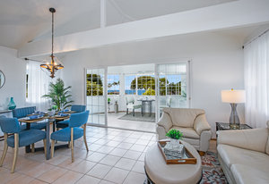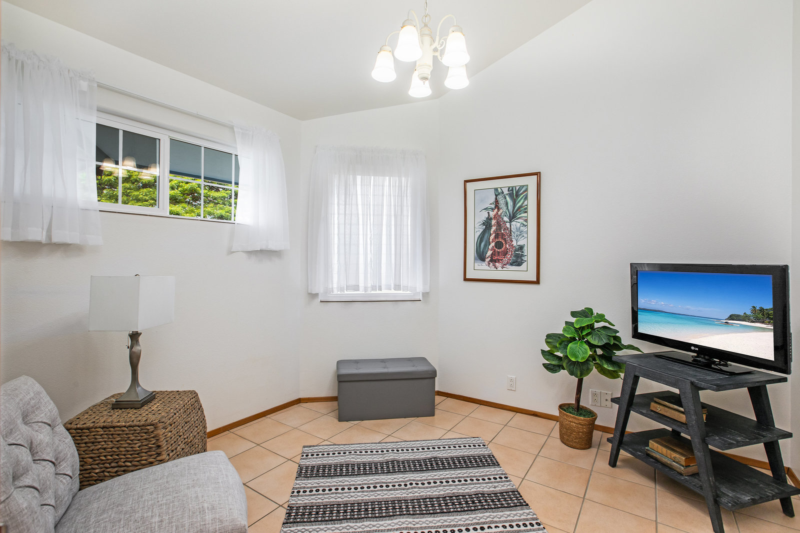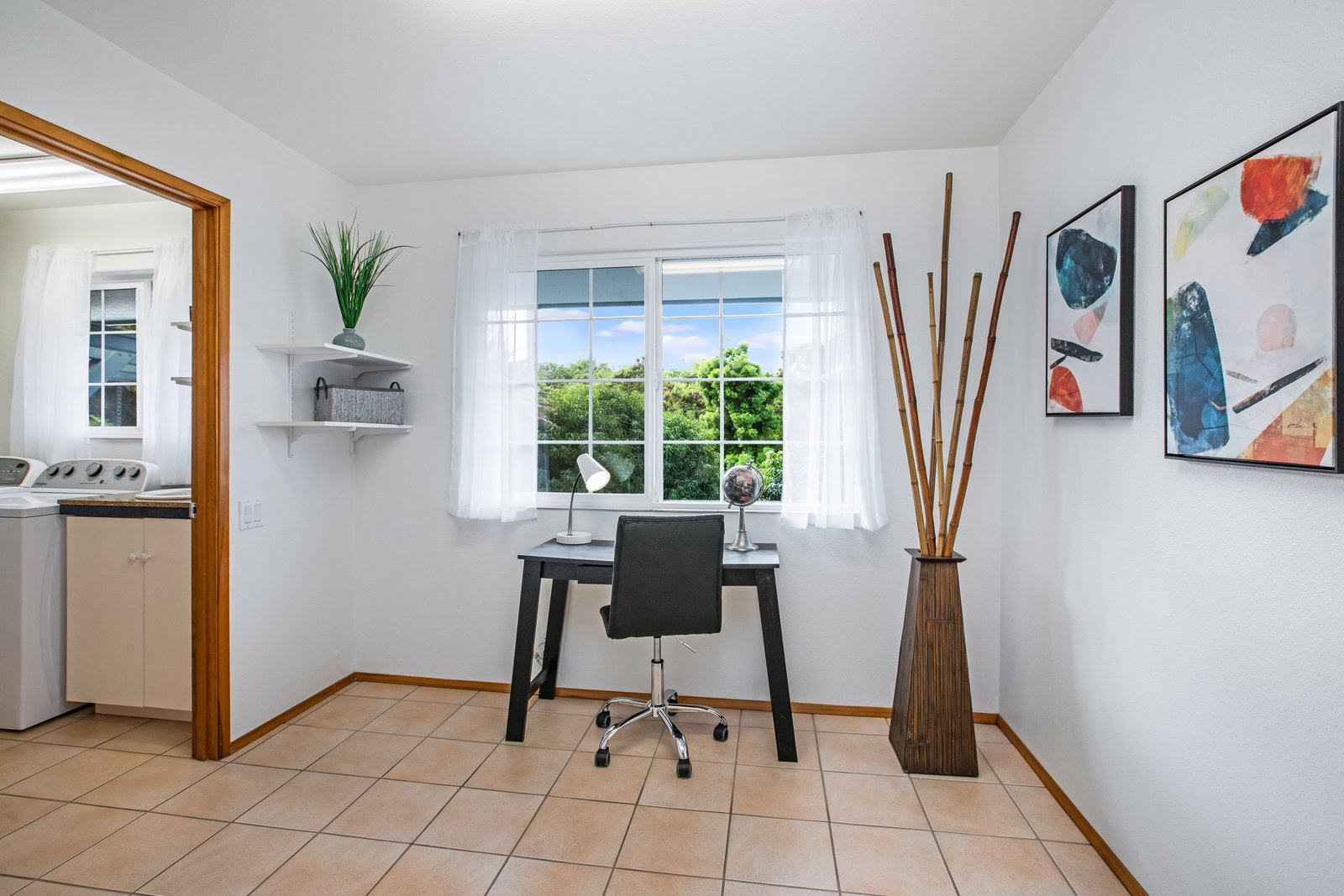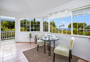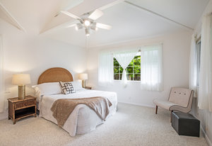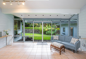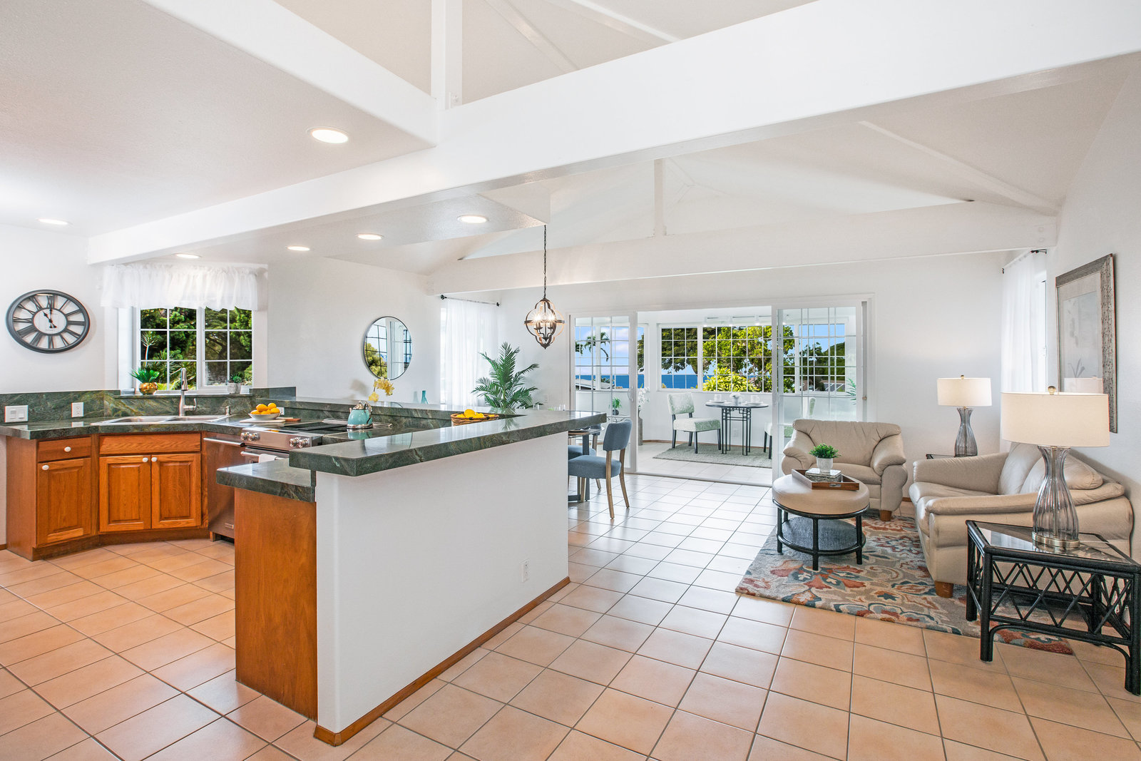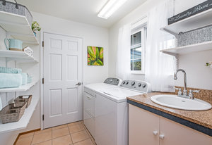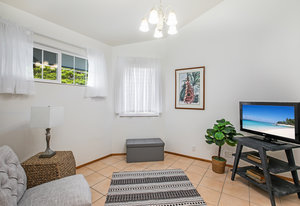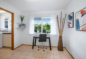 The spacious living area with exposed beam ceiling opens on the ocean side to a sun room with an outdoor lanai. On the mauka side is a screened lanai, shady in the afternoon and overlooking the private backyard. Tiled throughout, except in the 2 bedrooms with a Jack & Jill bathroom in between. Through the kitchen is a butler pantry leading to a sewing room (or office area) off the laundry room. The 3rd bedroom, with optional direct outside access and a vanity sink, was previously used as a home office.