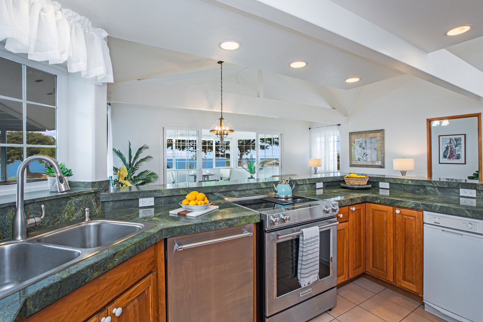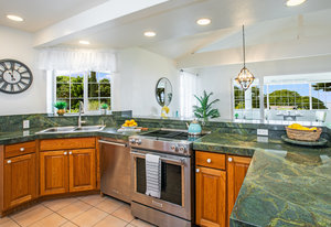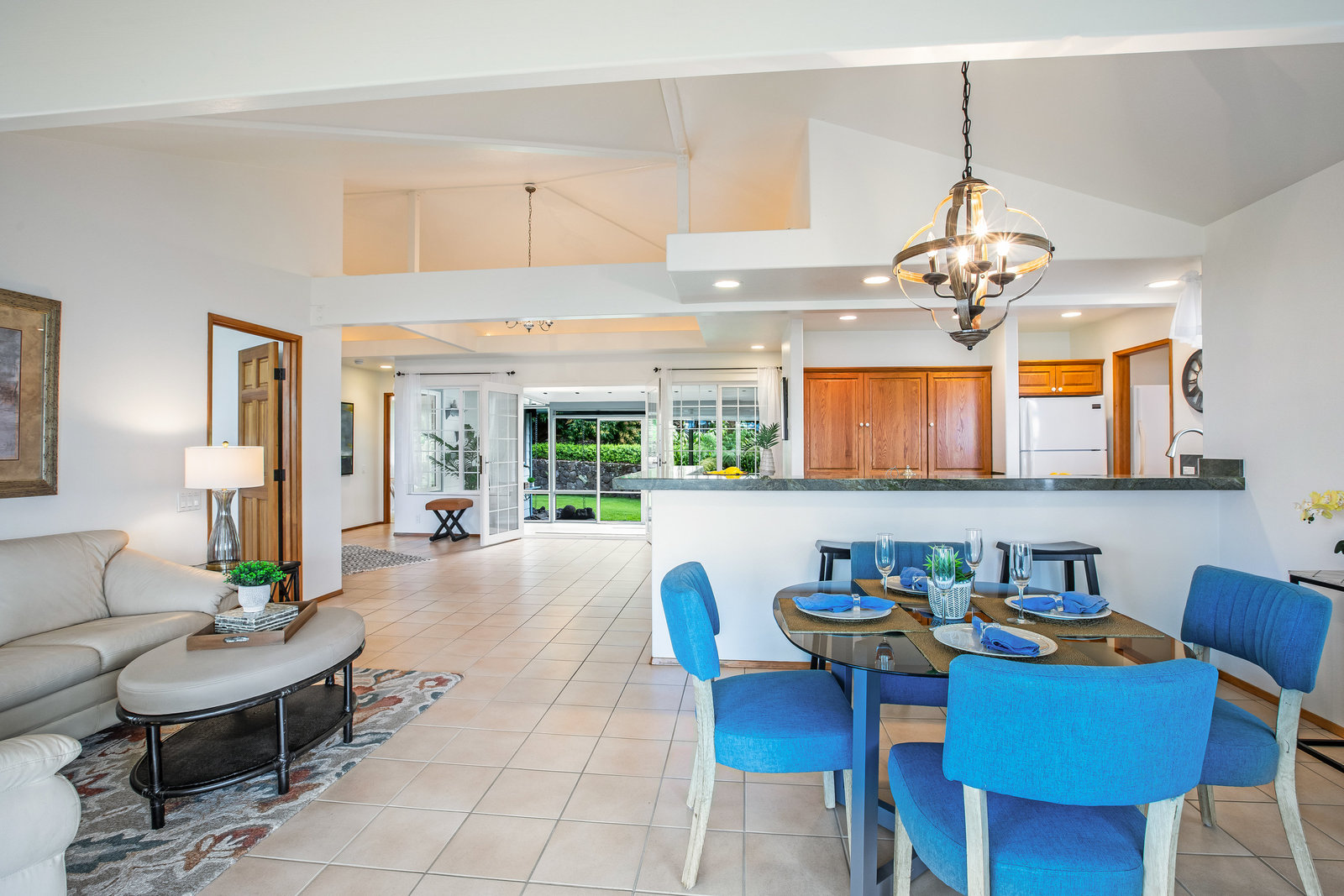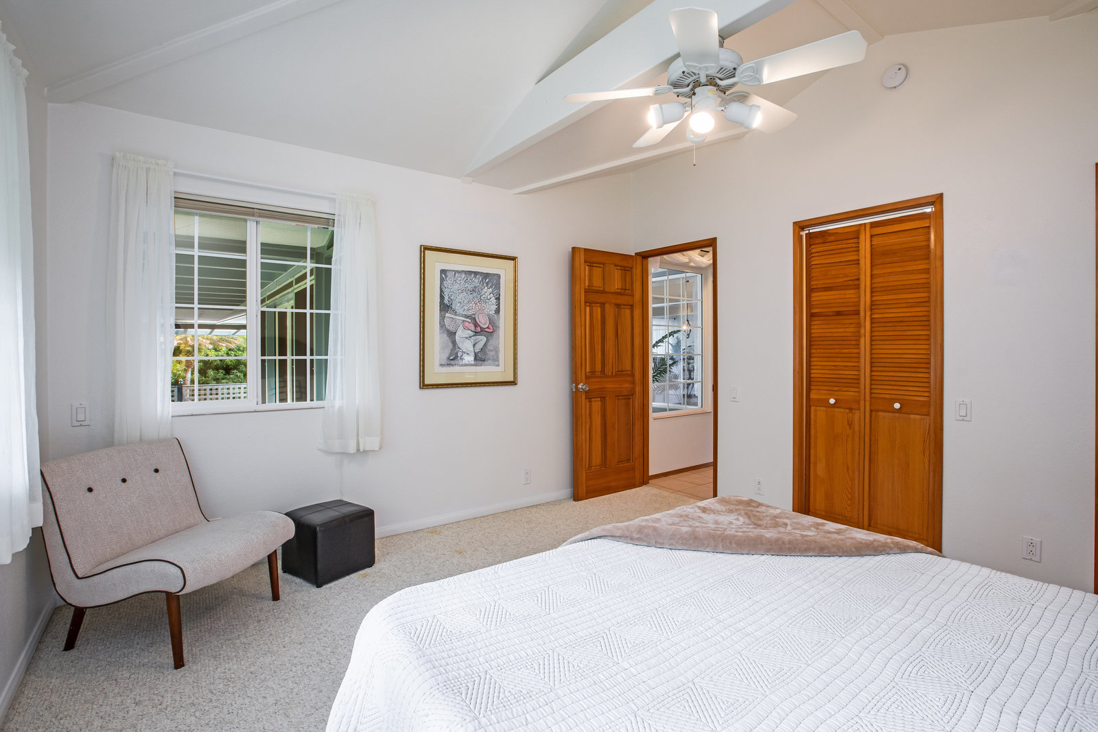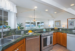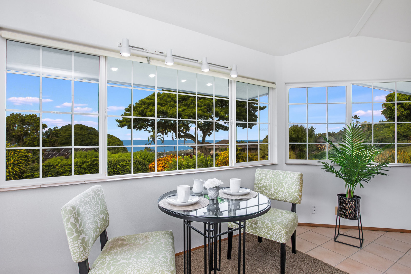 The spacious living area with exposed beam ceiling opens on the ocean side to a sun room with an outdoor lanai. On the mauka side is a screened lanai, shady in the afternoon and overlooking the private backyard. Tiled throughout, except in the 2 bedrooms with a Jack & Jill bathroom in between. Through the kitchen is a butler pantry leading to a sewing room (or office area) off the laundry room. The 3rd bedroom, with optional direct outside access and a vanity sink, was previously used as a home office.