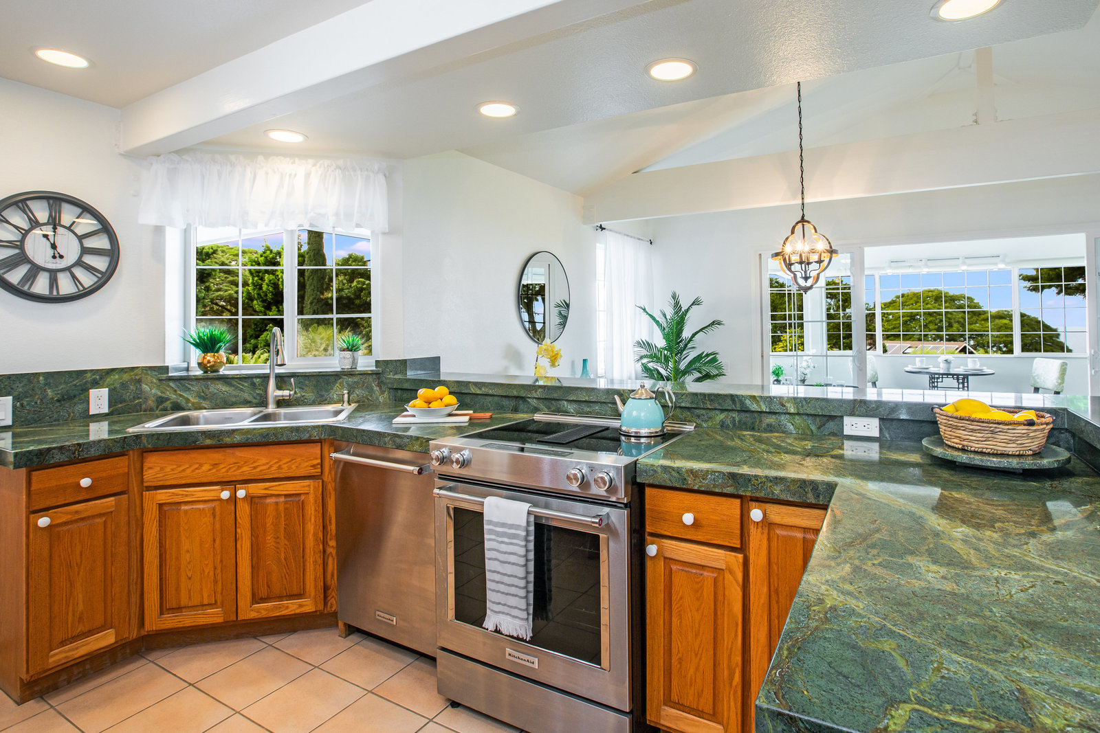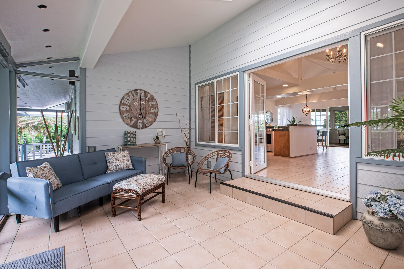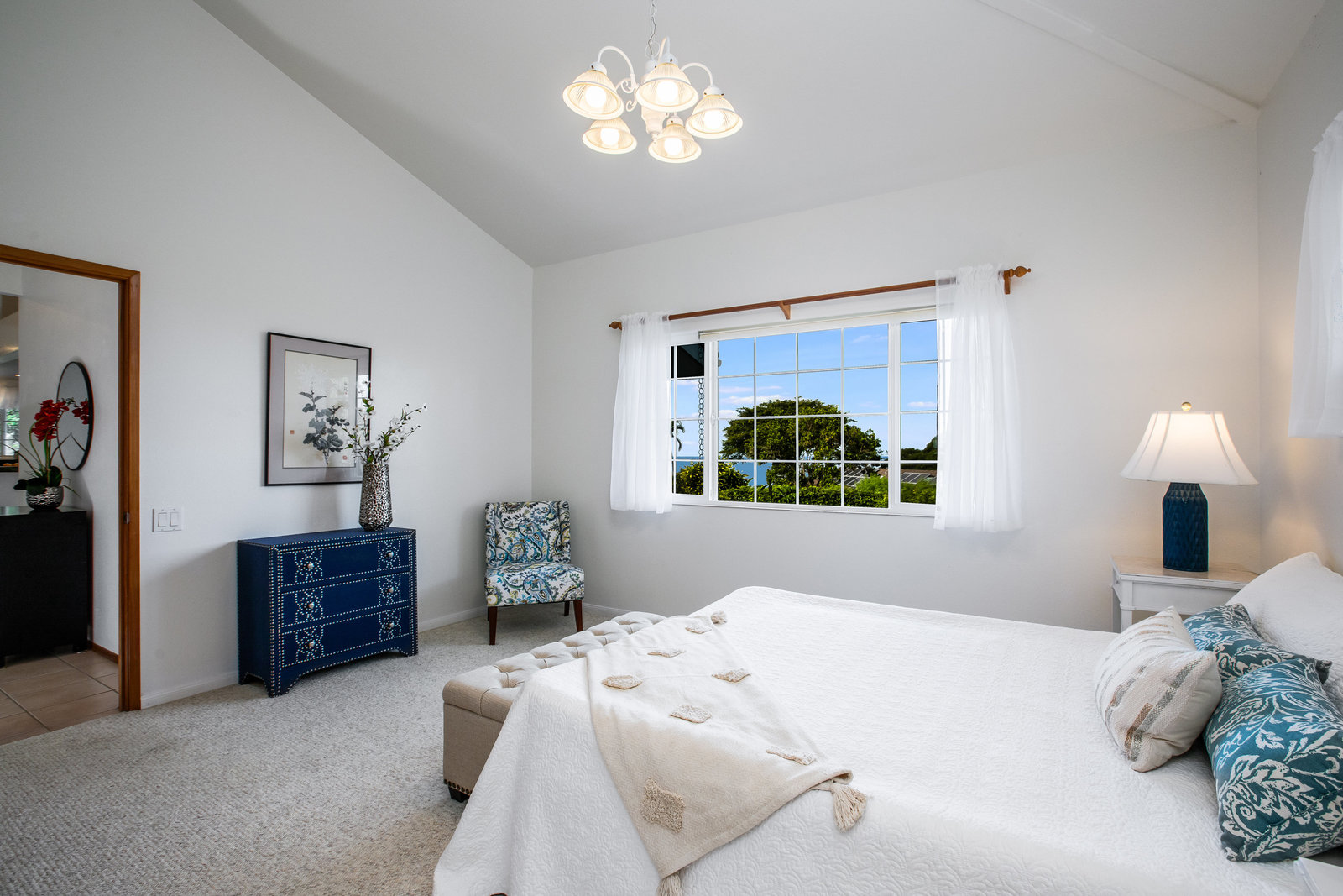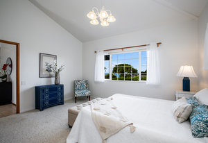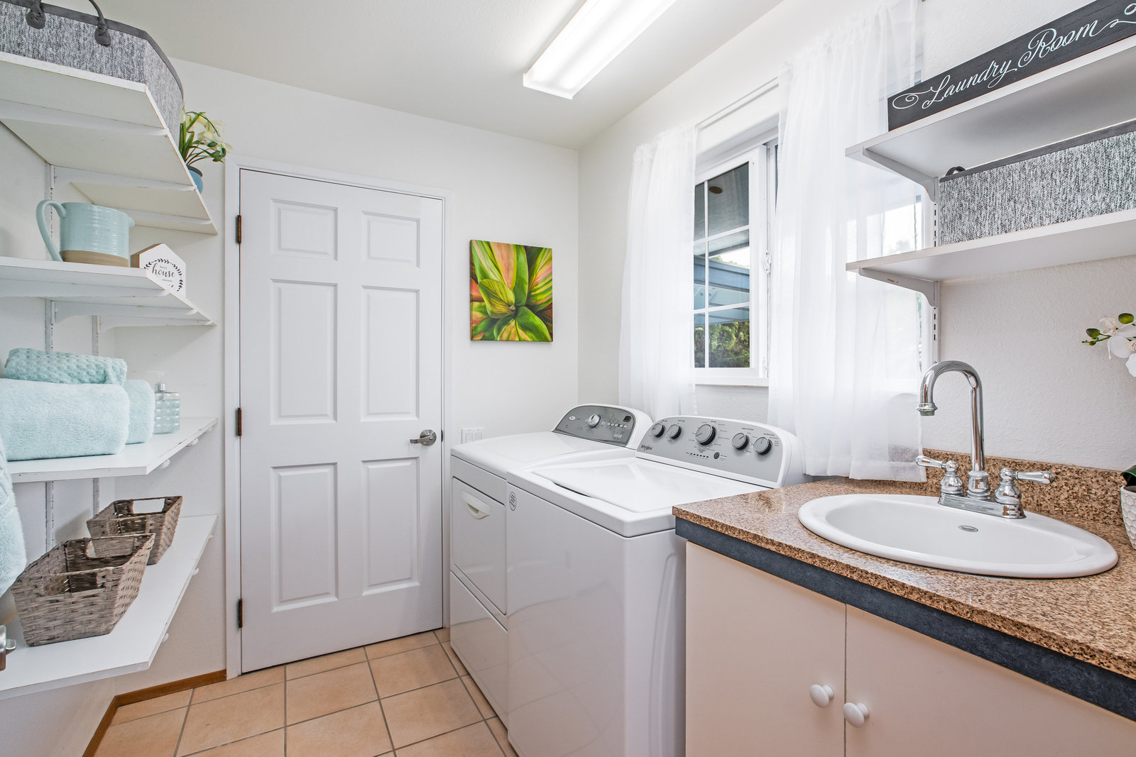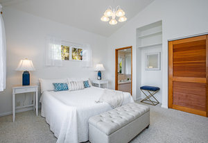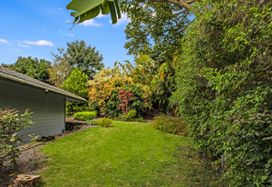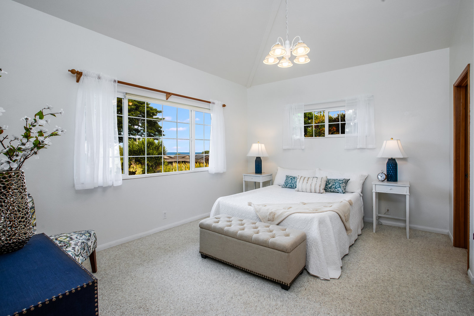 The spacious living area with exposed beam ceiling opens on the ocean side to a sun room with an outdoor lanai. On the mauka side is a screened lanai, shady in the afternoon and overlooking the private backyard. Tiled throughout, except in the 2 bedrooms with a Jack & Jill bathroom in between. Through the kitchen is a butler pantry leading to a sewing room (or office area) off the laundry room. The 3rd bedroom, with optional direct outside access and a vanity sink, was previously used as a home office.