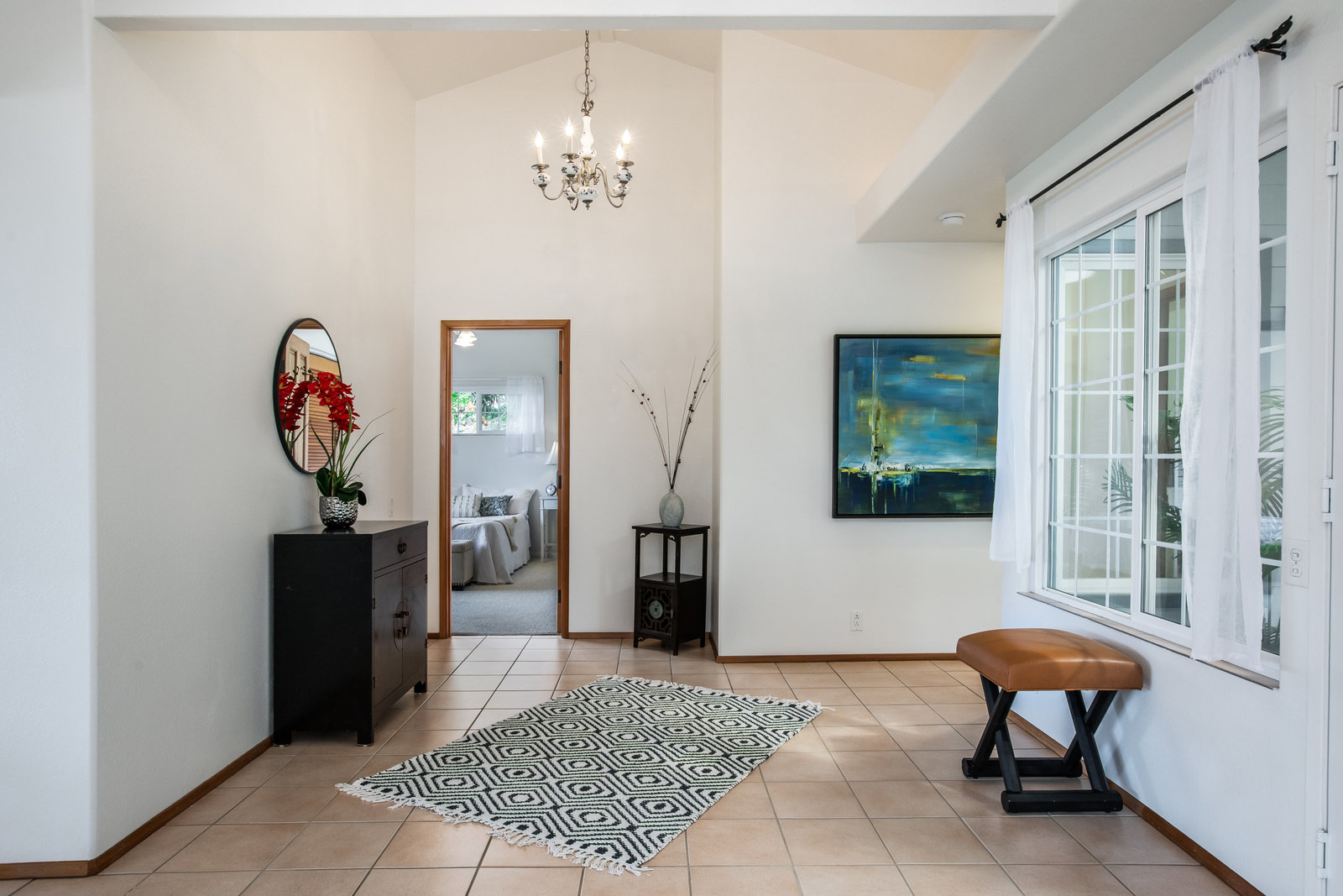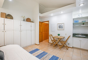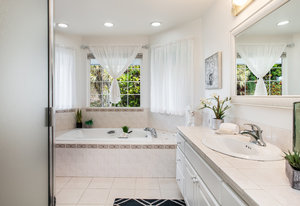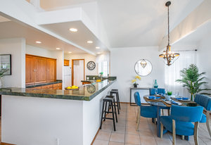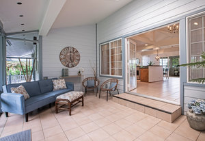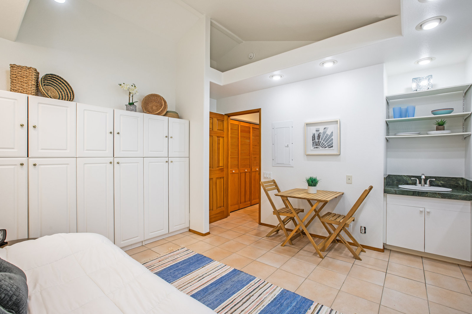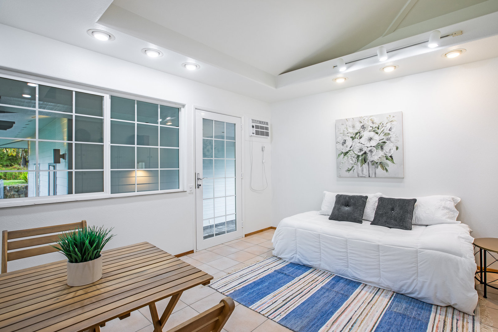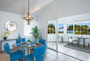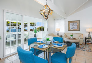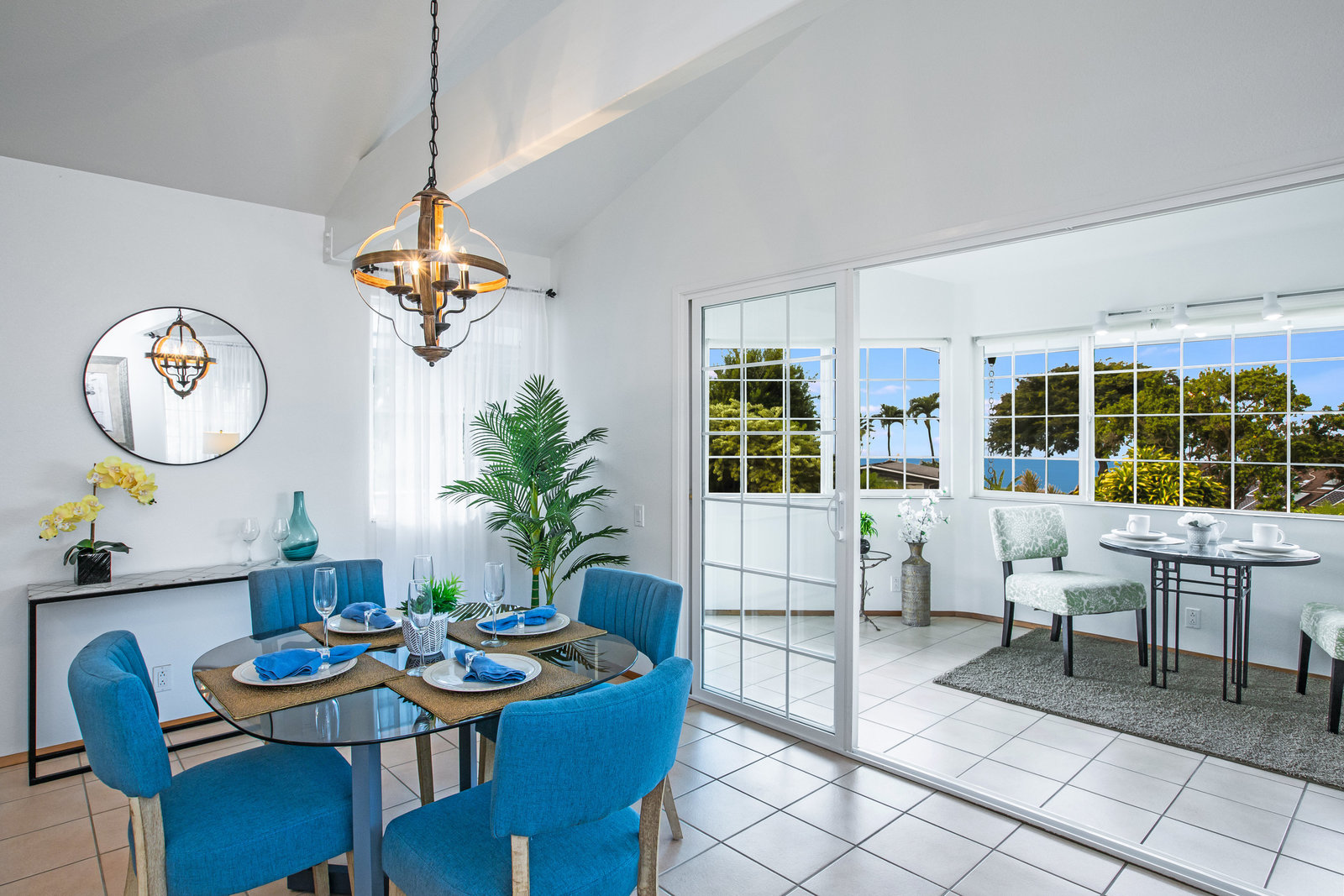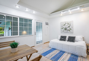 The spacious living area with exposed beam ceiling opens on the ocean side to a sun room with an outdoor lanai. On the mauka side is a screened lanai, shady in the afternoon and overlooking the private backyard. Tiled throughout, except in the 2 bedrooms with a Jack & Jill bathroom in between. Through the kitchen is a butler pantry leading to a sewing room (or office area) off the laundry room. The 3rd bedroom, with optional direct outside access and a vanity sink, was previously used as a home office.