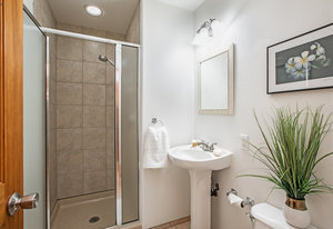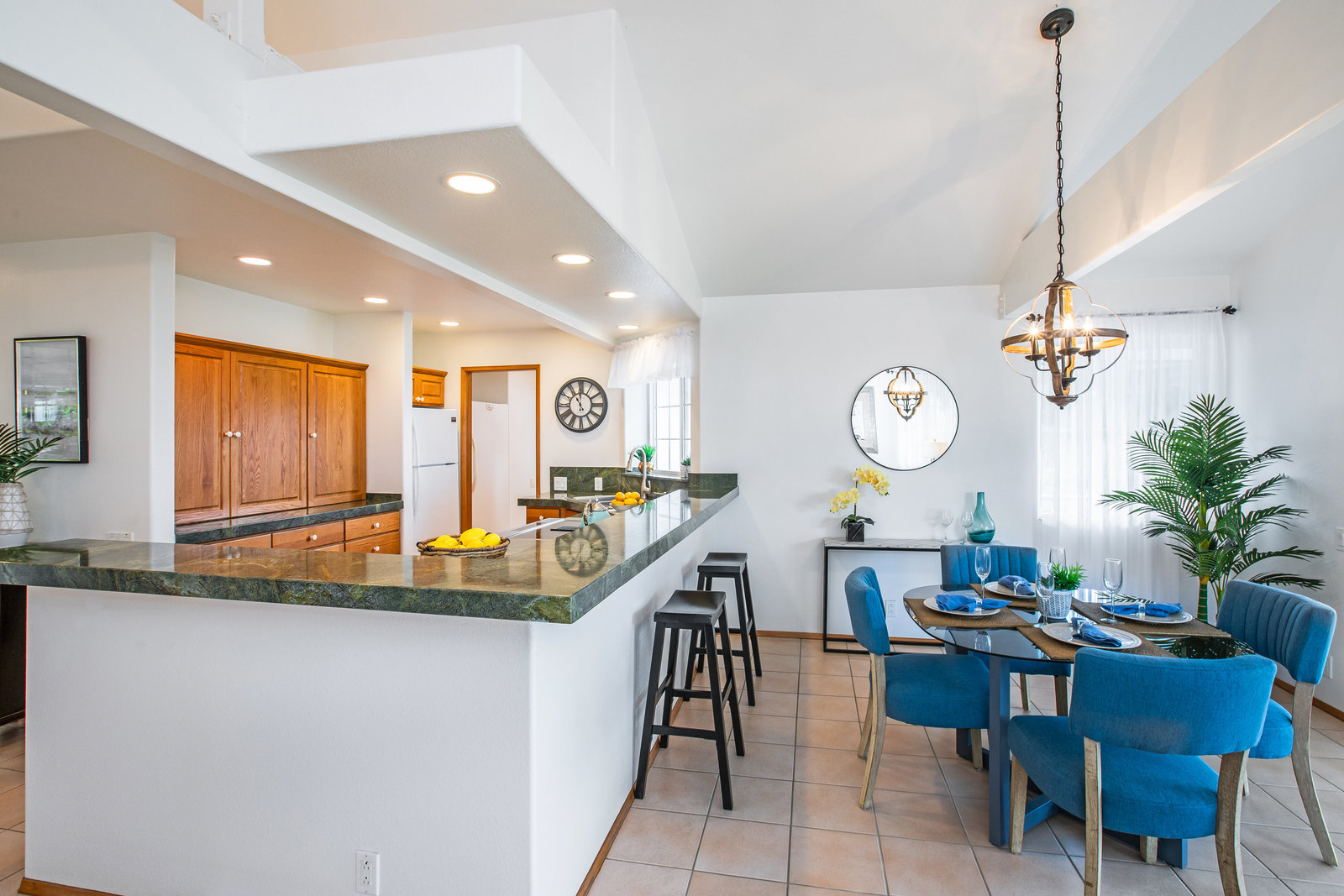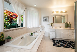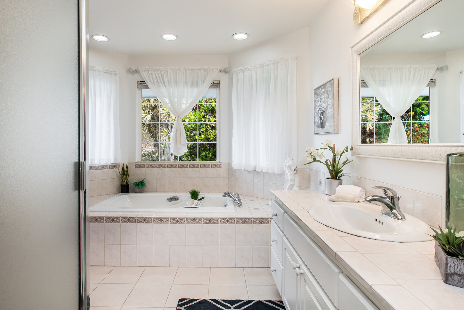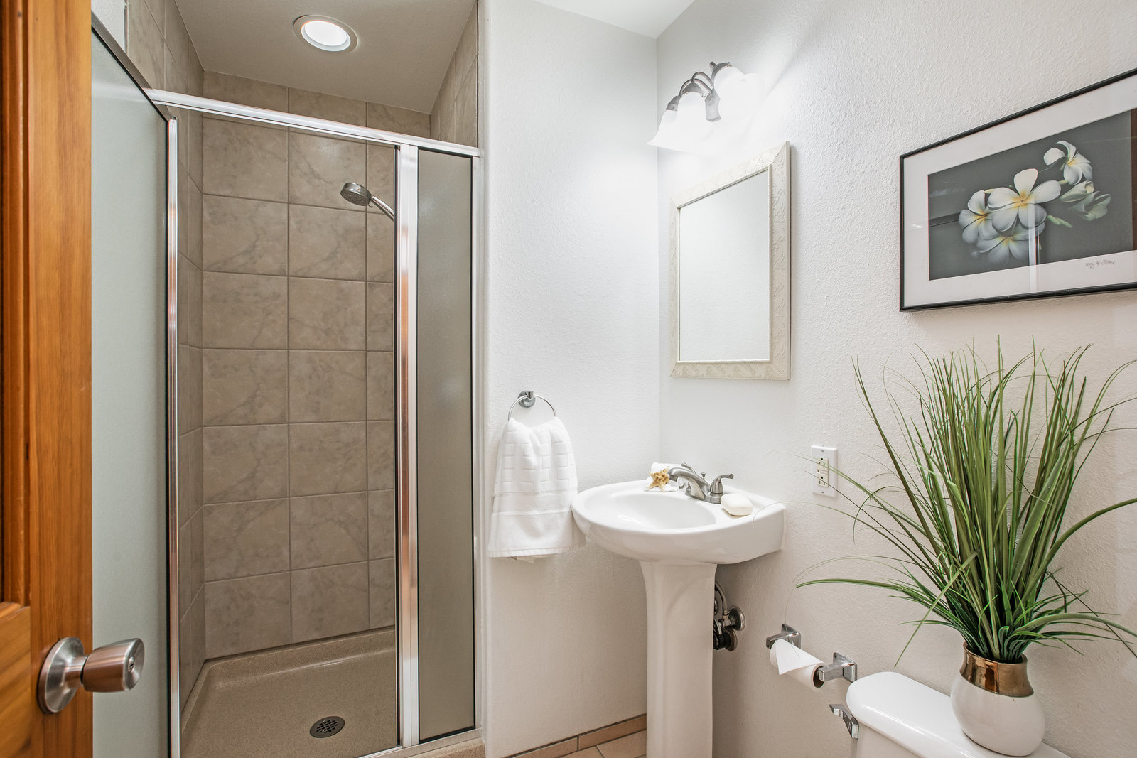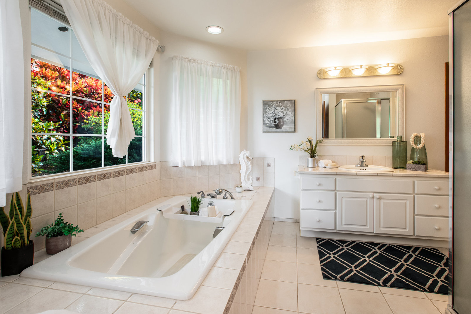 The spacious living area with exposed beam ceiling opens on the ocean side to a sun room with an outdoor lanai. On the mauka side is a screened lanai, shady in the afternoon and overlooking the private backyard. Tiled throughout, except in the 2 bedrooms with a Jack & Jill bathroom in between. Through the kitchen is a butler pantry leading to a sewing room (or office area) off the laundry room. The 3rd bedroom, with optional direct outside access and a vanity sink, was previously used as a home office.