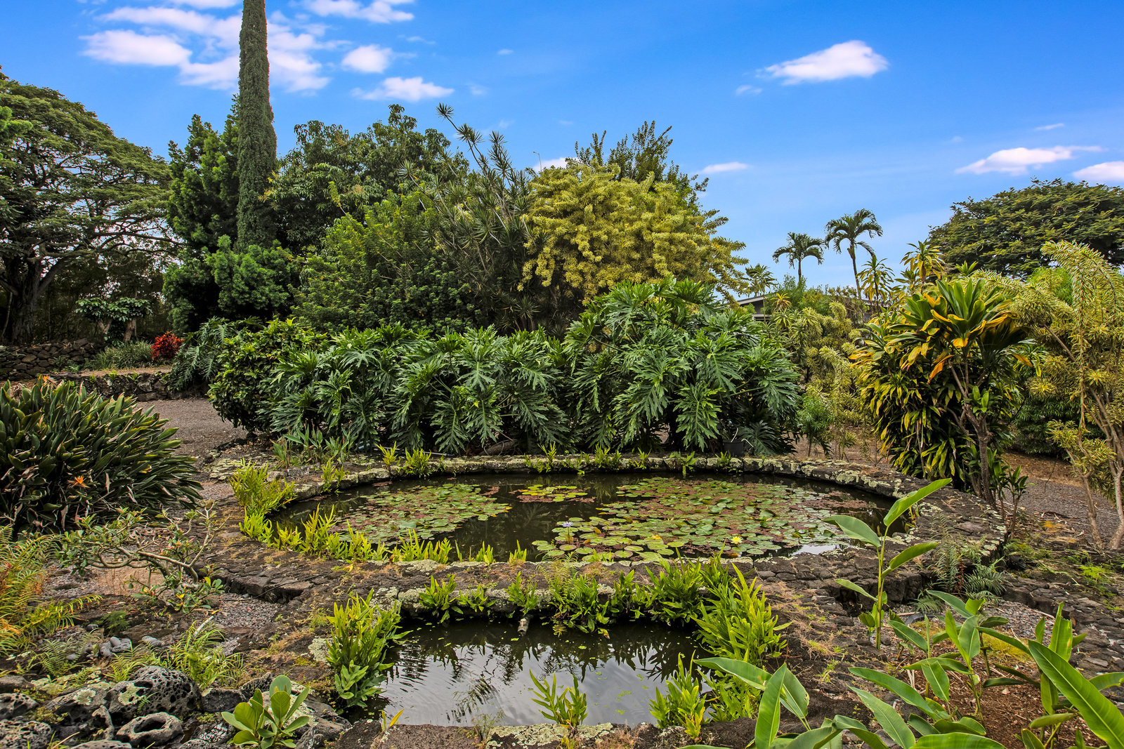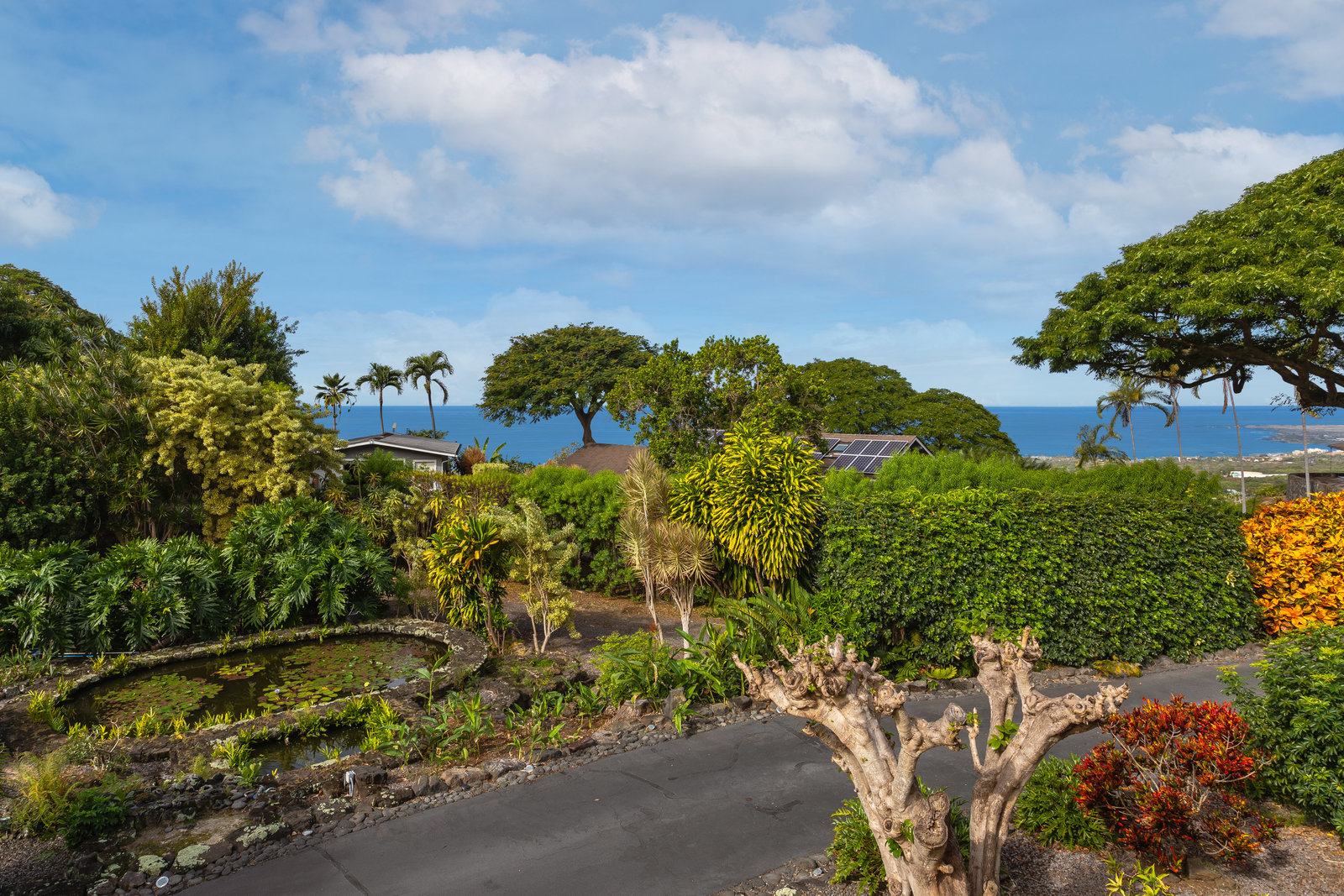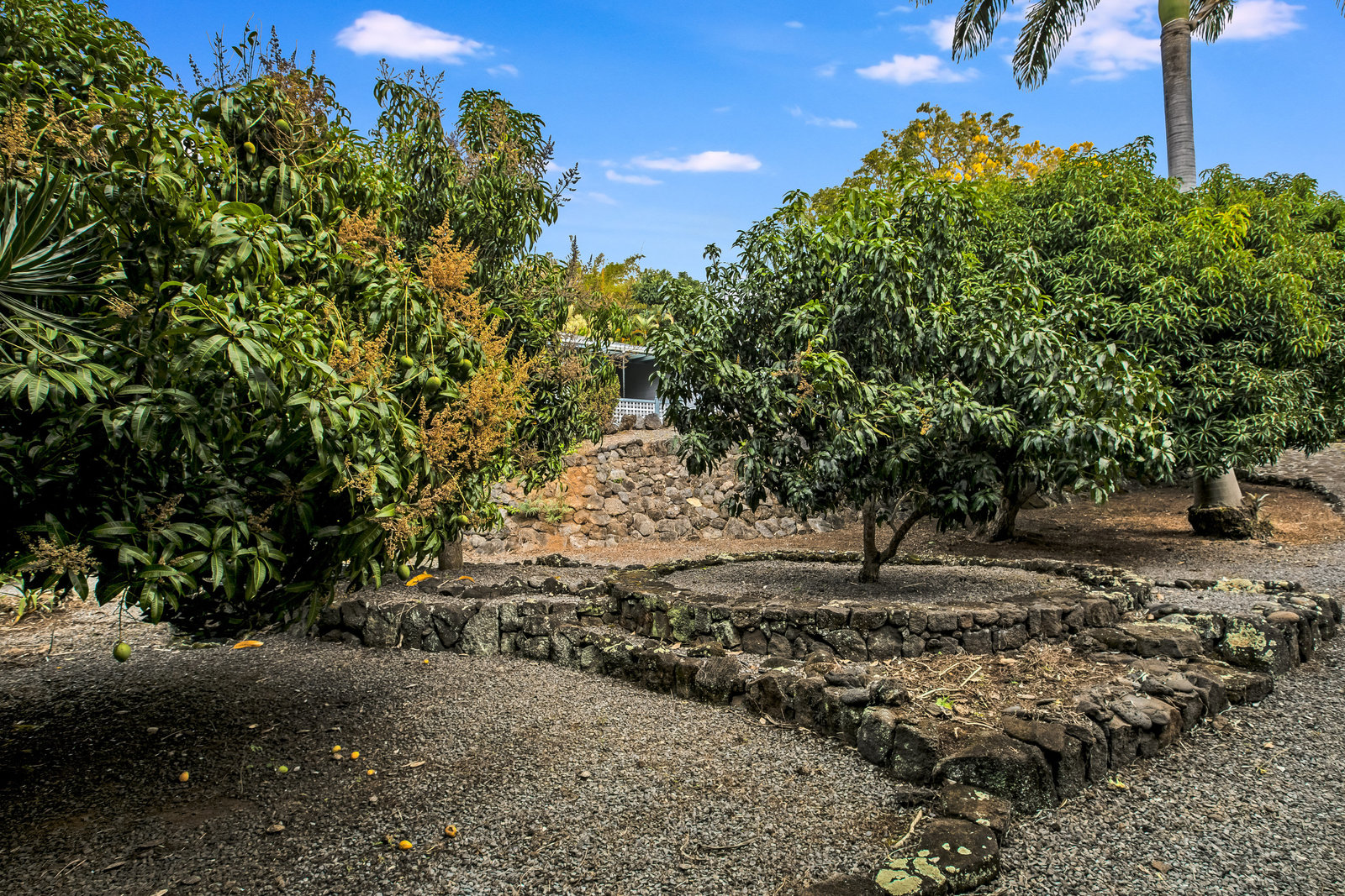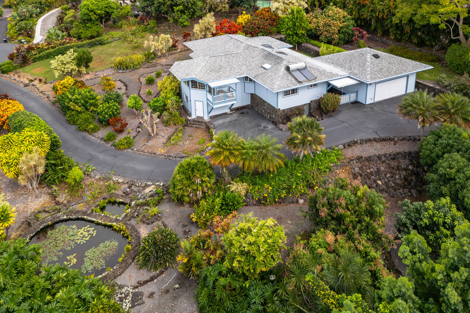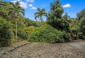 From the end of the paved driveway running up alongside the house and garage, a gravel driveway circles down back around past the lily pond, through the mango trees, colorful flowers and exotic plants.