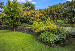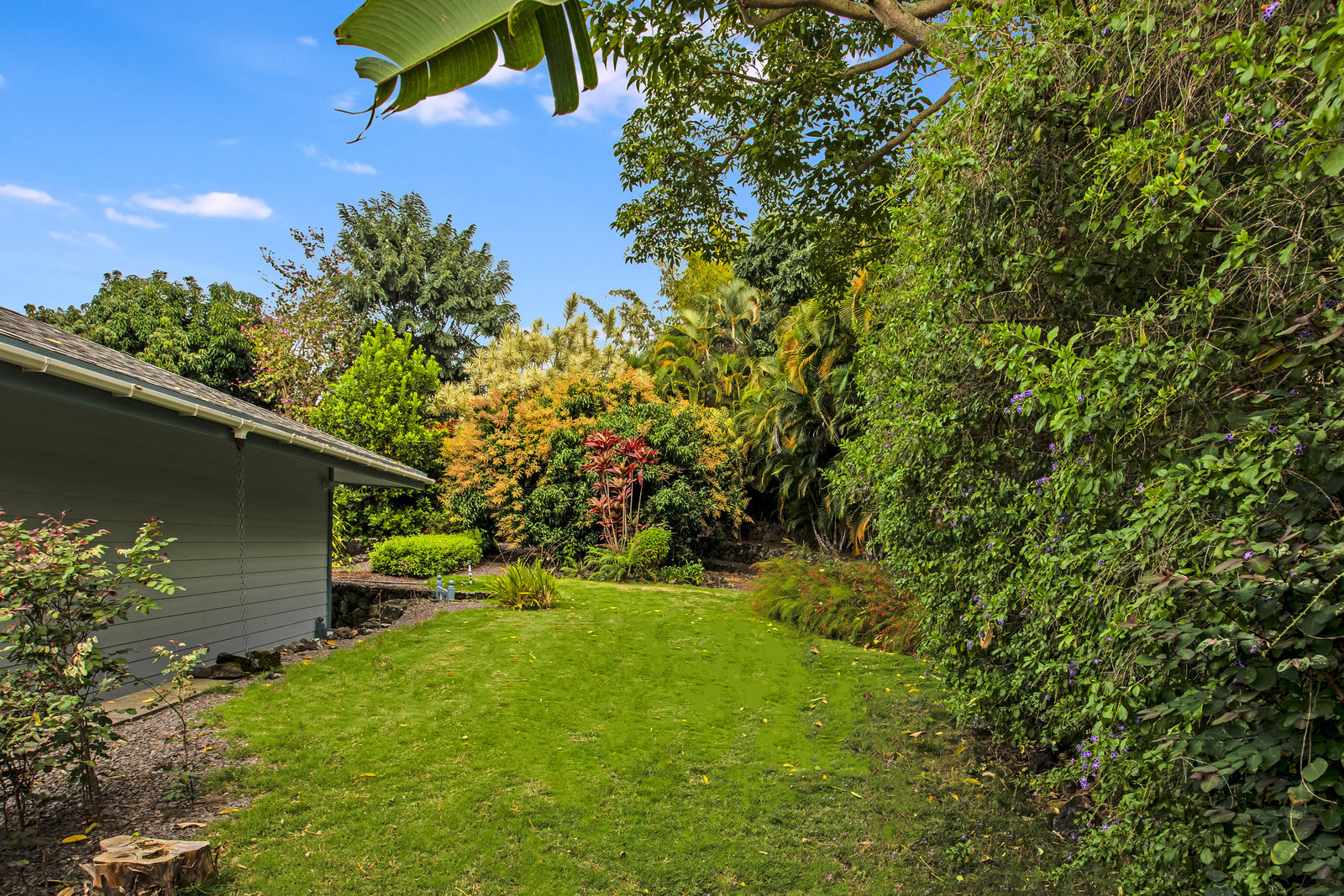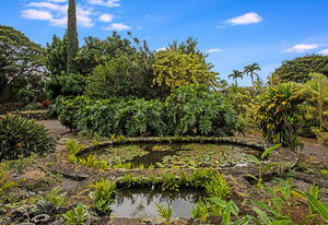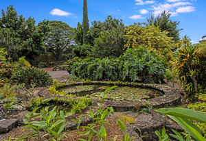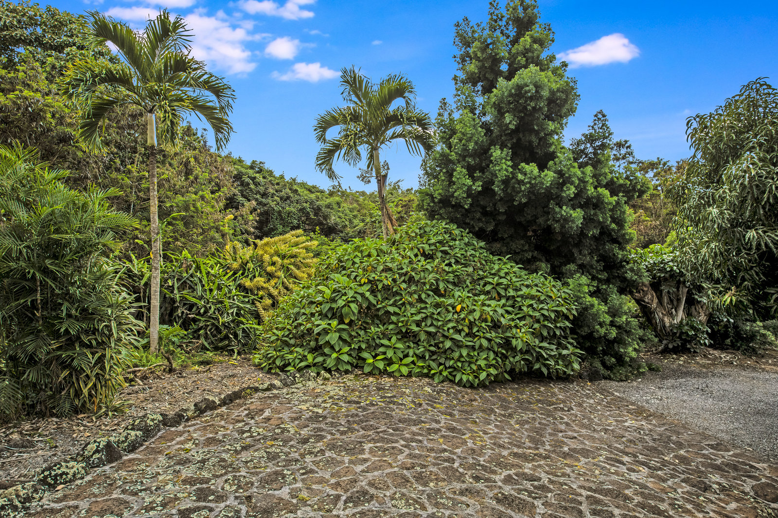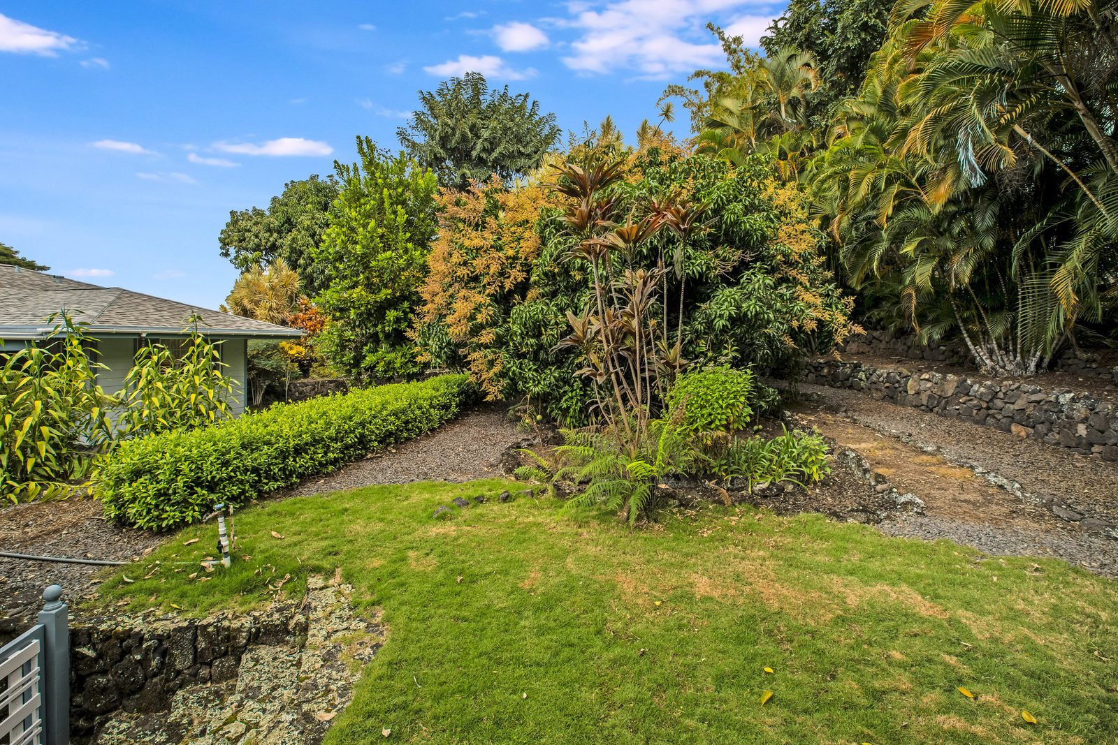 From the end of the paved driveway running up alongside the house and garage, a gravel driveway circles down back around past the lily pond, through the mango trees, colorful flowers and exotic plants.
