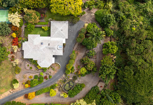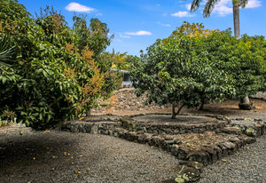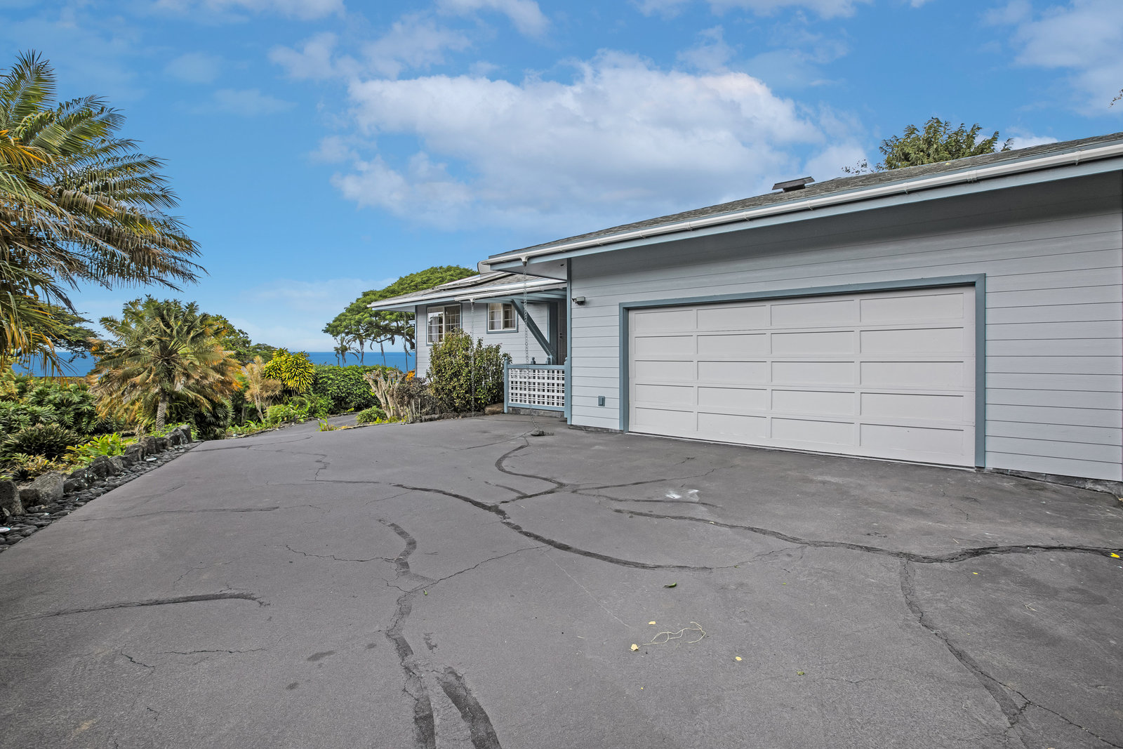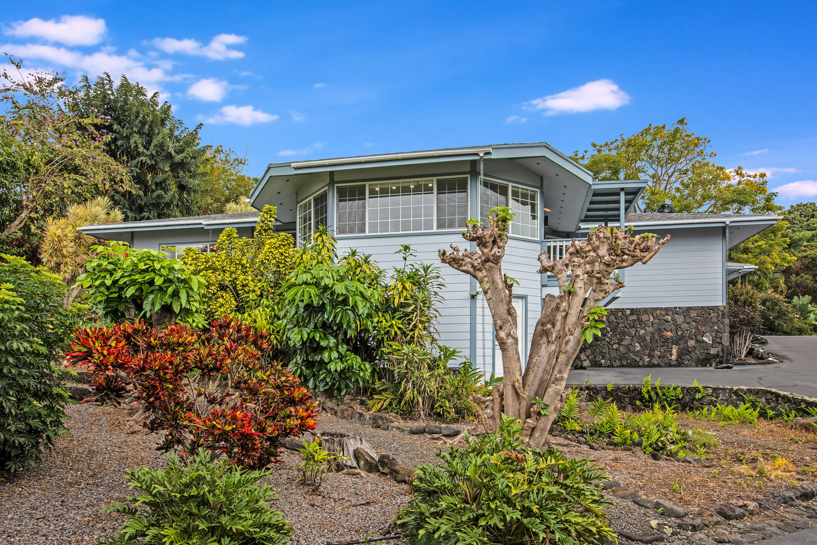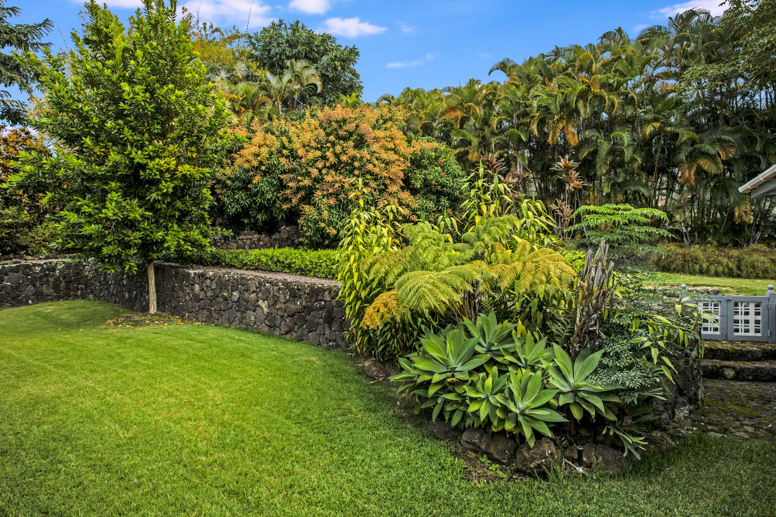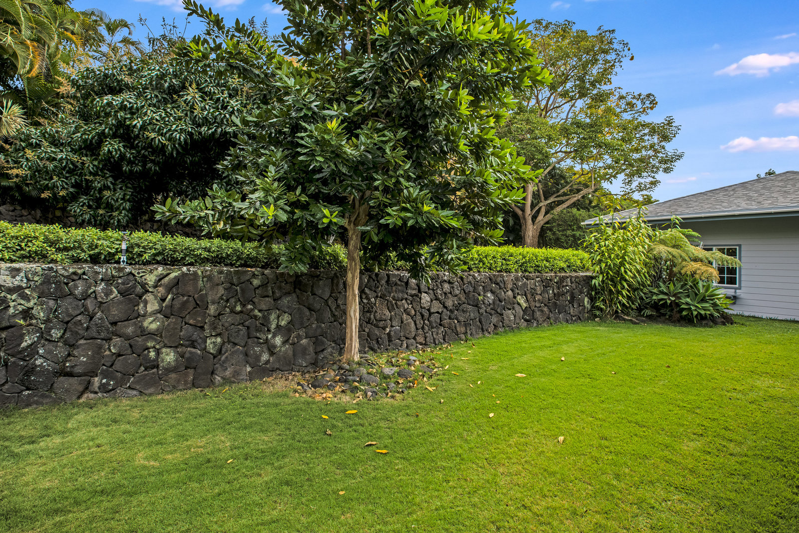 From the end of the paved driveway running up alongside the house and garage, a gravel driveway circles down back around past the lily pond, through the mango trees, colorful flowers and exotic plants.