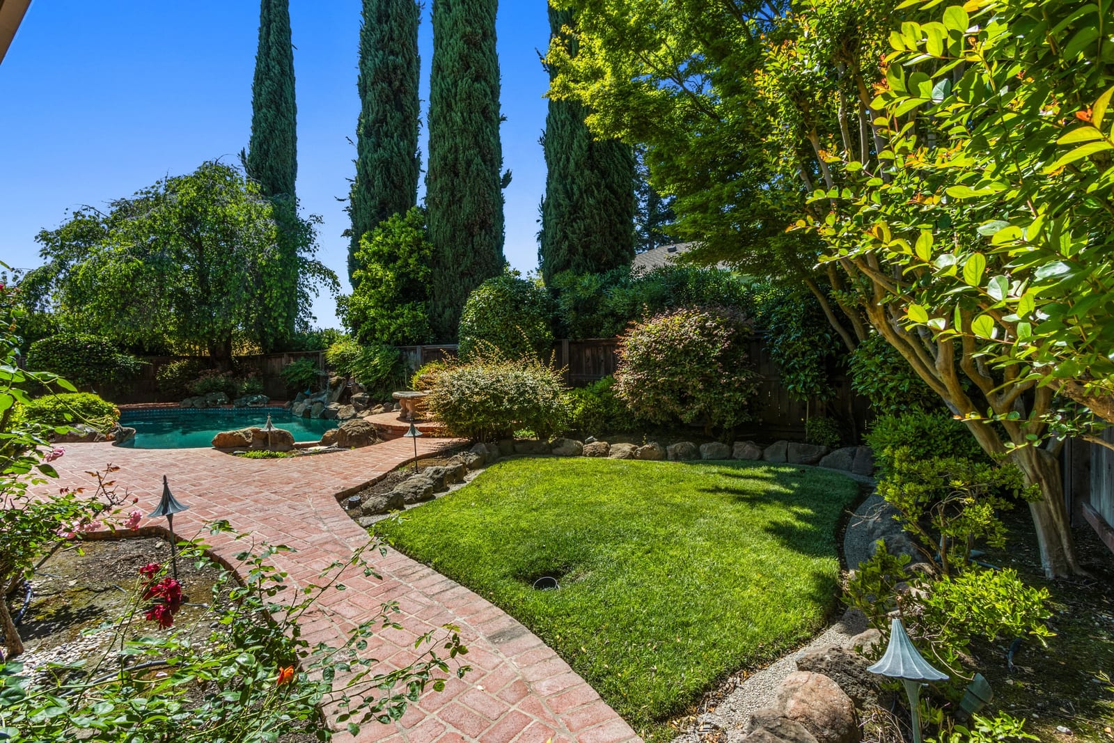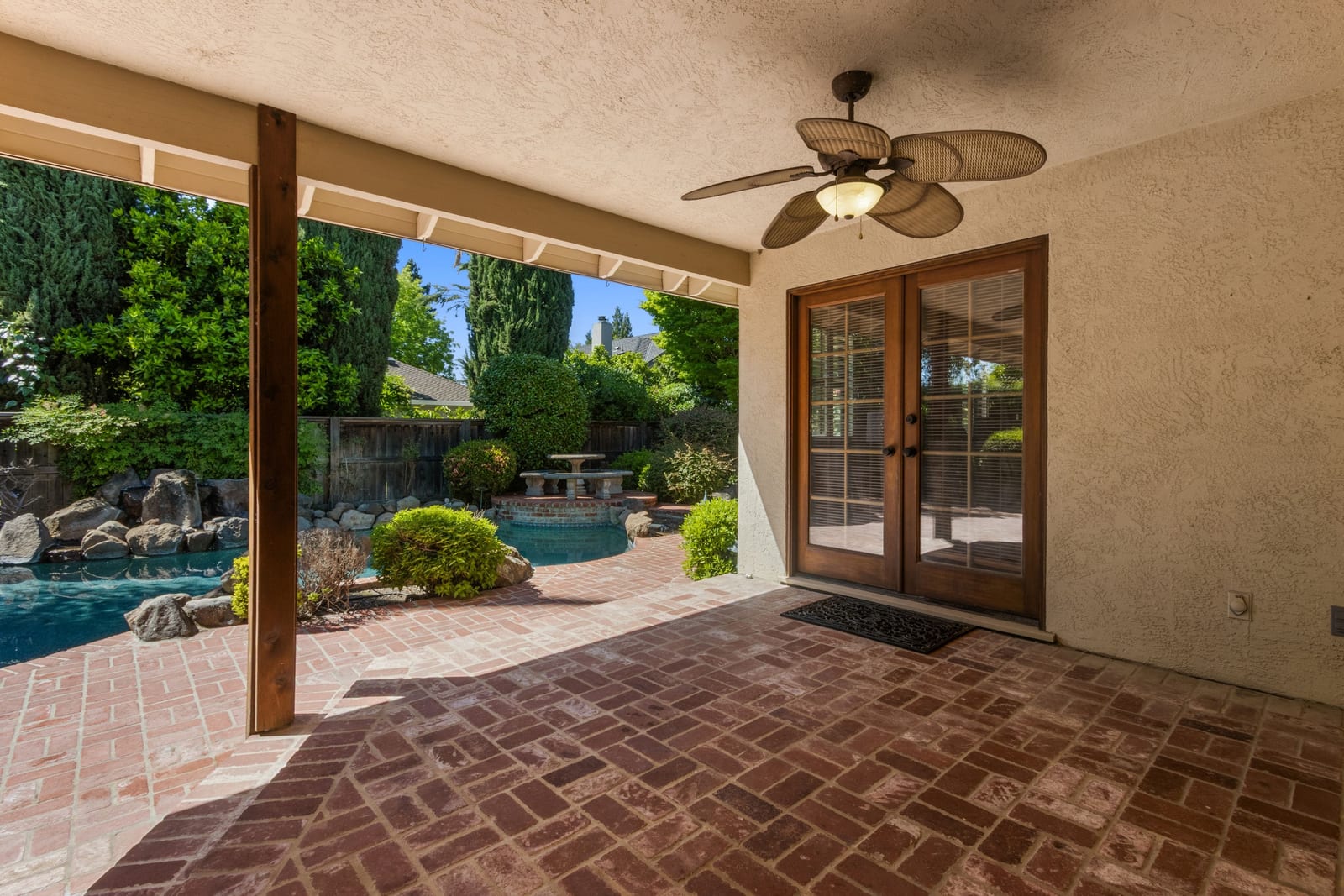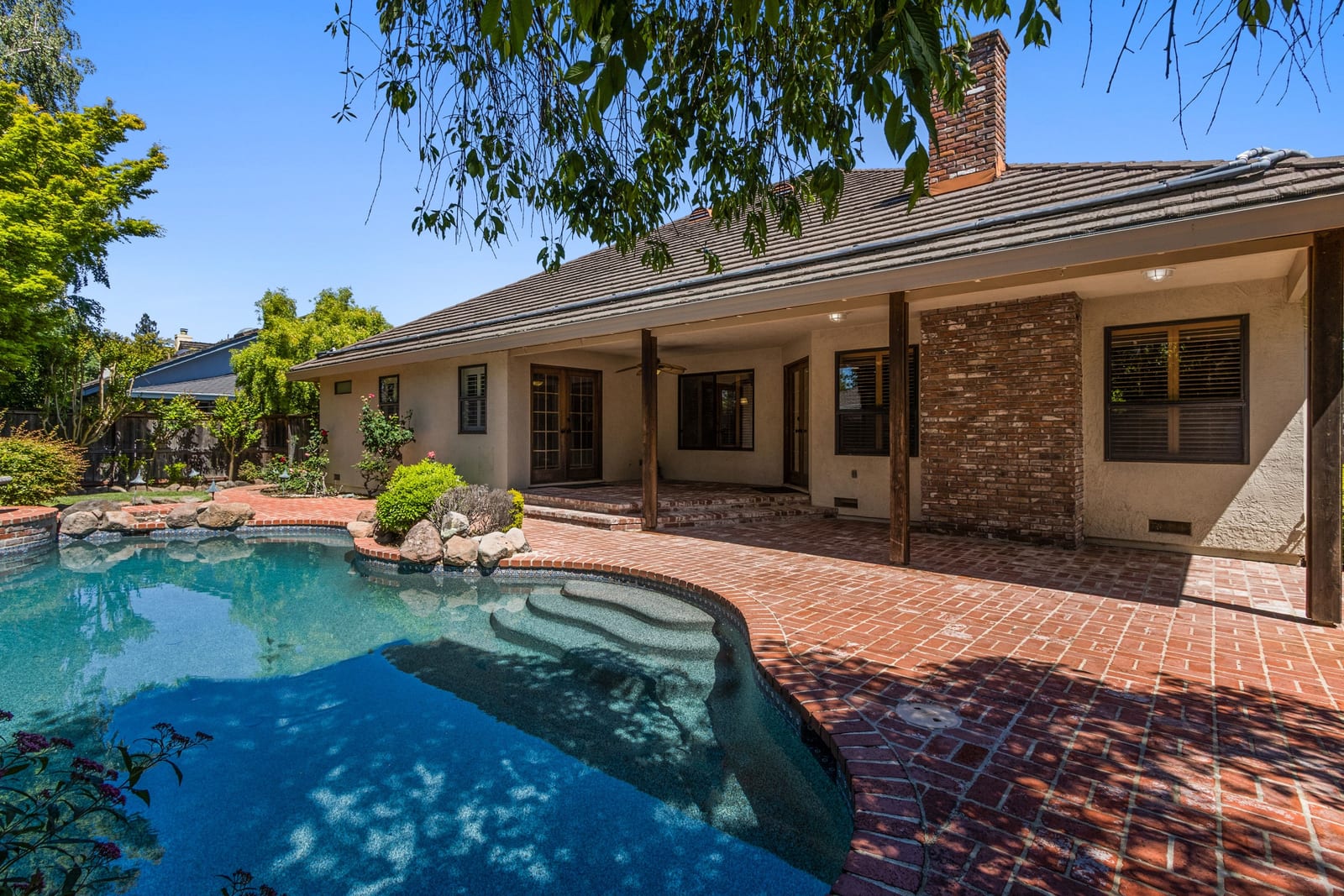 Nestled in the heart of the coveted Pocket Area, 7720 S Oak Way is a custom gem that combines timeless charm with everyday convenience. Perfectly positioned on a corner lot directly across from the Sacramento River Levee, this home offers not just a place to live, but a lifestyle to love. From the moment you arrive, you'll be greeted by meticulously maintained landscaping and inviting curb appeal, that sets the tone for what’s inside. Step through the front door and into a thoughtfully designed interior featuring separate living and dining rooms, graceful arched doorways, and gleaming hardwood floors. The family room is the heart of the home, with its soaring vaulted ceilings, exposed beams, and a striking floor-to-ceiling brick fireplace. A wet bar and patio access make it the ideal spot to entertain or unwind. The u-shaped kitchen is both functional and stylish, offering rich wood cabinetry, a dining bar, a cozy breakfast nook, and plenty of storage to keep everything organized. With 3 spacious bedrooms and 2.5 bathrooms, this home is designed for both comfort and practicality. The Primary Suite is a true retreat, featuring private backyard access, dual walk-in closets, a double vanity, and a roomy walk-in shower. An interior laundry room with a sink, extra storage, and backyard access adds to the home's thoughtful amenities, but the real magic happens outdoors. The backyard is your own private oasis, complete with a sparkling pool with rock waterfall, brick patios (both covered and uncovered), a lush lawn, and mature landscaping that provides beauty and privacy. It’s the perfect setting for summer barbecues, morning coffee, or simply soaking in the tranquility of your surroundings. Rounding out this exceptional property is a two-car garage and a prime location just minutes to parks, dining, and easy freeway access.