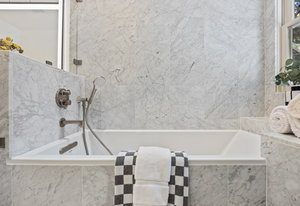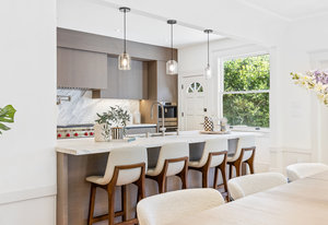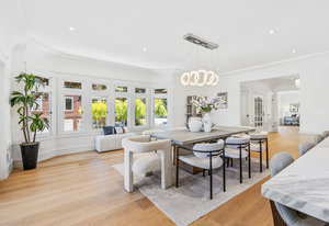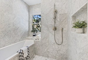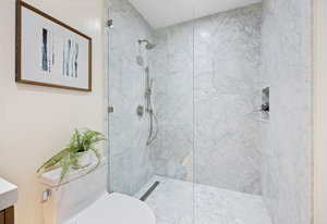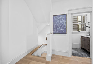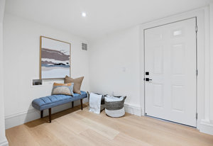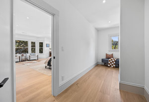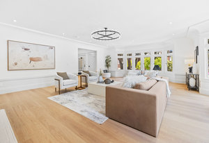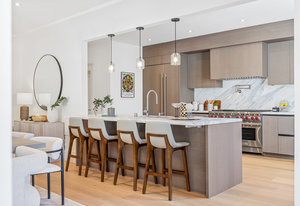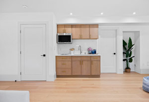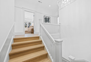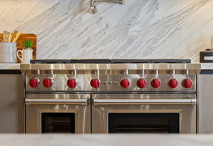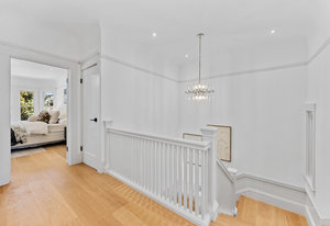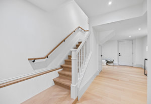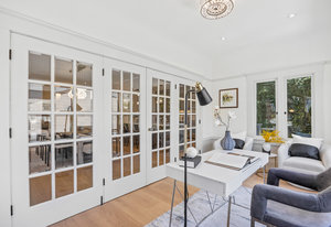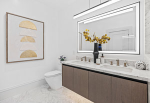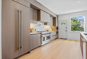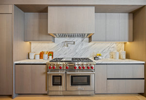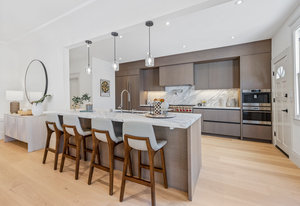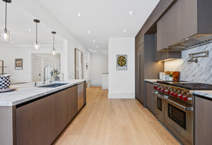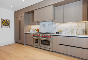 The open-concept dining room flows seamlessly into a spectacular chef’s kitchen, appointed with Italian marble countertops and backsplash, custom built-in cabinetry with pull-out shelving, and a full suite of best-in-class luxury Wolf and Sub-Zero appliances, including a 6-burner stove with griddle, pot filler, microwave, and built-in coffee maker for your custom lattes and espressos. A sun-drenched adjoining room with French doors is the perfect setting for a breakfast nook, home office, or indoor garden retreat. A stylish powder room completes this level.