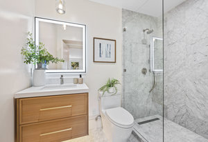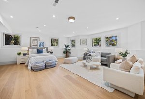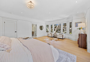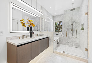 Upstairs, the private quarters include a dedicated furnace system and four spacious bedrooms for optimum comfort. The luxurious primary suite is a sanctuary of tranquility, featuring bay windows, an expansive wall-length walk-in closet, and a breathtaking spa-inspired tiled bath. Enjoy a walk-in rainfall shower, built-in soaking tub, and dual vanities with anti-fog LED mirrors. A junior suite offers an attached lounge with stunning neighborhood views, while two additional bedrooms and a thoughtfully designed hall bath round out the upper level.