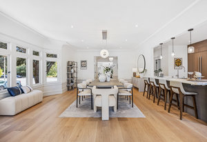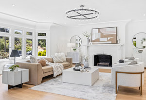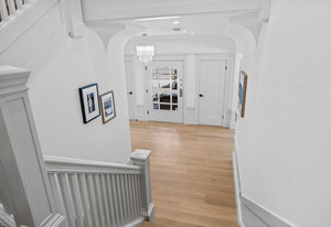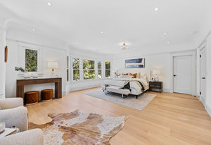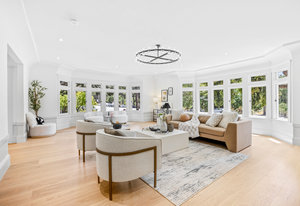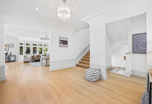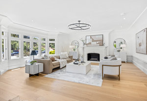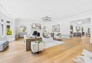Enter into the grand foyer, where soaring ceilings, a statement chandelier, and dual oversized coat closets welcome you into a world of refined living. The expansive living room is flooded with natural light from multiple bay windows, now updated with energy-efficient dual panes while preserving the original wood craftsmanship. A stately gas fireplace with classical flourishes anchors the space, complemented by recessed lighting and elegant detailing throughout.
