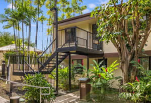 A tropically landscaped walkway leads to a private, 1-story staircase.