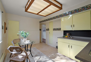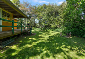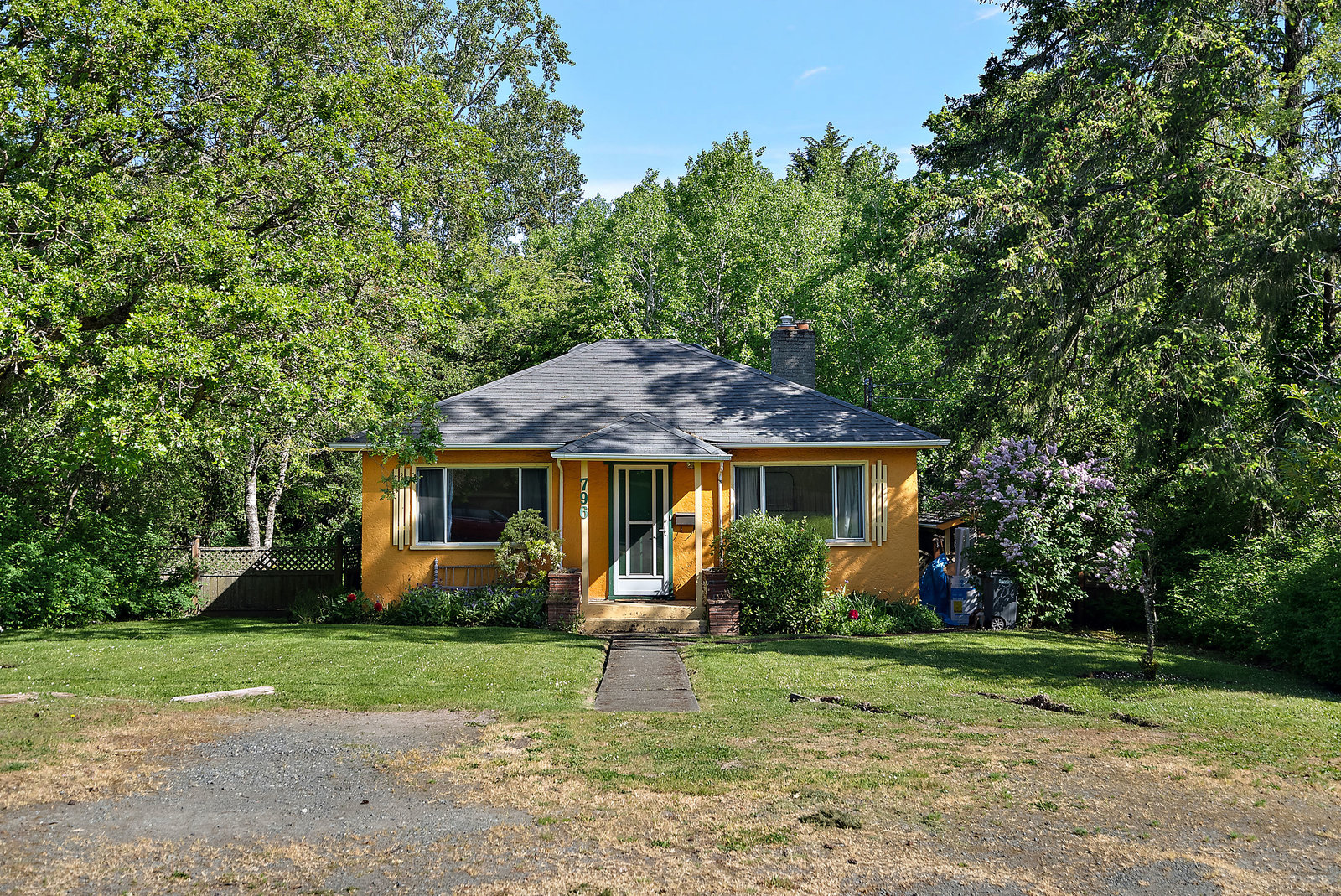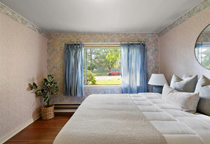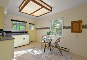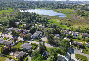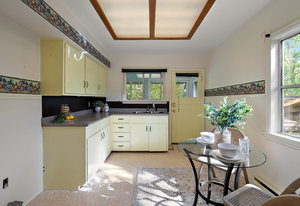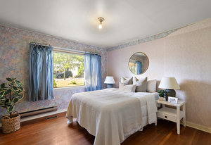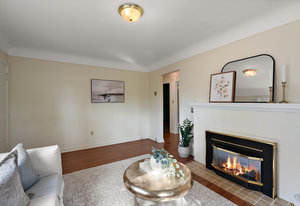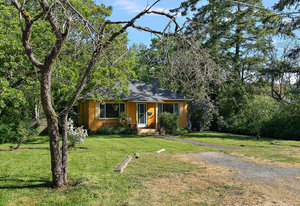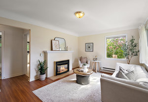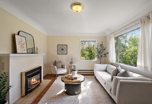 This character rancher offers a cozy living room with gas fireplace and southern exposure, a bright kitchen with eating nook, hardwood floors, and a new roof. Situated on a 10,720 sq.ft. property backing onto Rainbow Park—ideal for families and gardeners—with mature trees providing privacy and seasonal fruit including blackberries, apples, and plums.