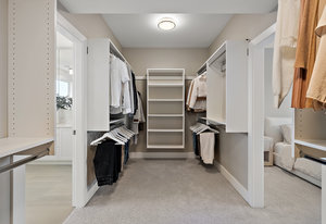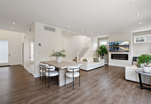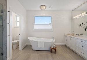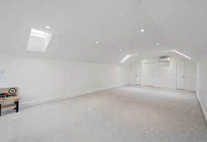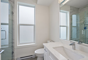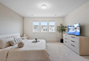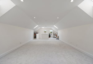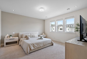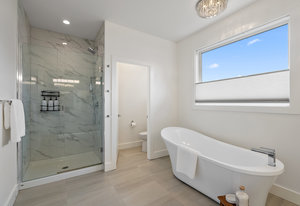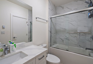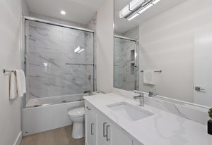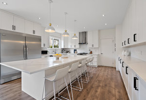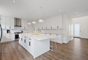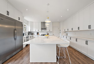 The minimalistic floor plan seamlessly flows between levels, with high ceilings, oversized rooms, and bright open-concept spaces that are perfect for entertaining and everyday living. The kitchen is a culinary dream with beautiful white finishes, wrap-around cabinetry, quartz counters, an oversized island, and high-end appliances, including a gas range and a commercial-size fridge/freezer combo. On the second floor, a spacious landing overlooks the foyer with impressive 20' ceilings. The primary features a walk-in closet and a 5-piece spa-inspired ensuite with a standalone tub, plate-glass rain shower, and double vanity. On the top floor, an additional 40x15’ recreation room is ready for your ideas with a 3-pc bath, skylights, and vaulted ceilings.