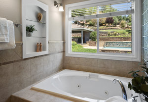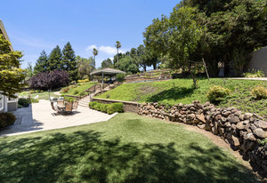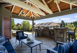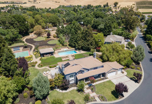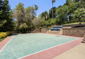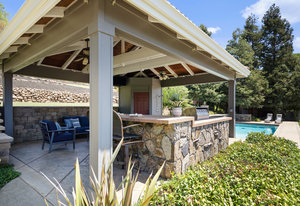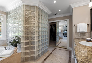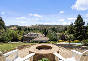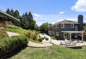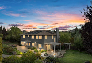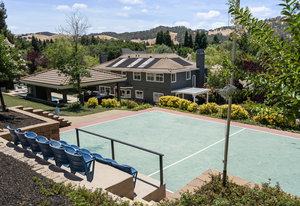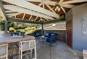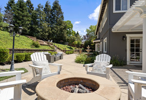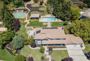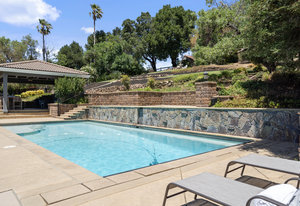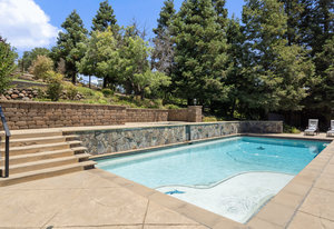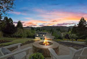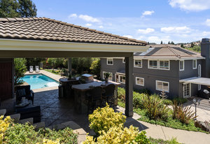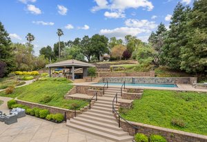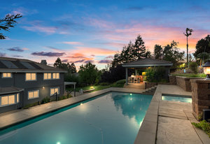 Step outside to your own private oasis—an entertainer’s paradise featuring a sparkling pool, tranquil water features, spa, sport court, stadium-style seating, ambient lighting, fire pits, and a ...