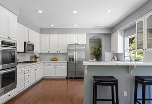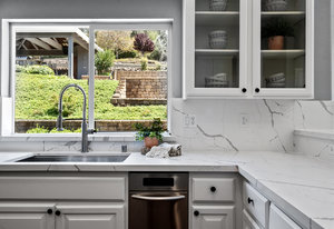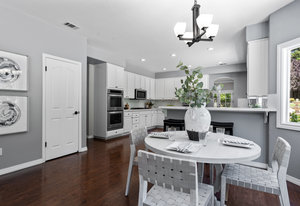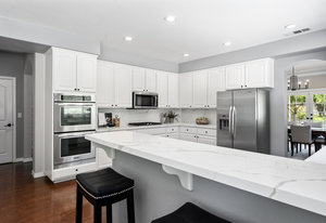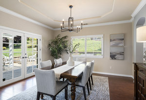 The formal dining room exudes sophistication with crown molding, a tray ceiling, French doors, and a striking new chandelier—ideal for entertaining. The spacious kitchen is a chef’s dream, featuring brand-new quartz countertops, stainless steel appliances, abundant cabinetry, and large windows that flood the space with natural light while offering picturesque views of the backyard and pool—perfect for seamless indoor-outdoor living.