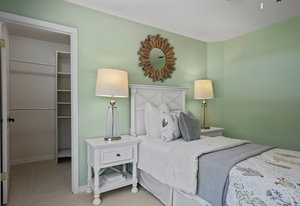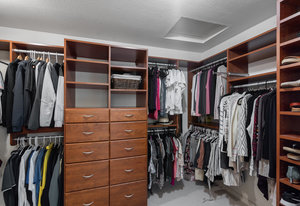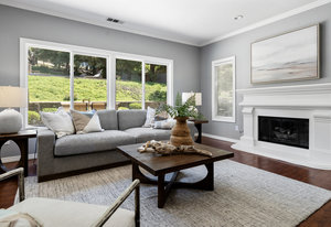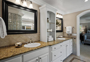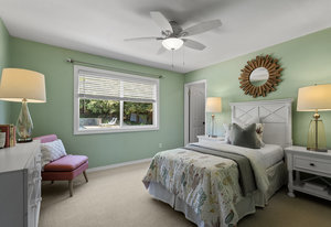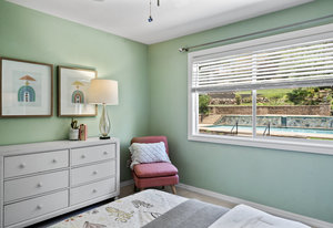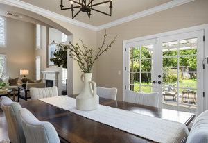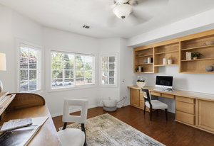 Downstairs, a private office with custom built-ins provides the ideal work-from-home space and can easily serve as a fifth bedroom if needed.