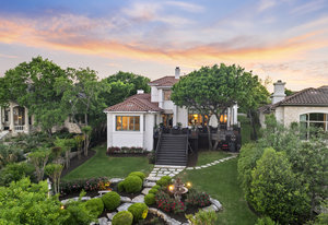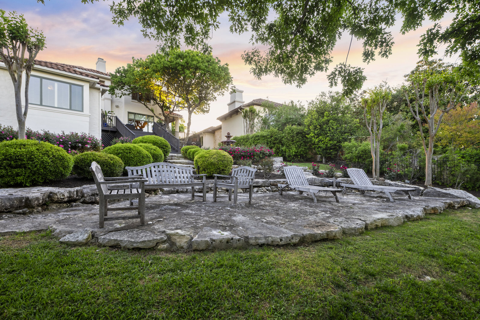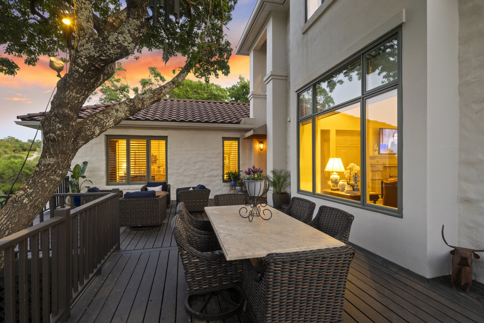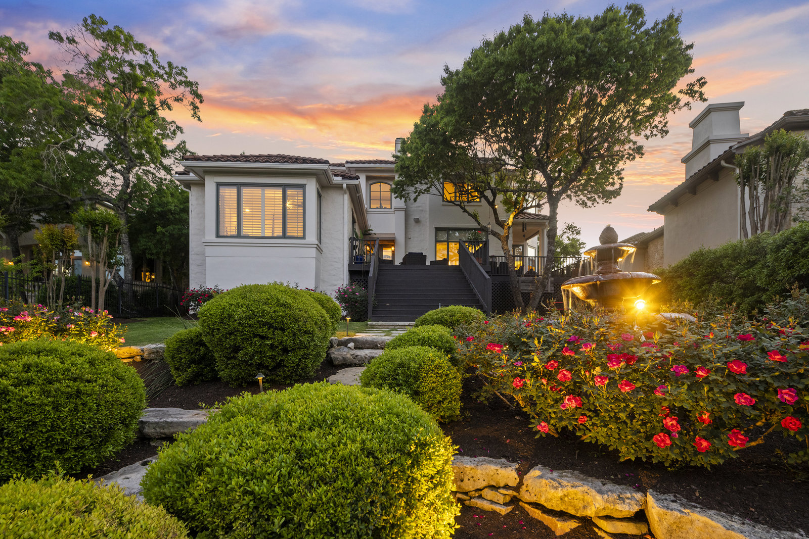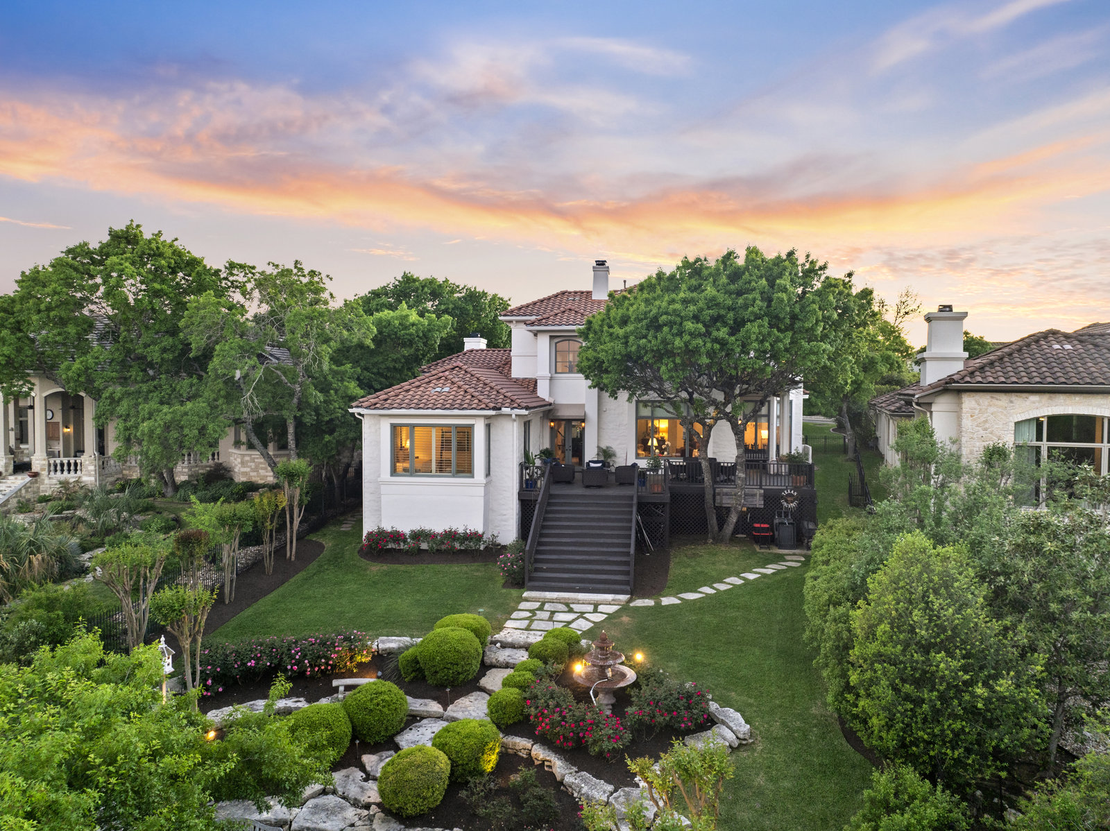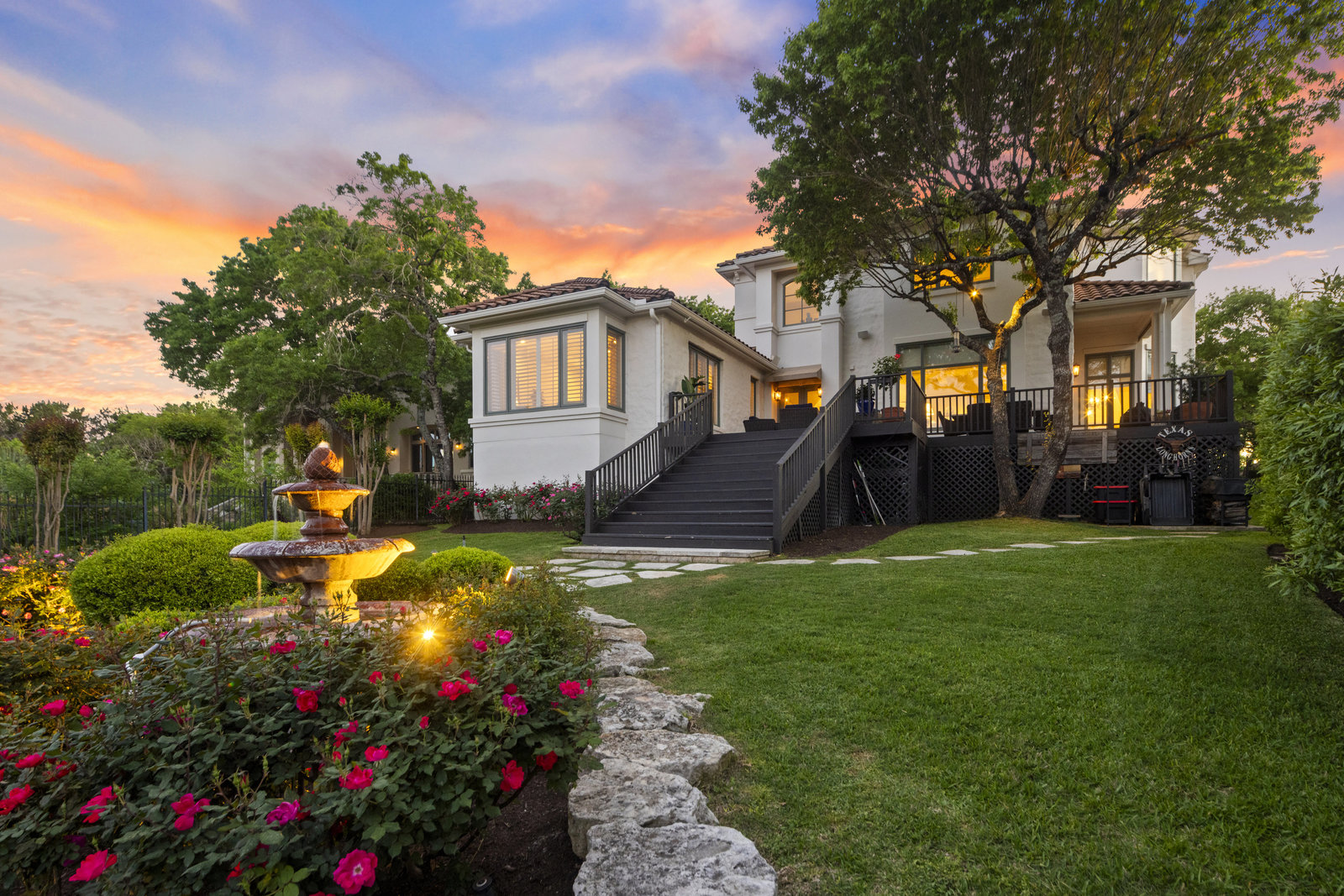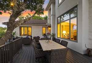 Welcome to 8862 Chalk Knoll Drive, a stunning Santa Barbara Style home built by Heyl Custom Homes. This well-appointed and meticulously maintained residence exudes elegance and luxury. Situated on a generous half acre lot with stunning views, this home is a rare find. Upon entering, you are greeted by a charming courtyard with a wood-burning fireplace, setting the tone for the exquisite features that await. The main level boasts a primary suite with a recently updated bathroom, free-standing tub, and massive closet space. Two separate living areas adorned with large windows and grand fireplaces create a warm and inviting atmosphere. The formal dining room provides an ideal setting for hosting gatherings, while the spacious gourmet kitchen with a breakfast area is a culinary haven, featuring a 48-inch gas range, beverage fridge, wine bar, and butler's pantry. Upstairs, a generous game room and three additional bedrooms, along with two baths, offer ample space for relaxation and privacy. Throughout the home, elegant hand scraped European White Oak wood floors and Canterra Stone floors lend a rustic yet sophisticated touch, creating a seamless flow between the living spaces. The outdoor area is a true highlight, with a sprawling 1100 square foot deck that provides the perfect setting for entertaining and savoring the breathtaking hill country views. The east-facing backyard ensures a delightful ambiance, while the terraced yard, professionally landscaped and backing a greenbelt, enhances the sense of tranquility and natural beauty. One of the closest neighborhoods to Barton Creek Country Club, members have access to golf, tennis courts, dining and much more. Two private schools within the neighborhood - St. Gabriel's and St. Michael's and two more, St Andrews High School Campus and Regents School of Austin located down the street. Easy access to major highways (Bee Cave Rd, 360 and SW Parkway) for all of your everyday needs just a few minutes away.