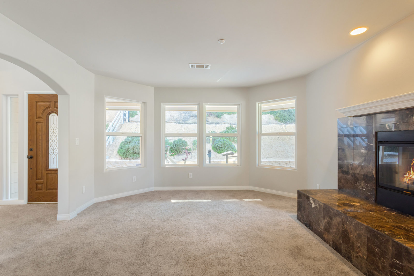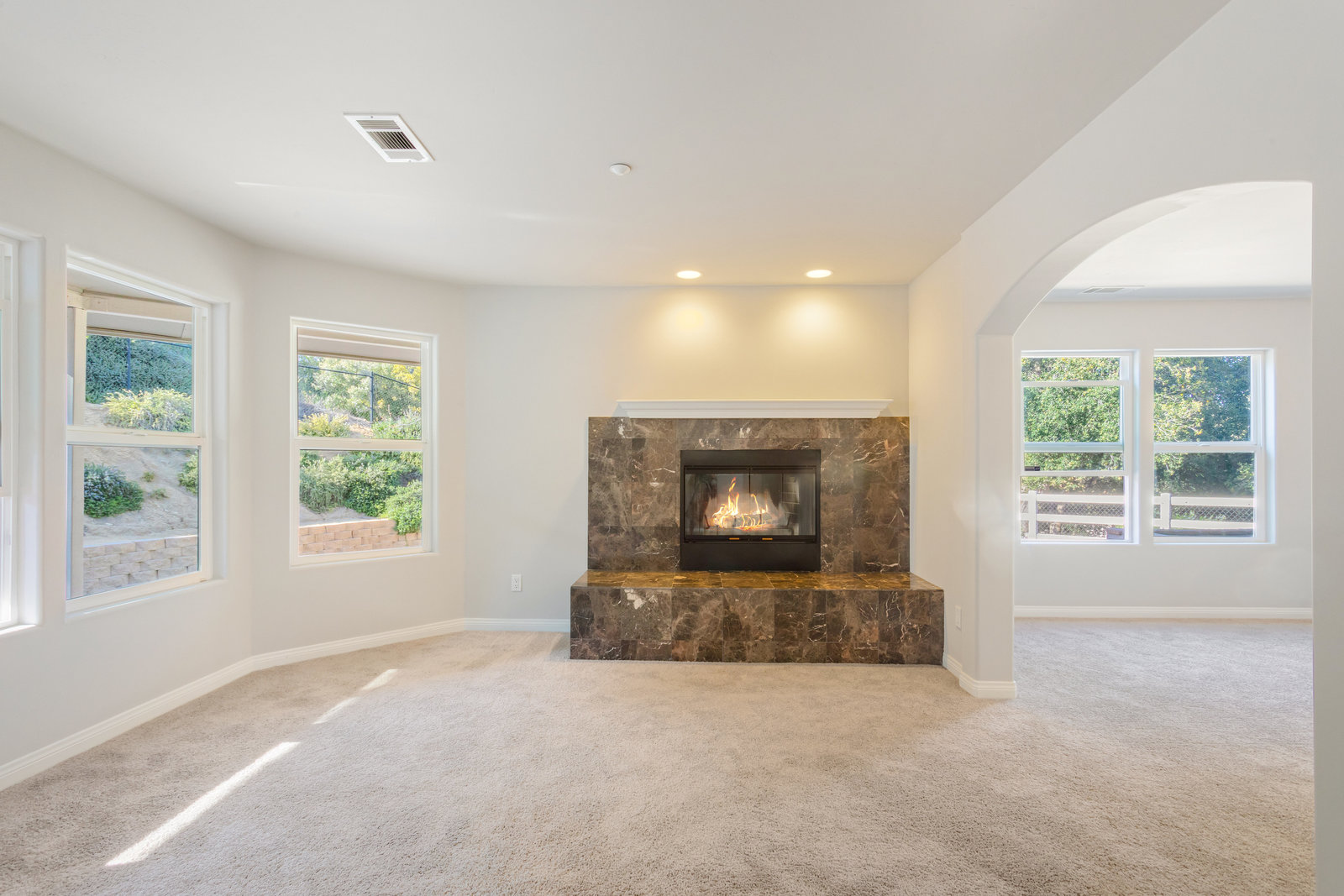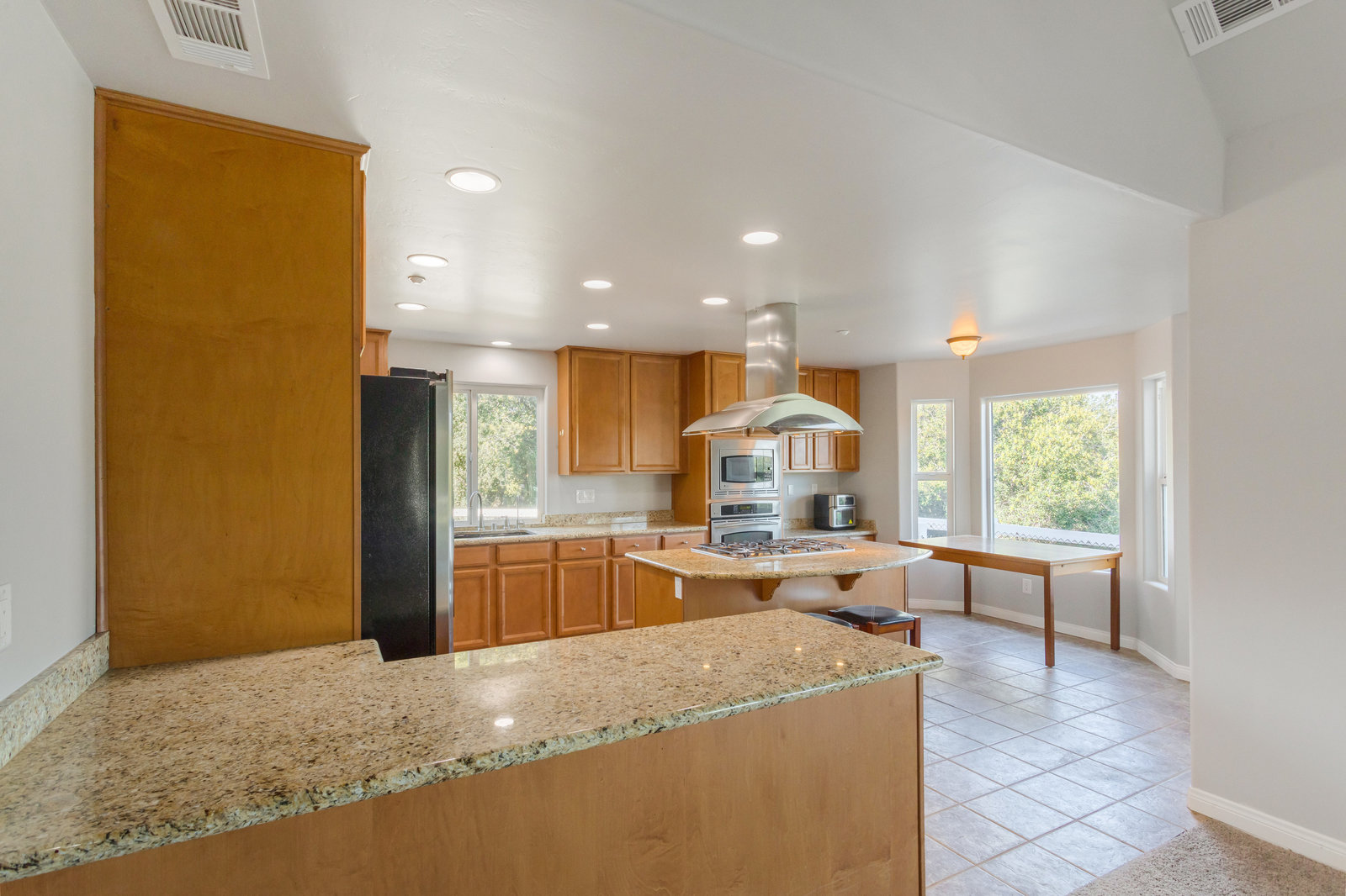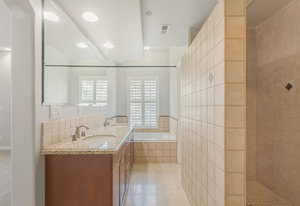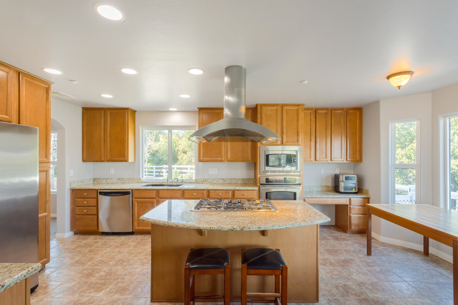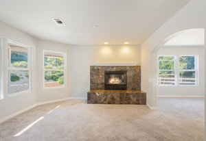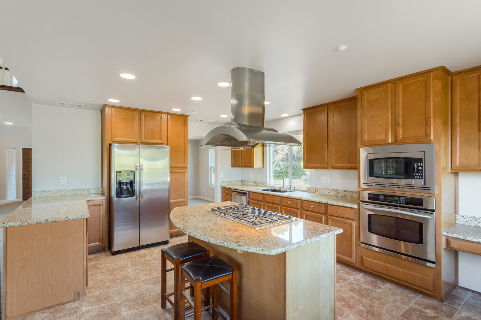 The spacious living areas include a family room with a fireplace and a gourmet kitchen equipped with an island bar, cooktop, custom stainless-steel appliances, and granite countertops. The main-level master suite boasts a large walk-in shower and spa tub, while the second level features 2 additional bedrooms and an open loft area, perfect for a home office or den.