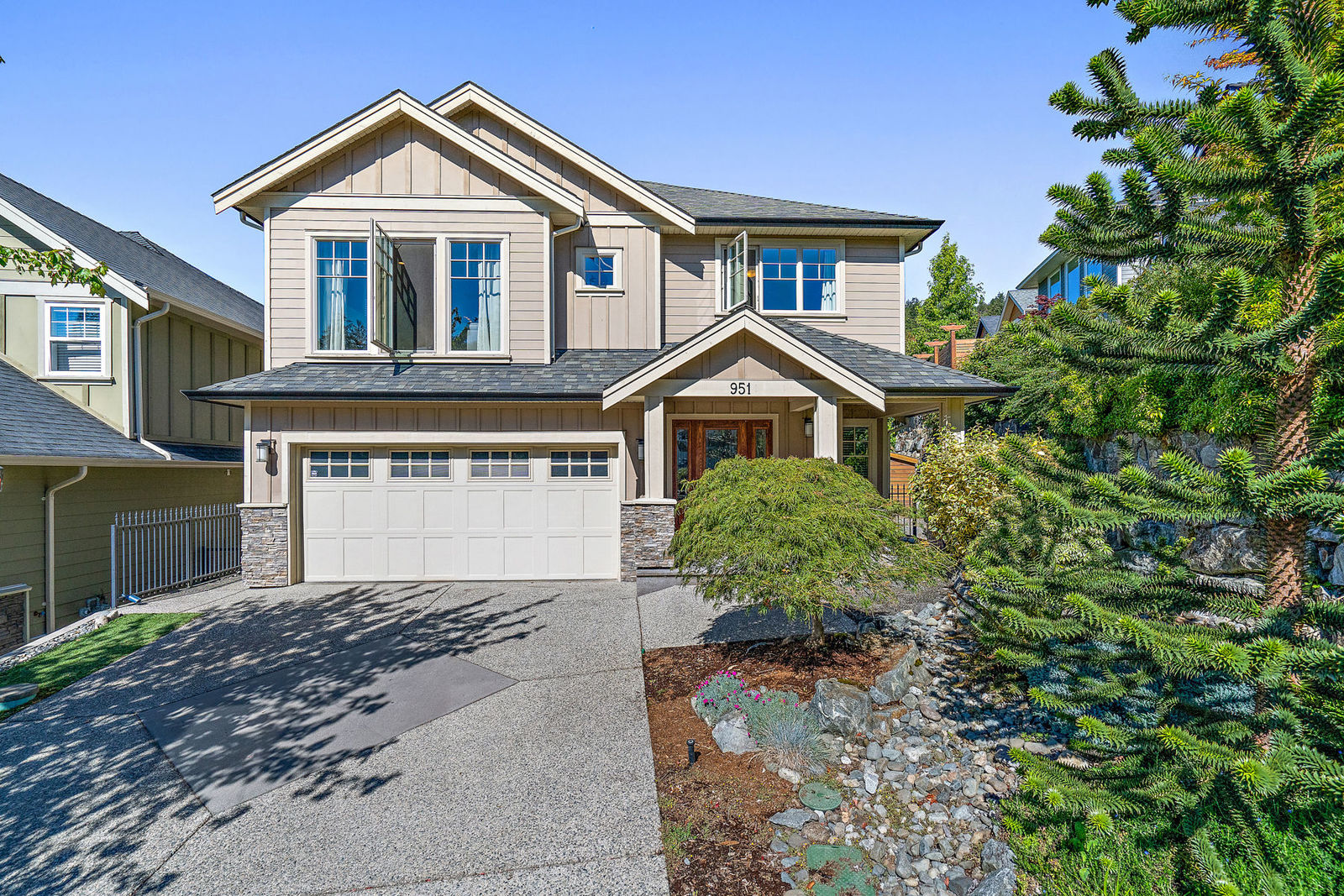 Welcome to 951 Gade Rd, this contemporary residence nestled on a quiet no-thru road in the Echo Valley, located at the base of Bear Mountain offers 4 bedrooms and 3 baths. You'll notice the fine detailing throughout as soon as you enter, from the bevelled lead glass entry to the crown mouldings, granite countertops, vaulted ceilings, heated bathroom floor and the fabulous layout, you're sure to be pleased! Enjoy your summer BBQs on the large deck which has stairs down to the back yard. Ideal set up with a private ground level suite with its own separate entrance and enhanced sound installation to keep everyone happy.