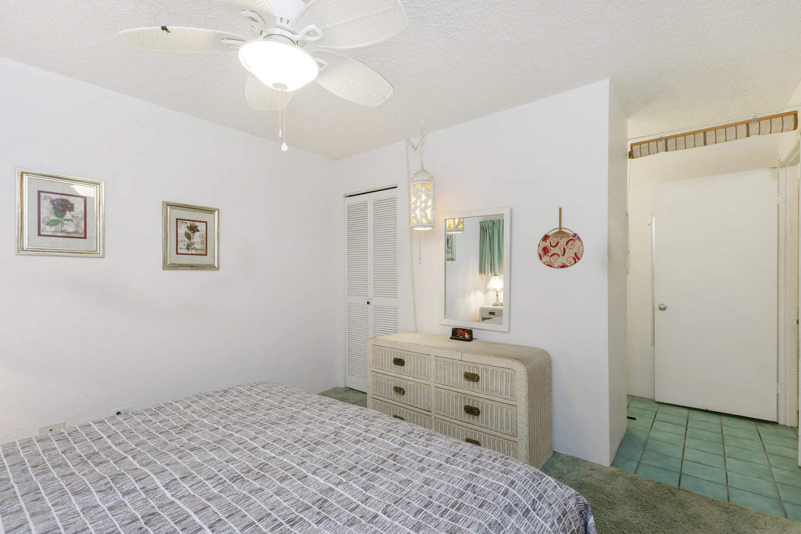 Tankless water heater, all tile flooring except carpeted bedroom & living room.