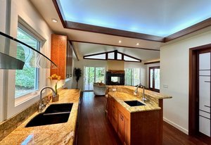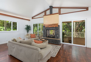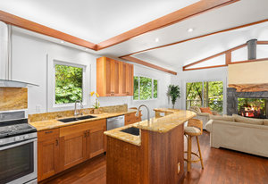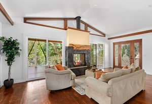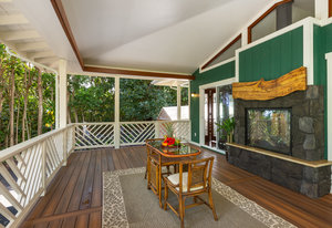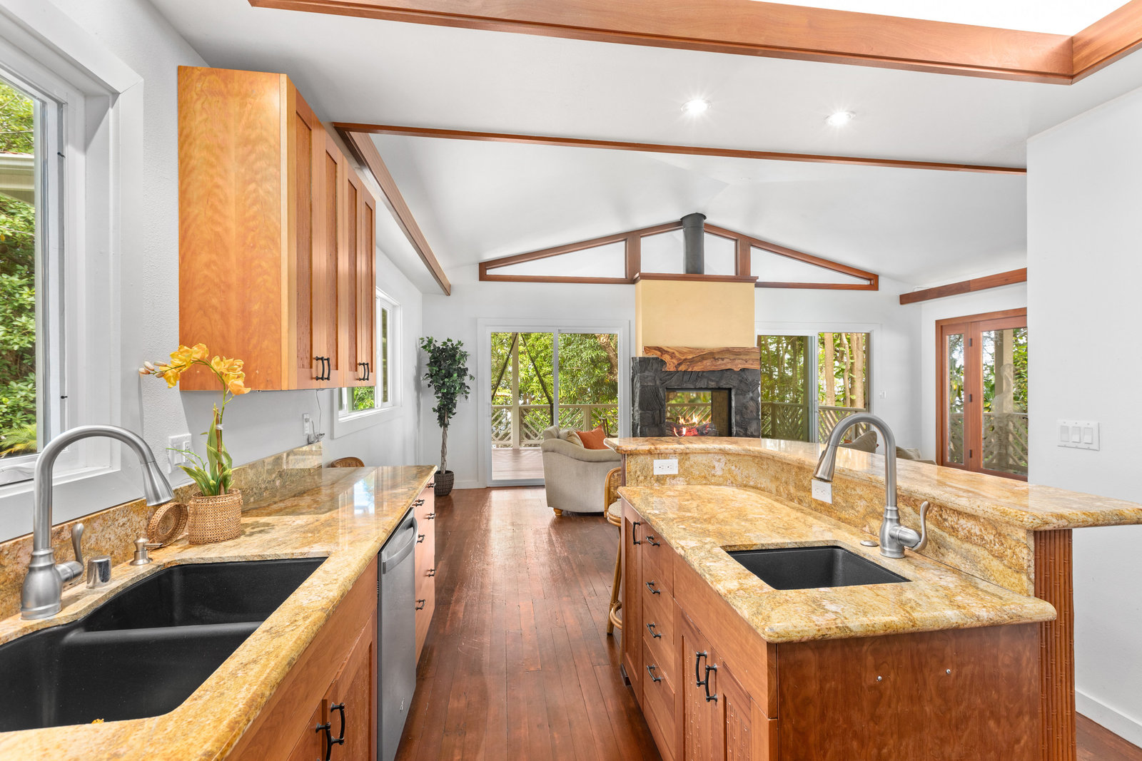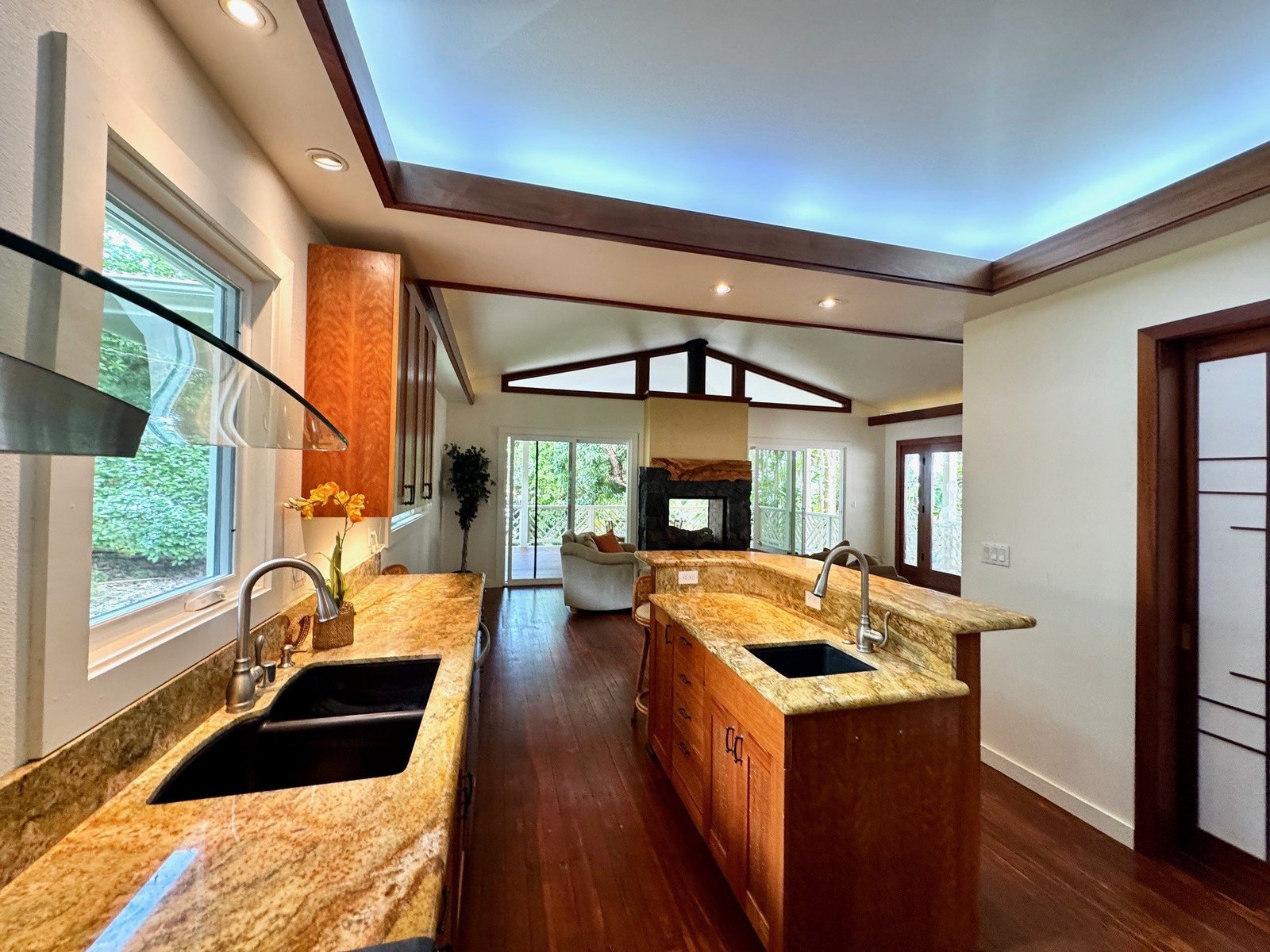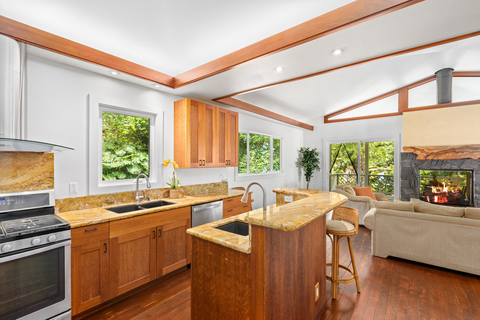The thoughtfully designed interior features vaulted ceilings, solid fir floors, and custom Shoji doors. A stunning Chocolate Heart Mango mantle frames the gas fireplace—visible from both the main living area and the front lanai—creating a warm, inviting focal point. The chef-inspired kitchen boasts custom Sapele wood cabinetry, solid granite countertops, a gas range, and a classic Zephyr hood. Second bedroom/home office is accessed via a breezeway creating excellent privacy.