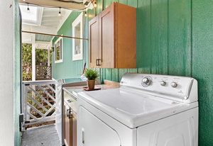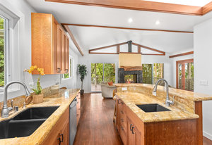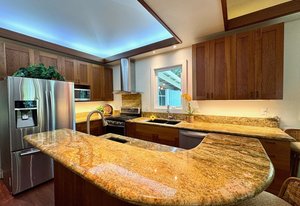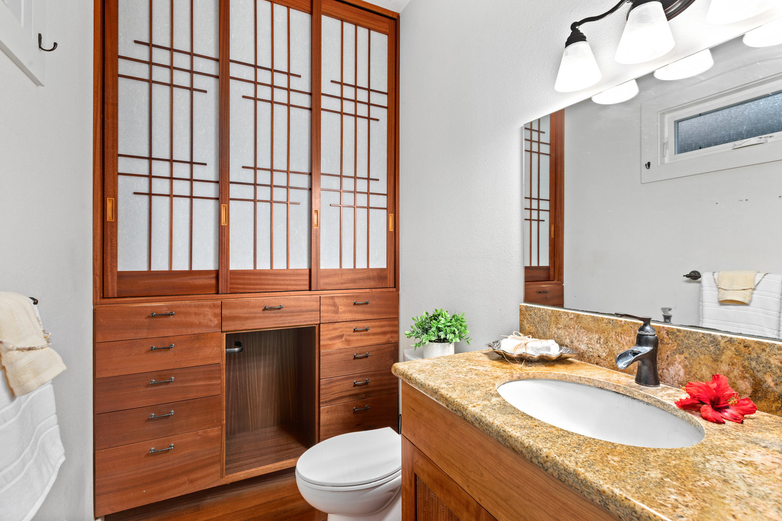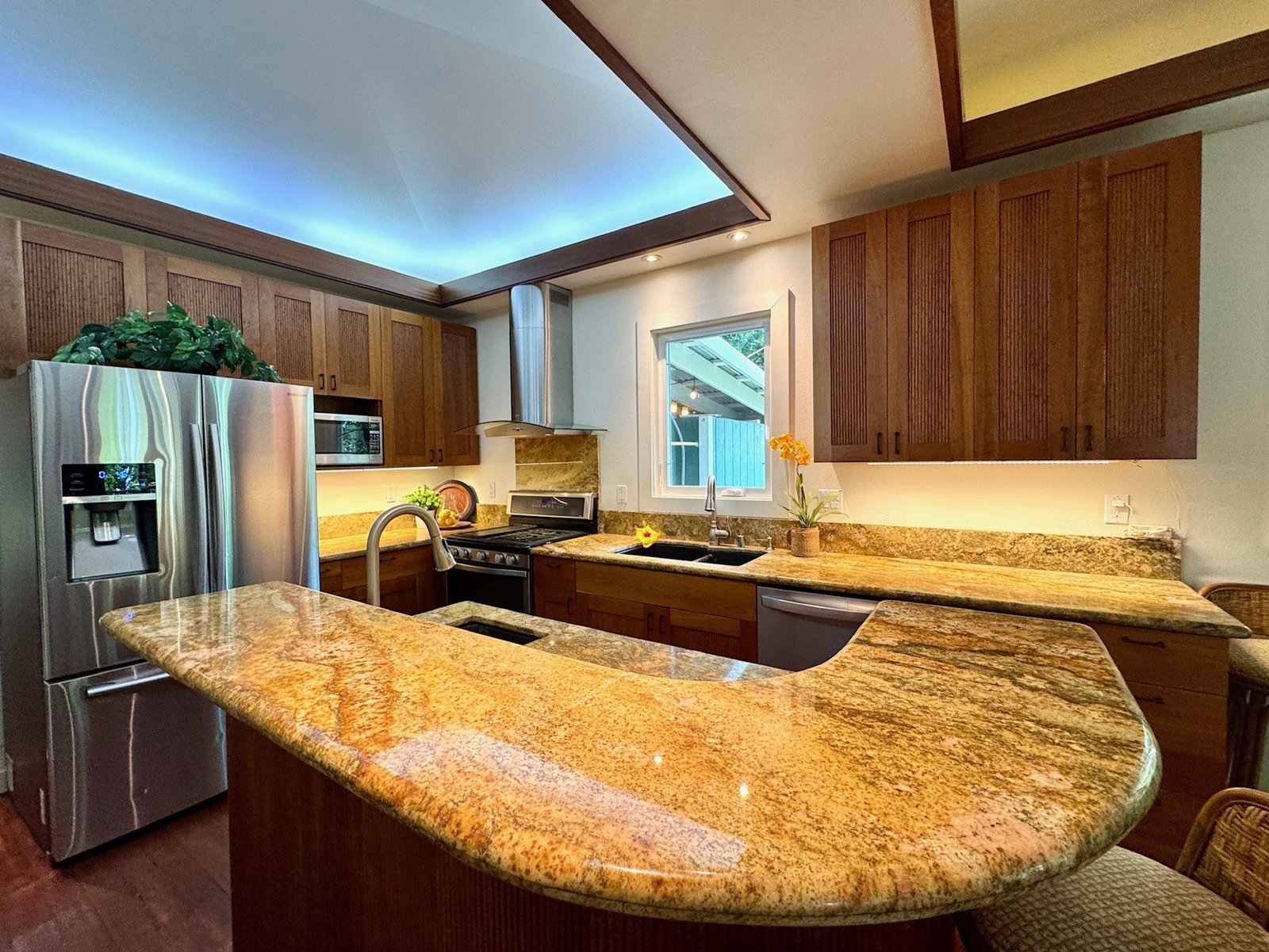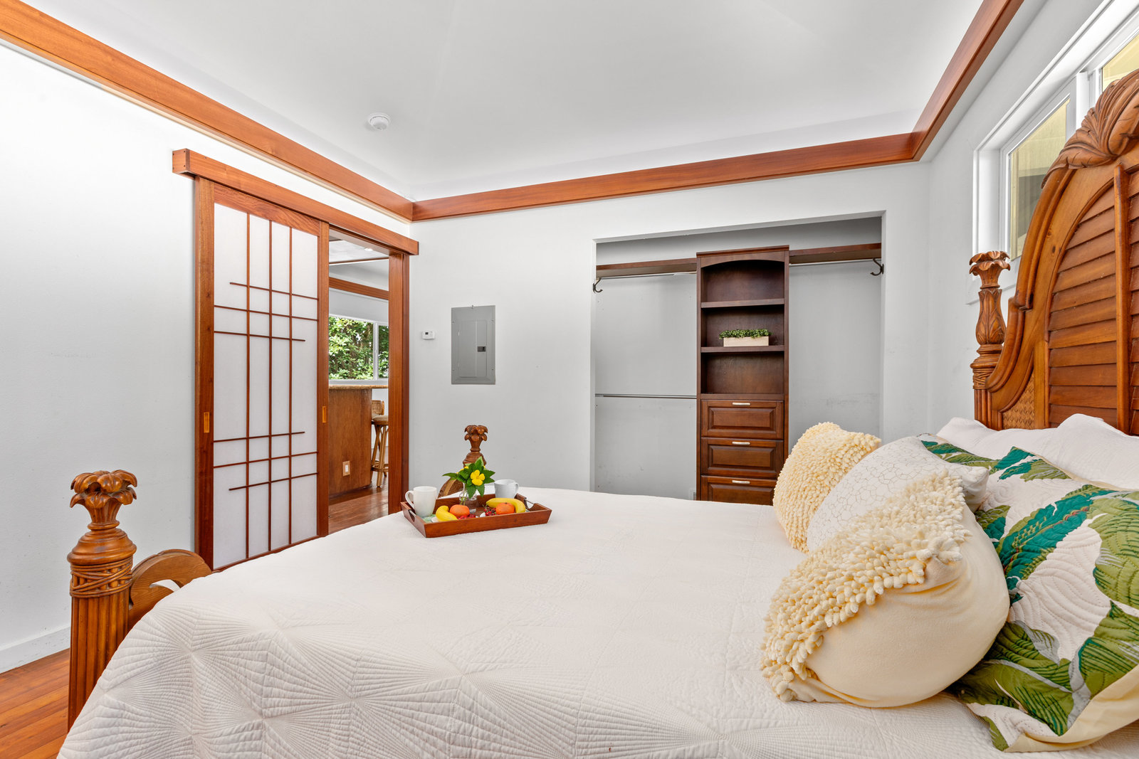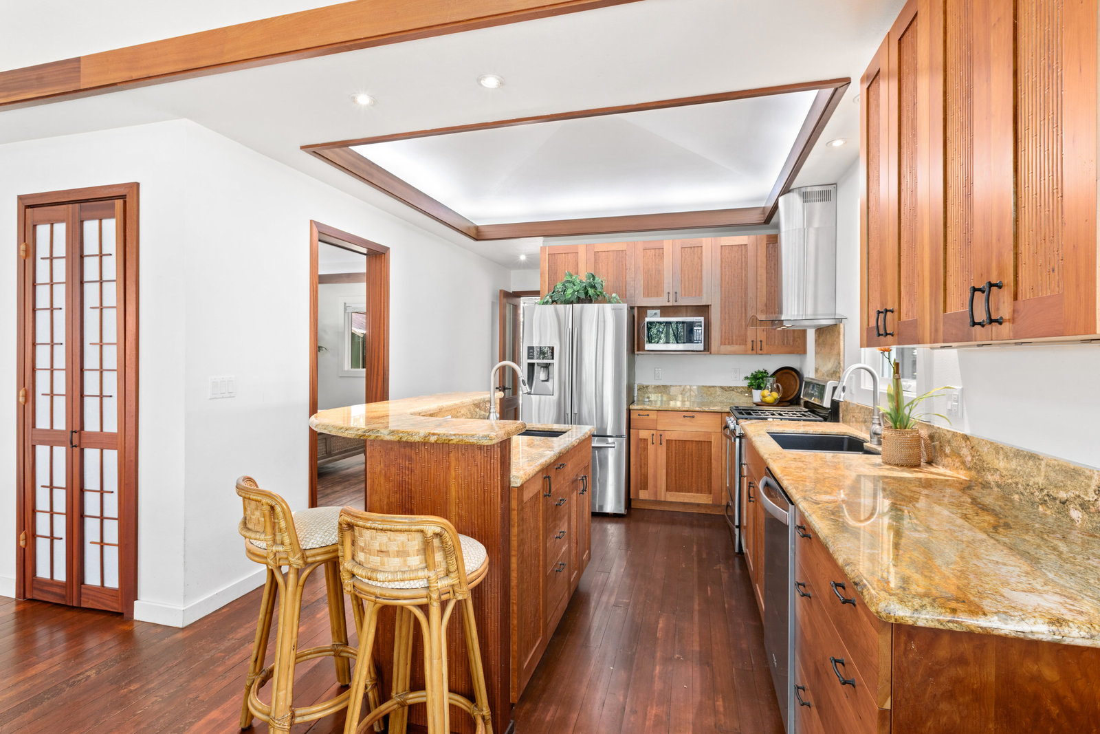 The thoughtfully designed interior features vaulted ceilings, solid fir floors, and custom Shoji doors. A stunning Chocolate Heart Mango mantle frames the gas fireplace—visible from both the main living area and the front lanai—creating a warm, inviting focal point. The chef-inspired kitchen boasts custom Sapele wood cabinetry, solid granite countertops, a gas range, and a classic Zephyr hood. Second bedroom/home office is accessed via a breezeway creating excellent privacy.