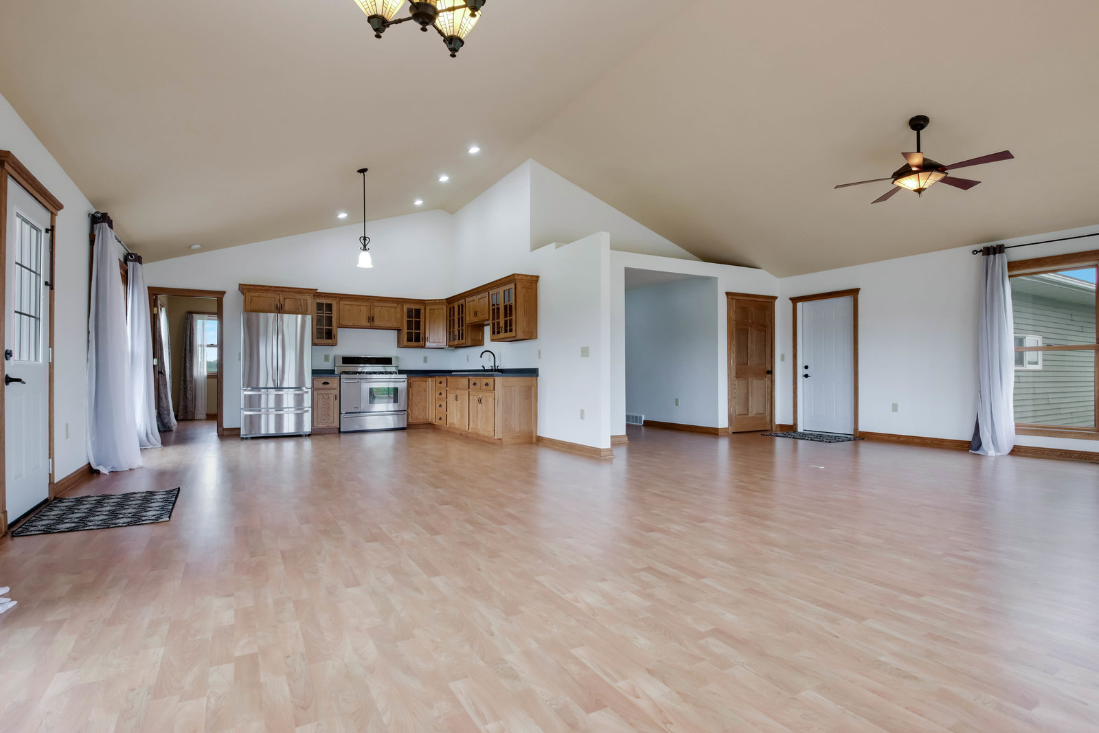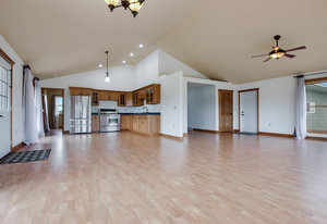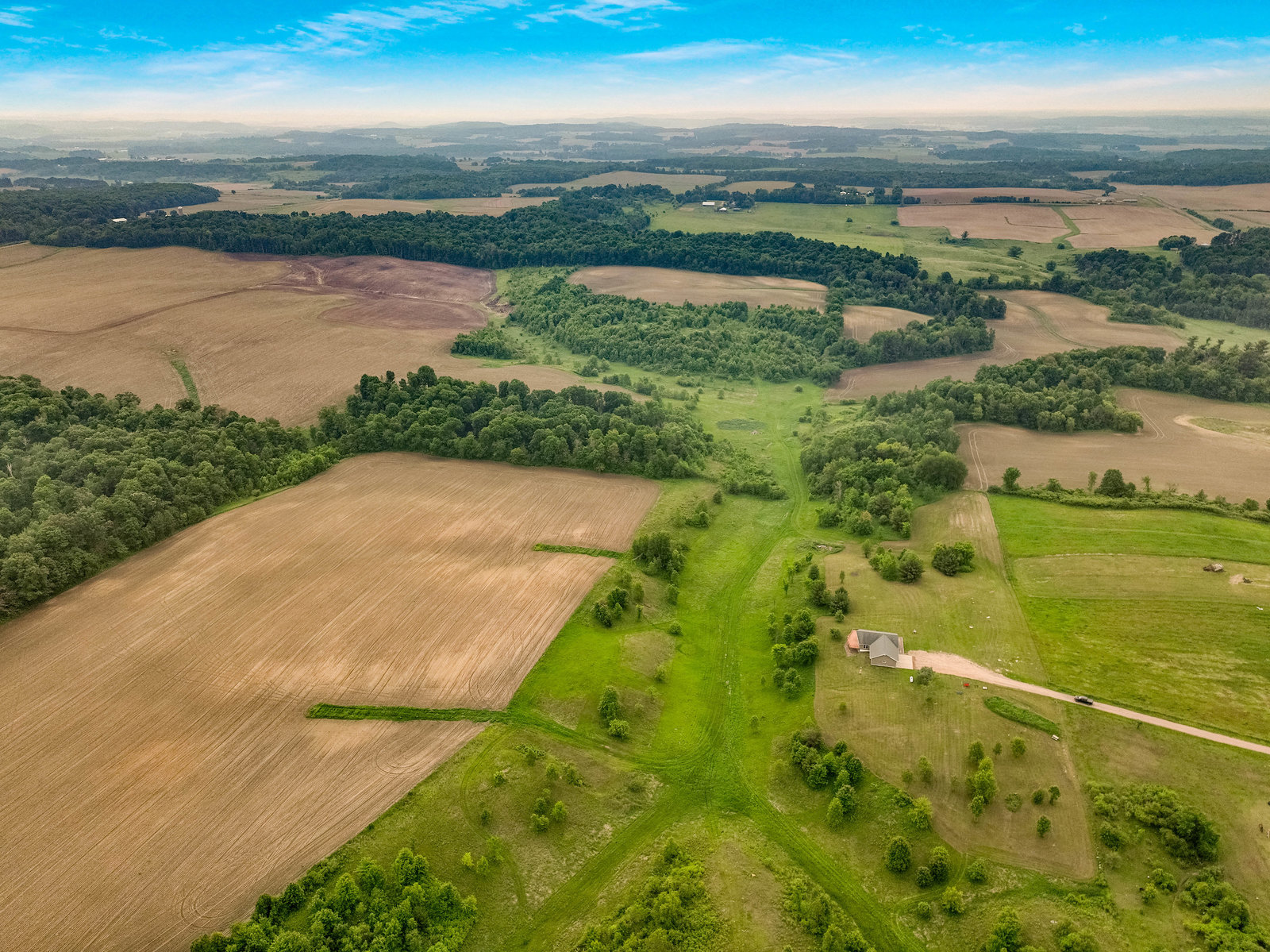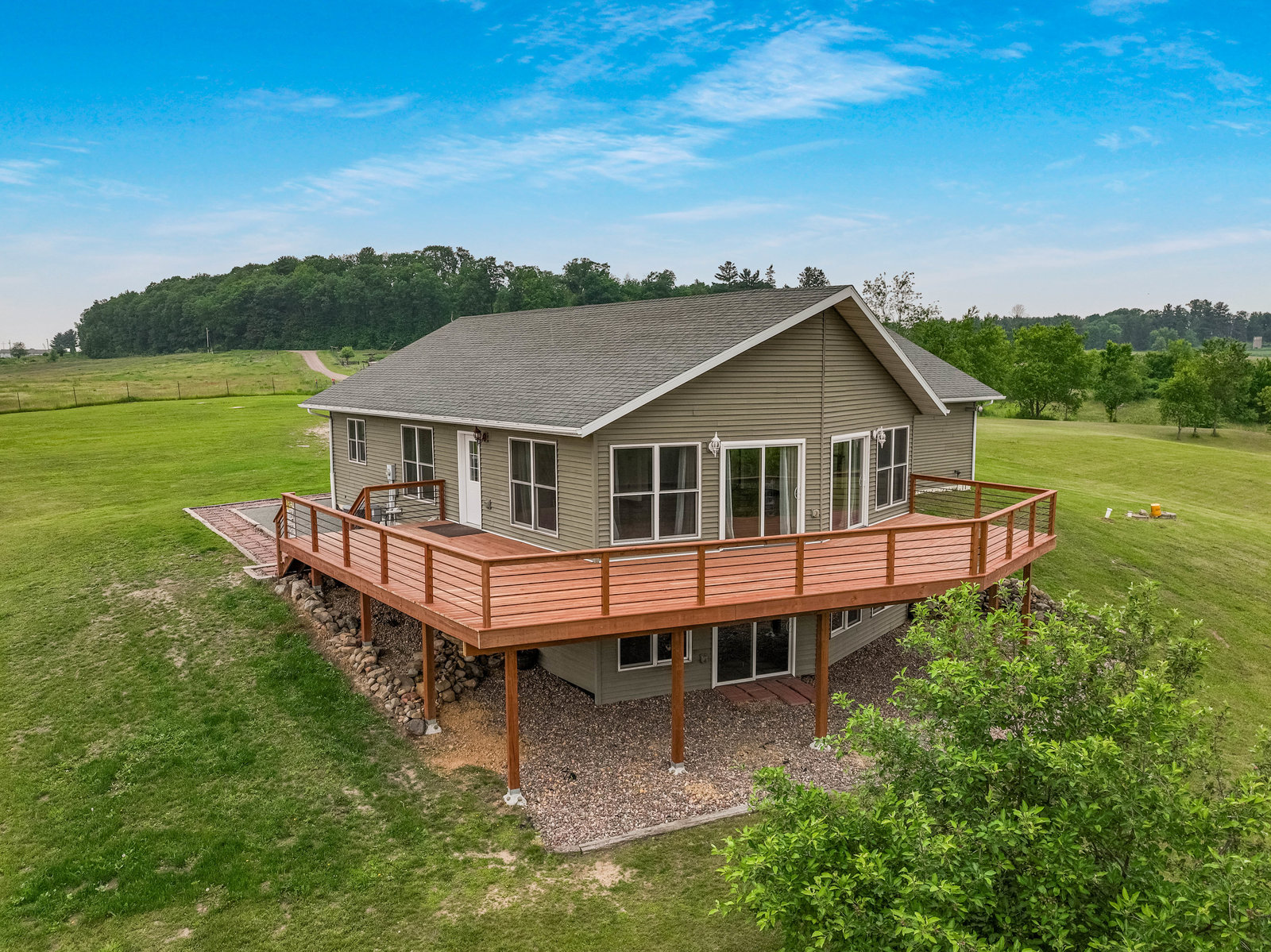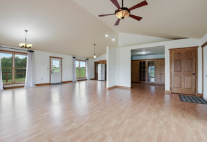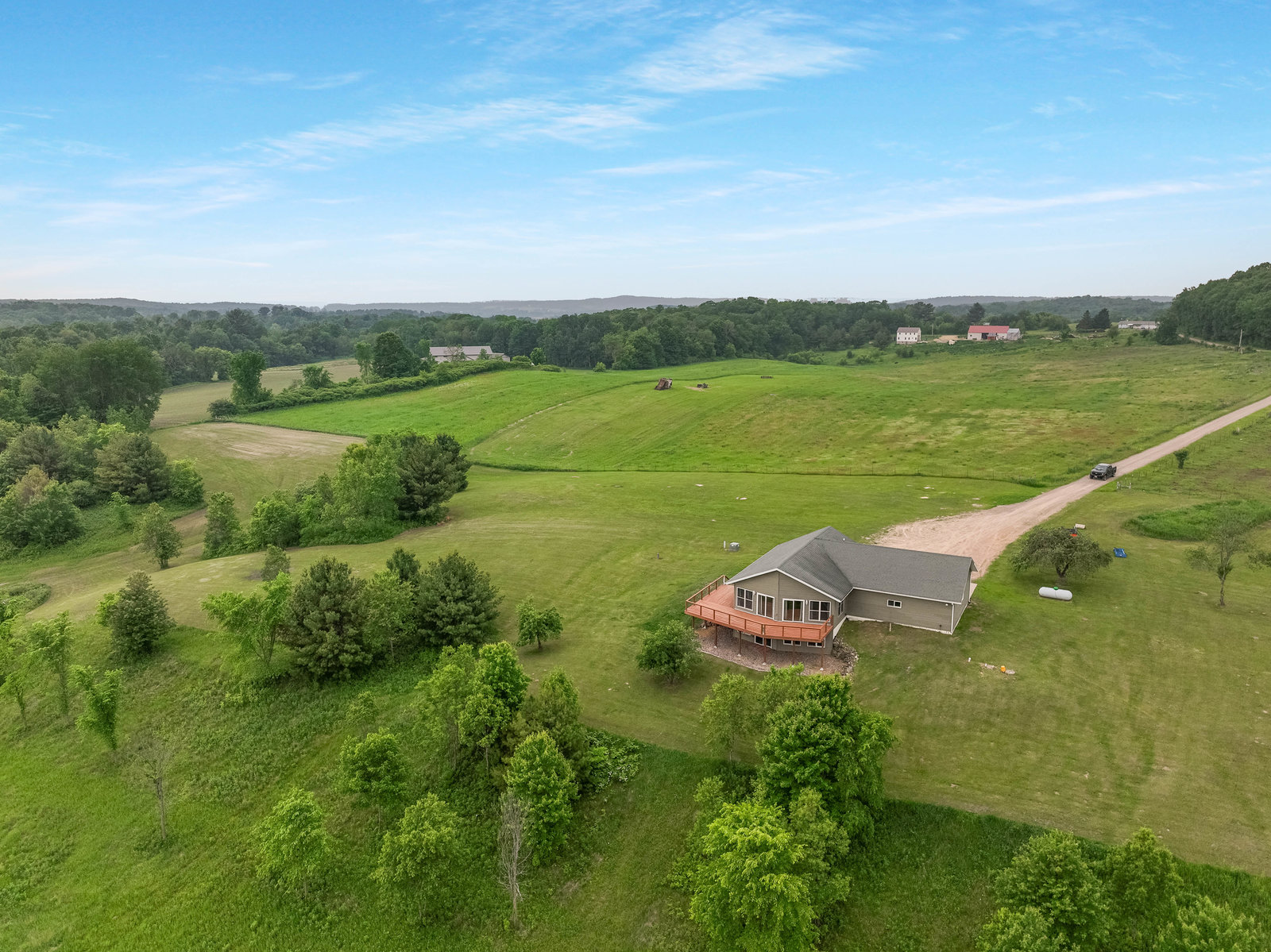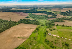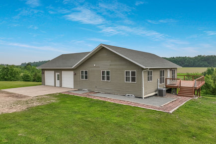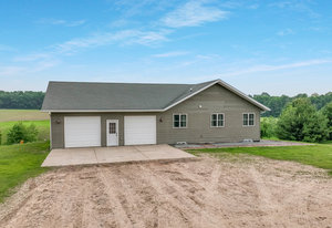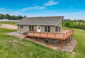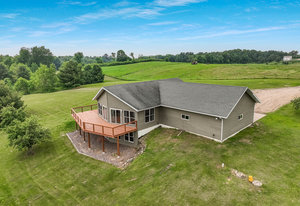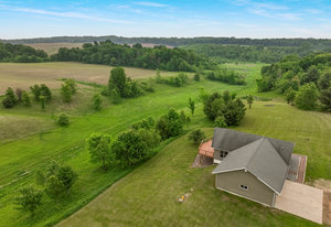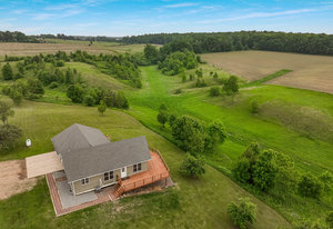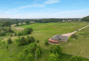 Just minutes from town, this 65-acre country estate offers privacy, space, and flexibility. Set on 3 parcels comprised of roughly 25 tillable, 26 pasture, and 14 wooded acres, this property offers tons of opportunity! This could be the perfect spot for livestock, horses, a hobby farm, or simply an escape from the hustle and bustle! The home features an open layout with vaulted ceilings, large windows boasting views of the rolling acres, and a spacious kitchen with hardwood cabinets and a 6-burner range. Enjoy panoramic views from the expansive wraparound deck. The main level includes an office with built-in shelves and a private owner’s suite. Walk-out basement and oversized attached garage—fully insulated and heated. Tucked off the road in a peaceful, countryside setting! Just needs you!