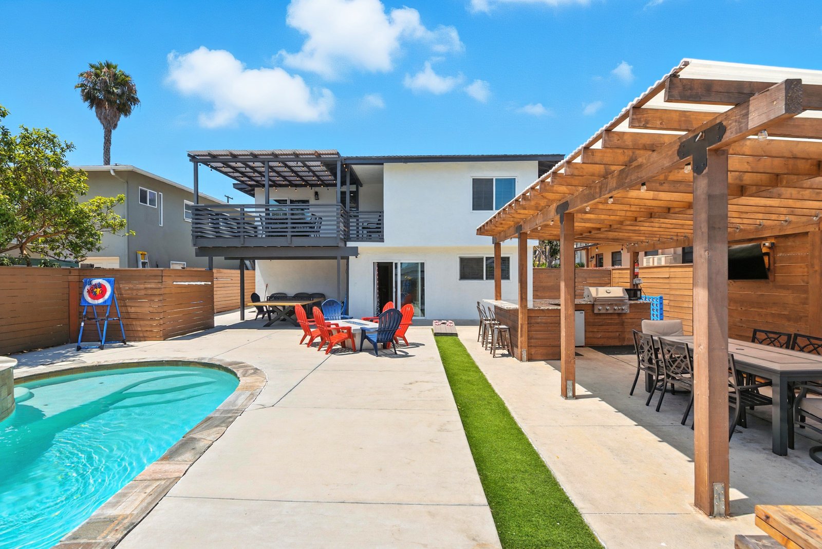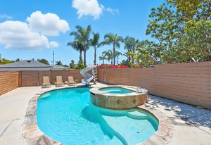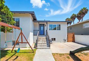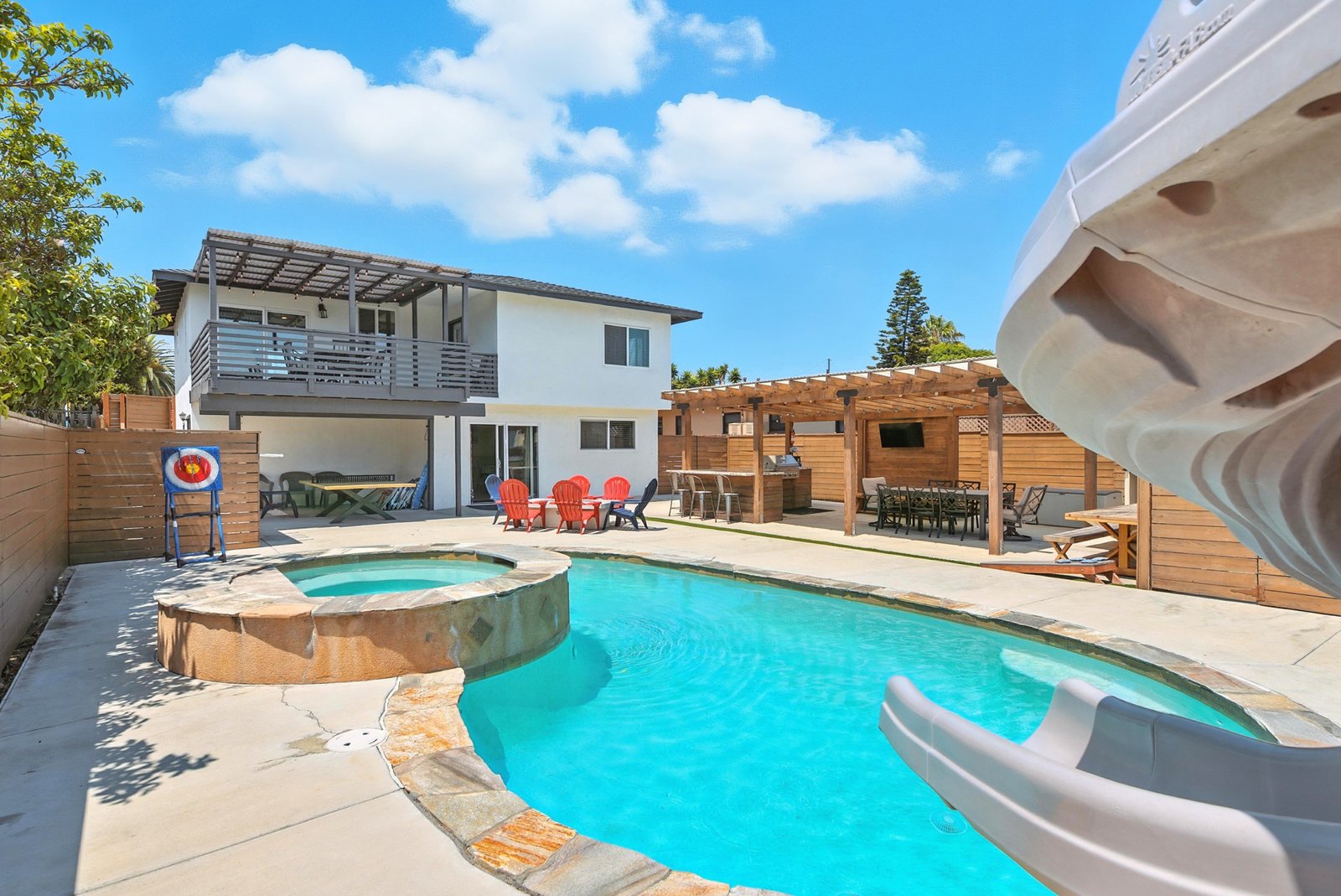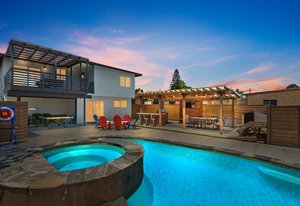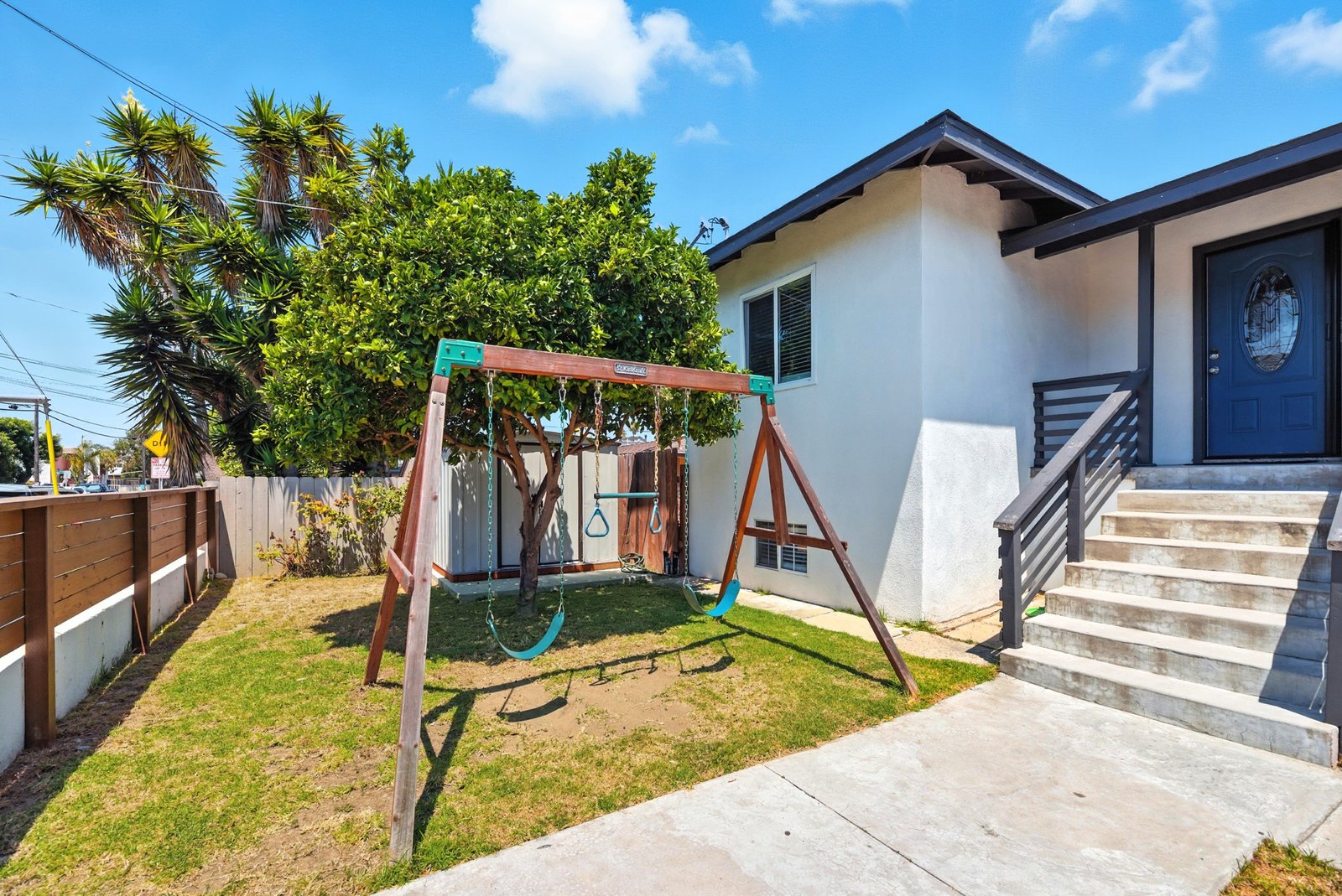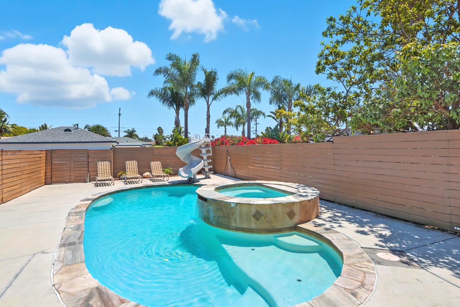 Located about a half mile to the Pacific Ocean, is this tastefully remodeled mid century beach bungalow. Fully fenced front yard with two play structures over grass leads to the entry of this 4+ bedroom, 3 bath house. Enter the front door and you’ll be greeted by a spacious living room that is open to a beautifully remodeled kitchen with quartz countertops, white shaker cabinets and stainless-steel appliances. Dining area off the kitchen features a glass slider that leads out to a large lanai that overlooks the back yard. Main level also features primary bedroom with the remodeled bathroom and a secondary bedroom with another full bathroom. Head down the stairs to the lower level of this entertainer’s delight and you’ll see a sitting area that leads to a spacious recreation room that features two stacked washer/dryer combos and a separate closet. This room could also serve as a fifth bedroom should you choose. Two more bedrooms and a full bathroom are also located on this lover level that leads out to the incredible, fully-fenced back yard. A large concrete patio with firepit is connected to a covered BBQ pavilion with granite covered bar and a large dining area. Rounding out the back yard paradise is a newly-built pool with spa as well as a covered patio. Two off street parking spaces are conveniently located beyond the fence off of the rear alley. Side yard leads to front and second side yard is also fenced in.