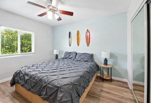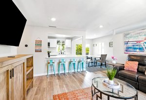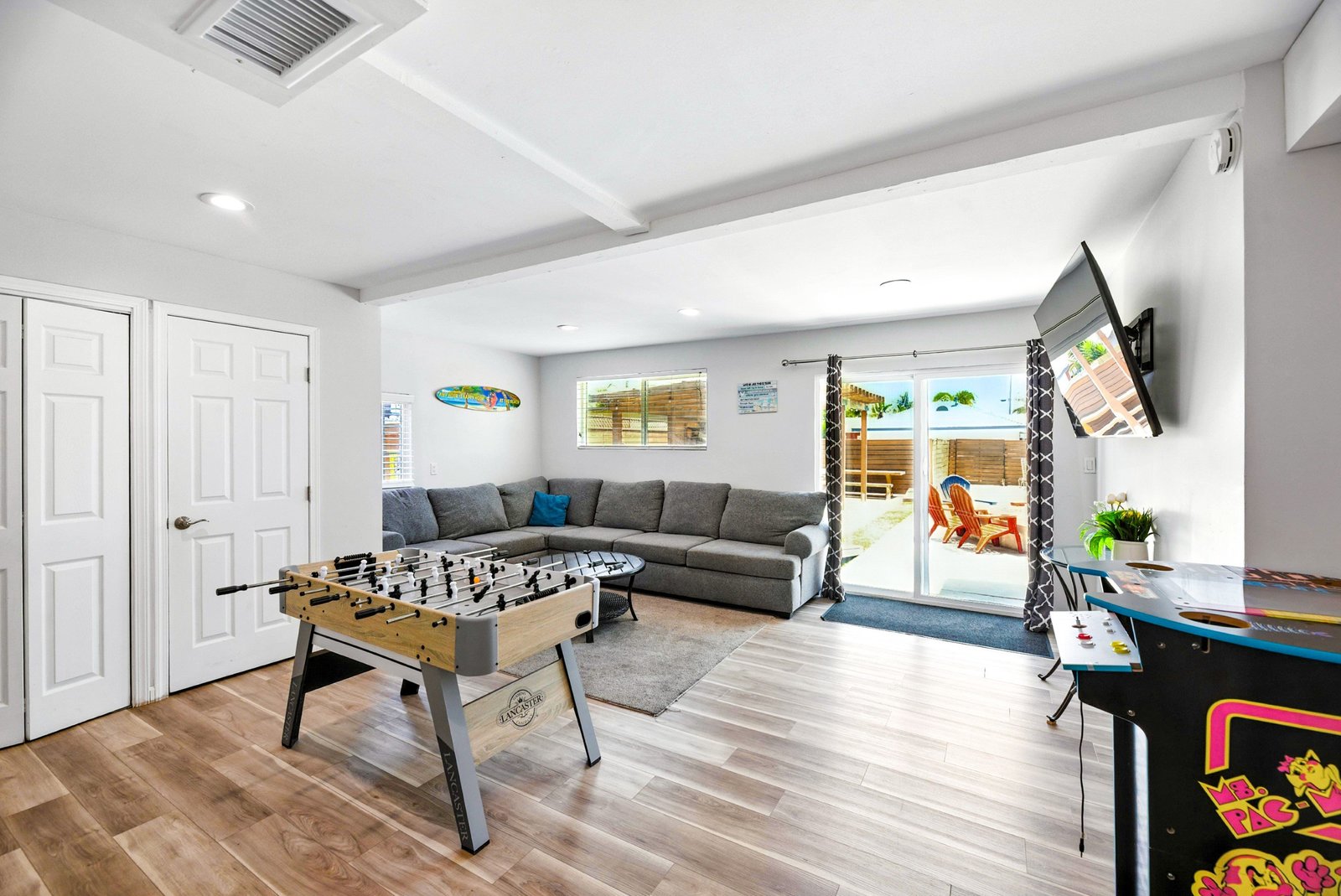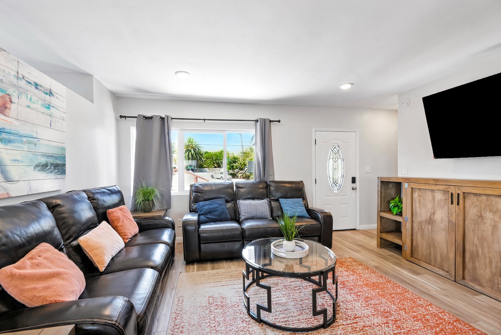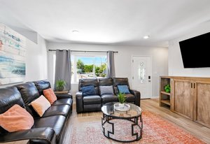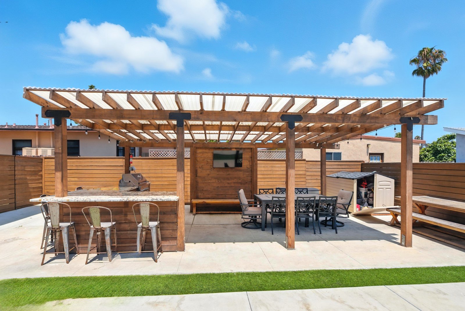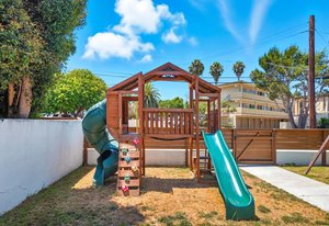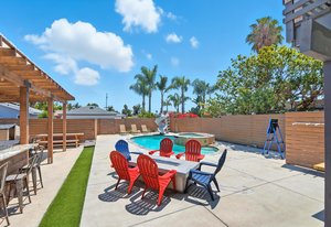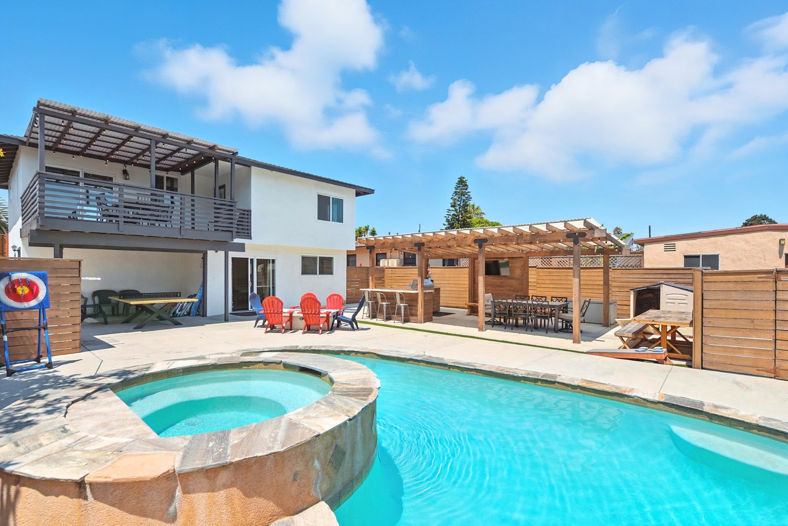 Located about a half mile to the Pacific Ocean, is this tastefully remodeled mid century beach bungalow. Fully fenced front yard with two play structures over grass leads to the entry of this 4+ bedroom, 3 bath house. Enter the front door and you’ll be greeted by a spacious living room that is open to a beautifully remodeled kitchen with quartz countertops, white shaker cabinets and stainless-steel appliances. Dining area off the kitchen features a glass slider that leads out to a large lanai that overlooks the back yard. Main level also features primary bedroom with the remodeled bathroom and a secondary bedroom with another full bathroom. Head down the stairs to the lower level of this entertainer’s delight and you’ll see a sitting area that leads to a spacious recreation room that features two stacked washer/dryer combos and a separate closet. This room could also serve as a fifth bedroom should you choose. Two more bedrooms and a full bathroom are also located on this lover level that leads out to the incredible, fully-fenced back yard. A large concrete patio with firepit is connected to a covered BBQ pavilion with granite covered bar and a large dining area. Rounding out the back yard paradise is a newly-built pool with spa as well as a covered patio. Two off street parking spaces are conveniently located beyond the fence off of the rear alley. Side yard leads to front and second side yard is also fenced in.