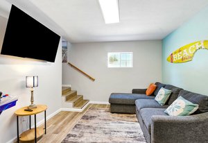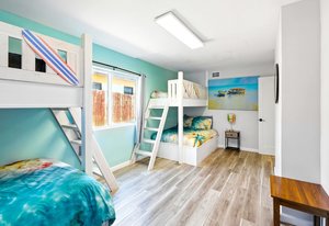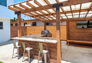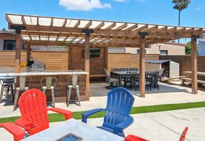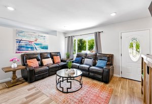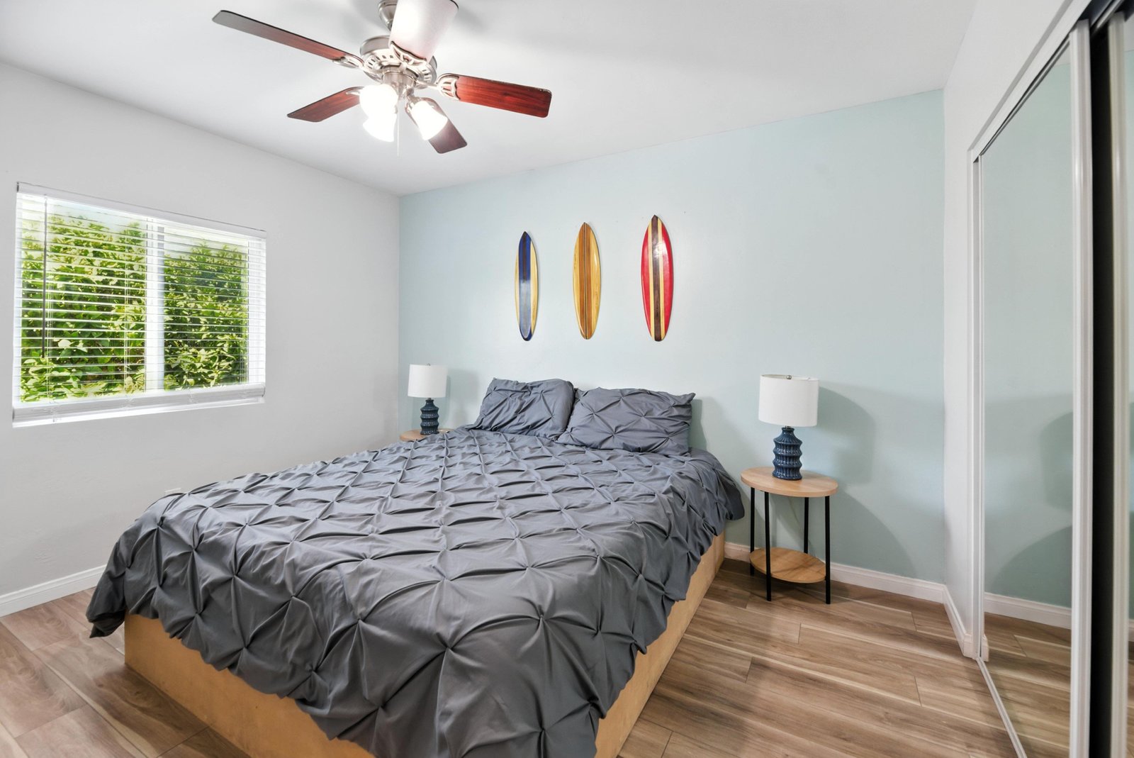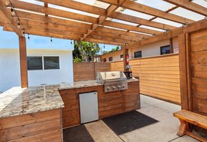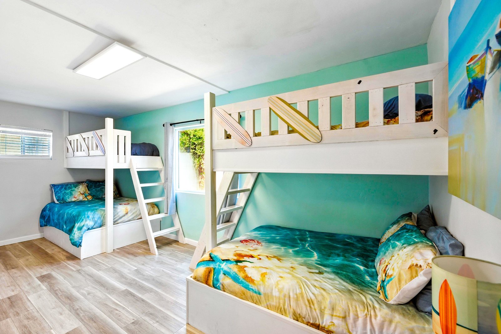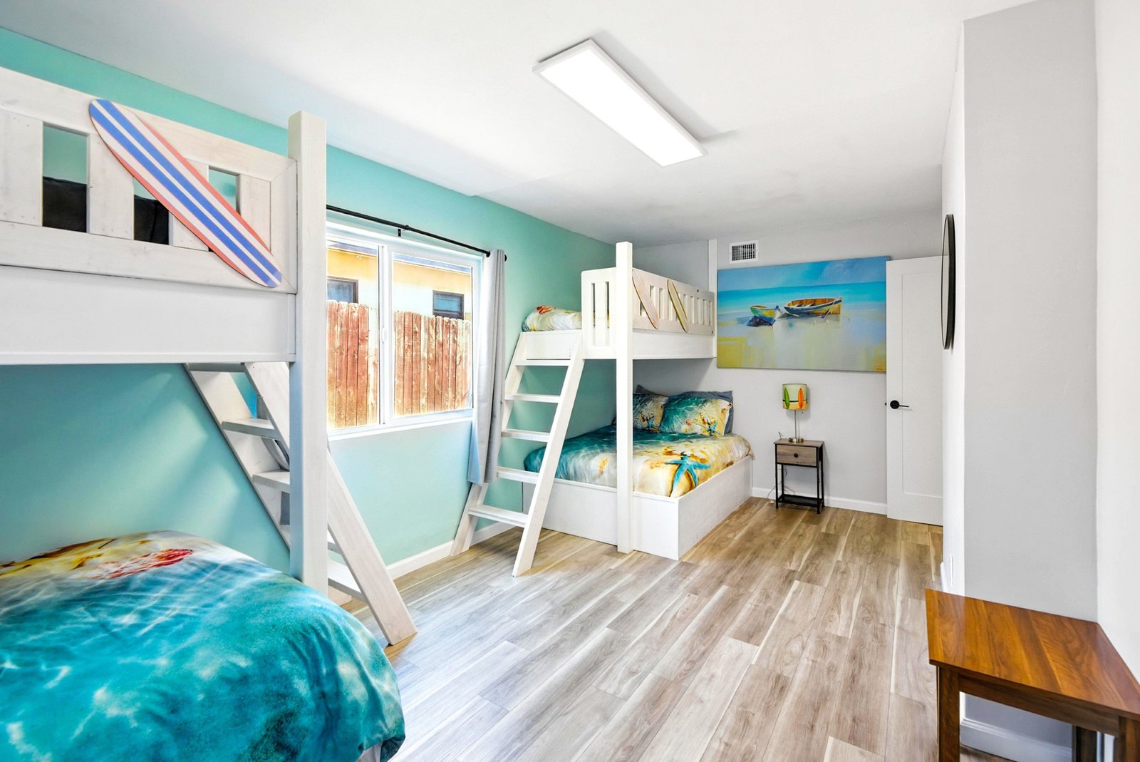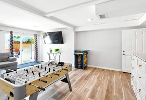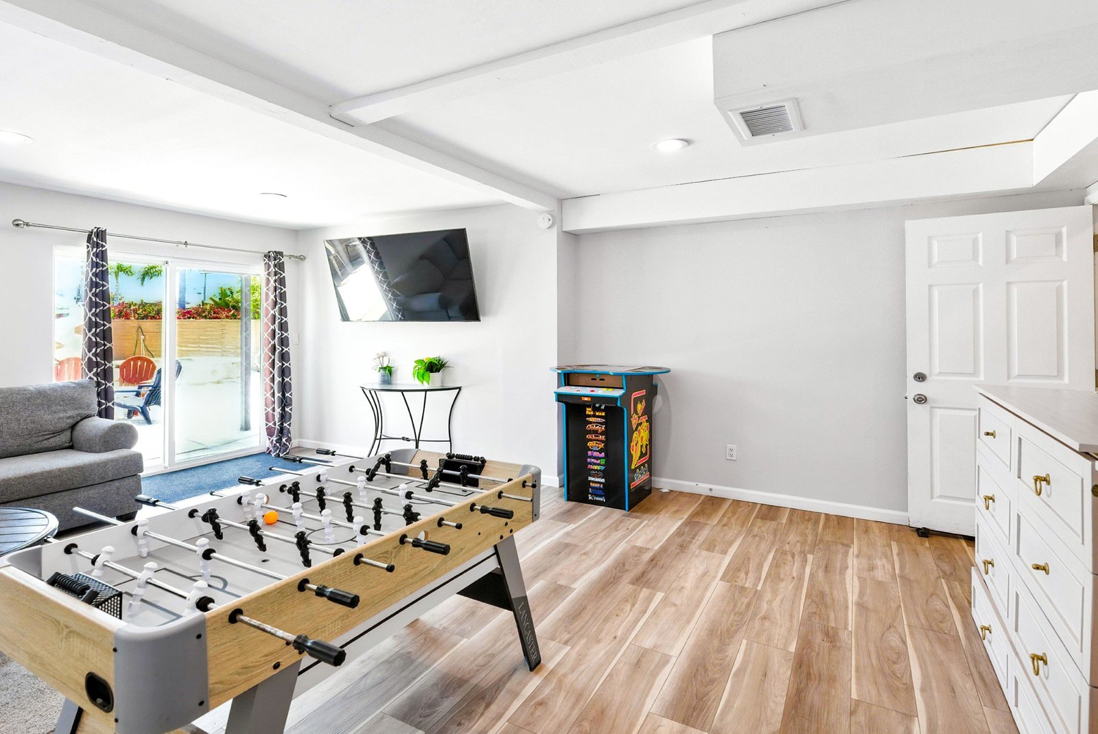 Located about a half mile to the Pacific Ocean, is this tastefully remodeled mid century beach bungalow. Fully fenced front yard with two play structures over grass leads to the entry of this 4+ bedroom, 3 bath house. Enter the front door and you’ll be greeted by a spacious living room that is open to a beautifully remodeled kitchen with quartz countertops, white shaker cabinets and stainless-steel appliances. Dining area off the kitchen features a glass slider that leads out to a large lanai that overlooks the back yard. Main level also features primary bedroom with the remodeled bathroom and a secondary bedroom with another full bathroom. Head down the stairs to the lower level of this entertainer’s delight and you’ll see a sitting area that leads to a spacious recreation room that features two stacked washer/dryer combos and a separate closet. This room could also serve as a fifth bedroom should you choose. Two more bedrooms and a full bathroom are also located on this lover level that leads out to the incredible, fully-fenced back yard. A large concrete patio with firepit is connected to a covered BBQ pavilion with granite covered bar and a large dining area. Rounding out the back yard paradise is a newly-built pool with spa as well as a covered patio. Two off street parking spaces are conveniently located beyond the fence off of the rear alley. Side yard leads to front and second side yard is also fenced in.