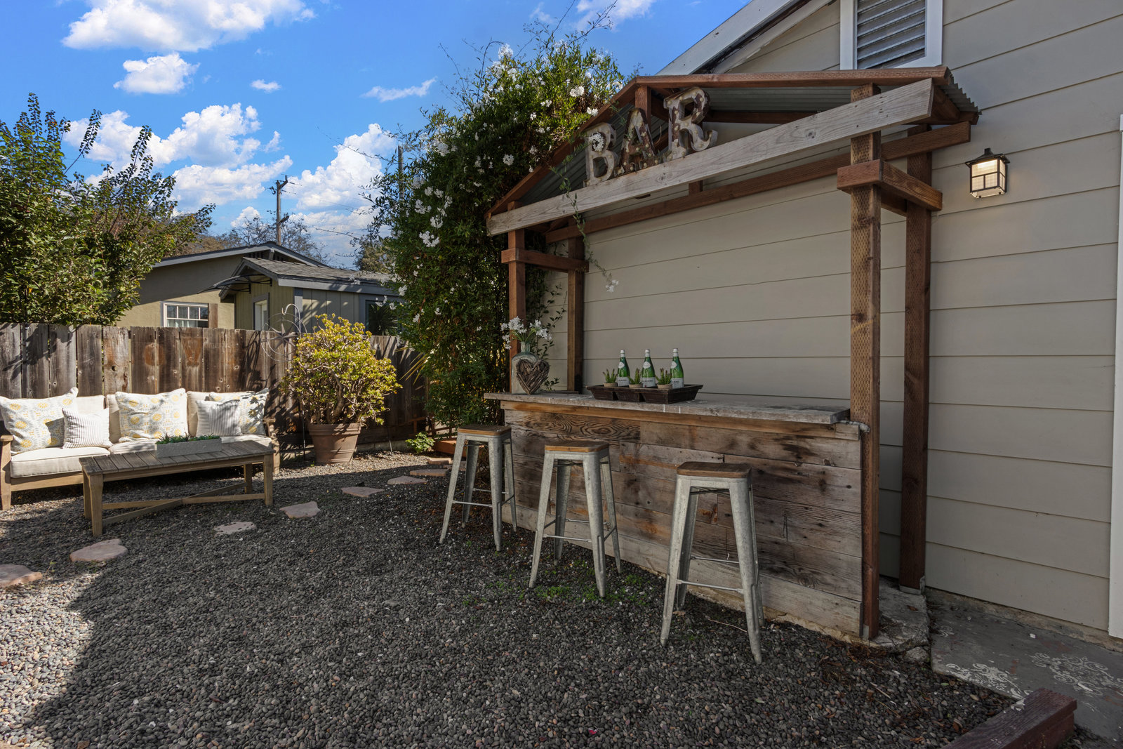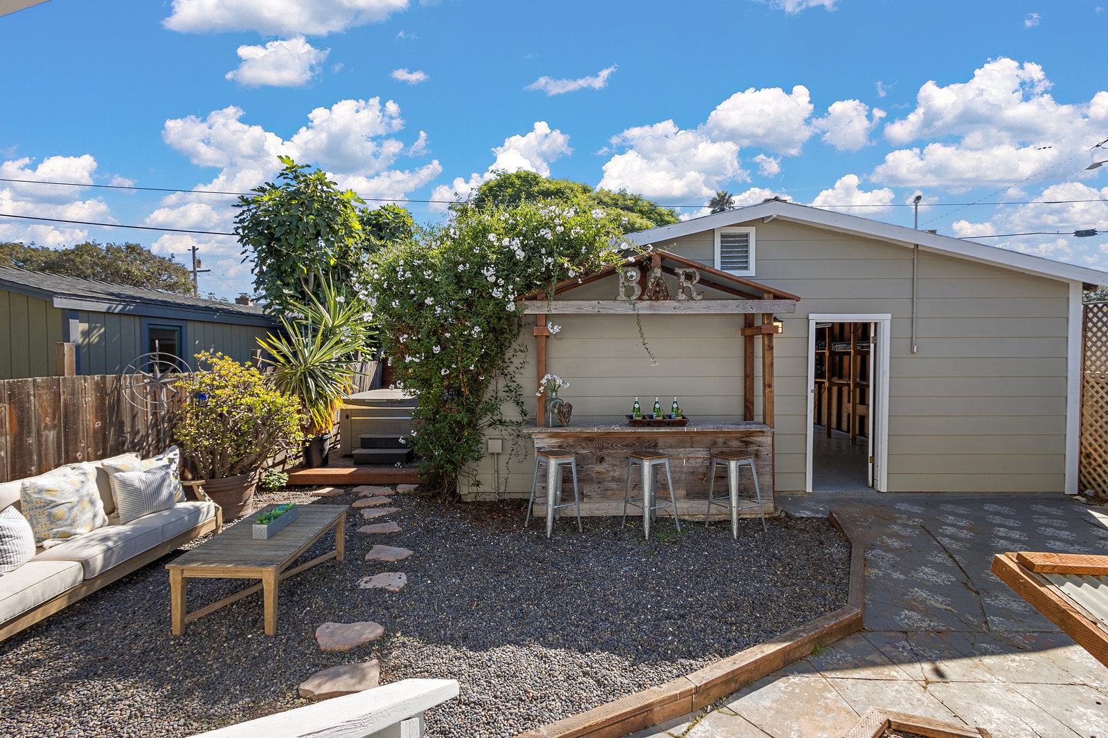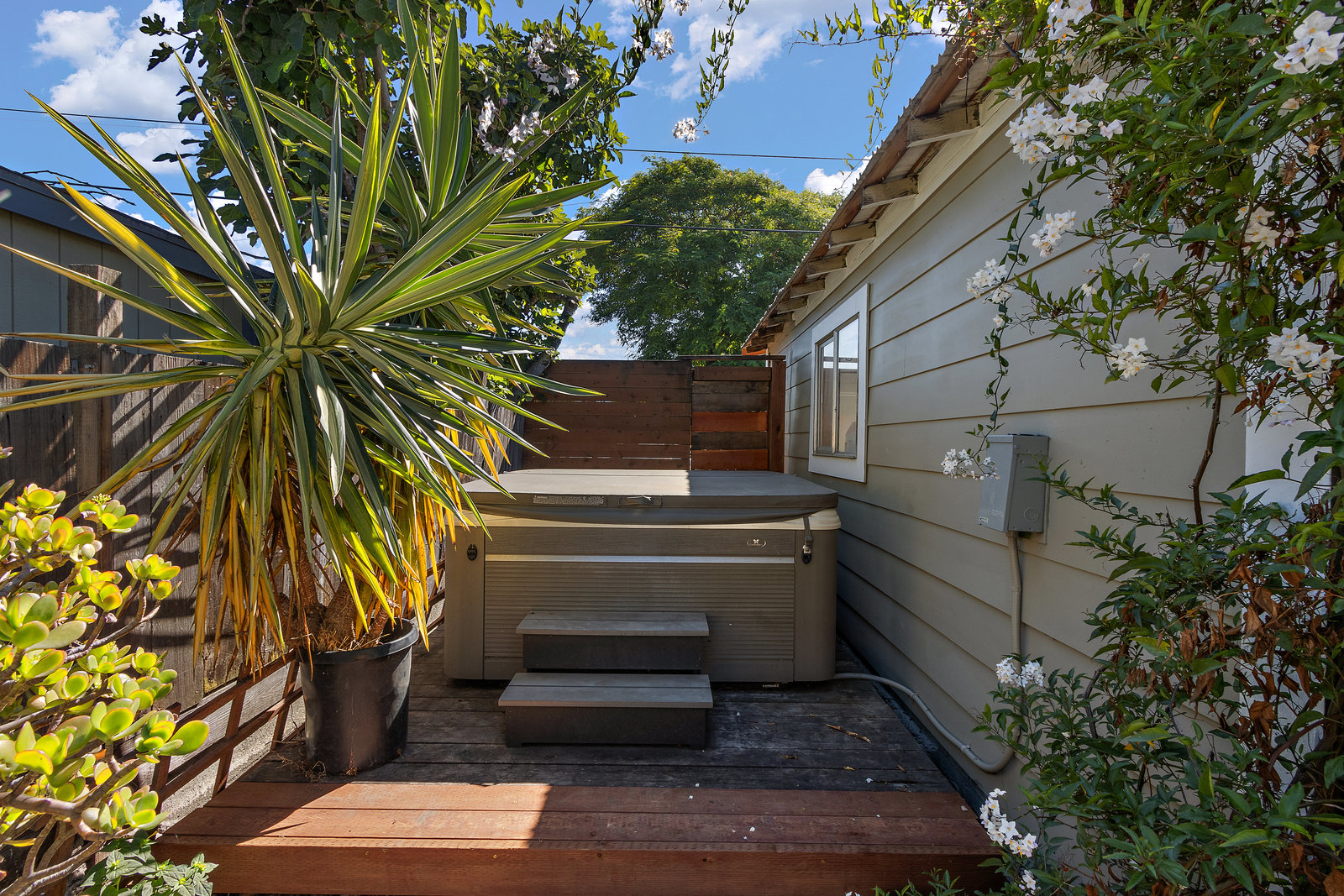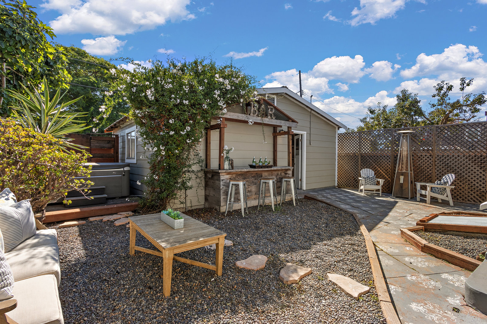 The outdoor spaces are equally impressive with a front yard urban garden and backyard jacuzzi providing perfect spots for relaxation. A spacious detached two-car garage adds convenience along with extra storage options.