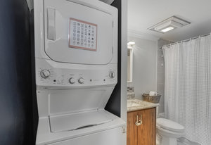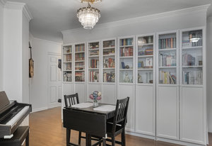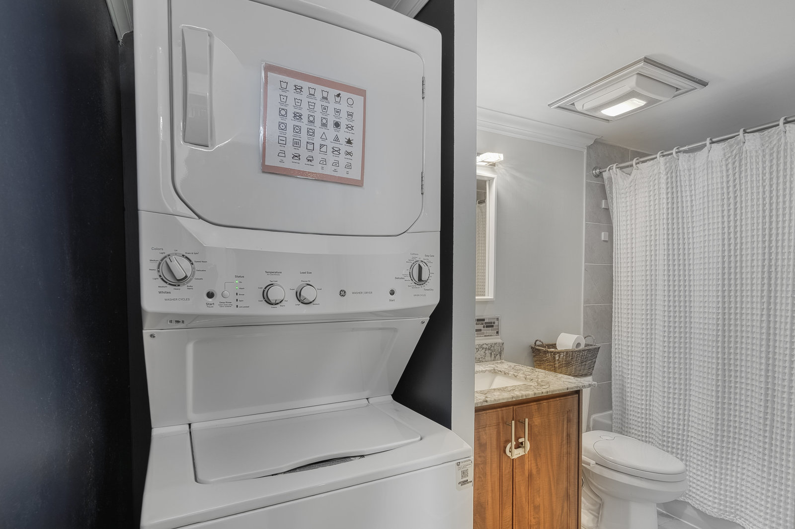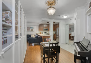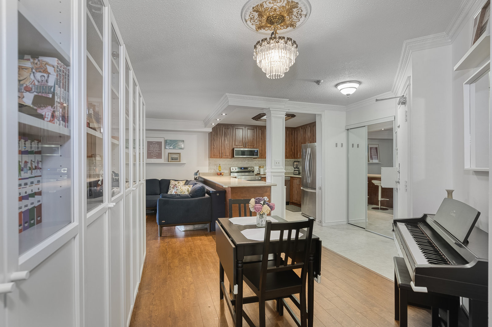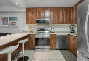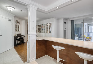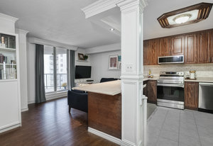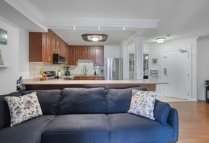 This meticulously updated unit features a modern, open-concept layout perfect for both everyday living and entertaining. The stylish kitchen boasts stainless steel appliances, contemporary cabinetry, and a sleek breakfast bar that seamlessly flows into the spacious living and dining areas. Custom built-in cabinets under the island provide additional storage and convenience.