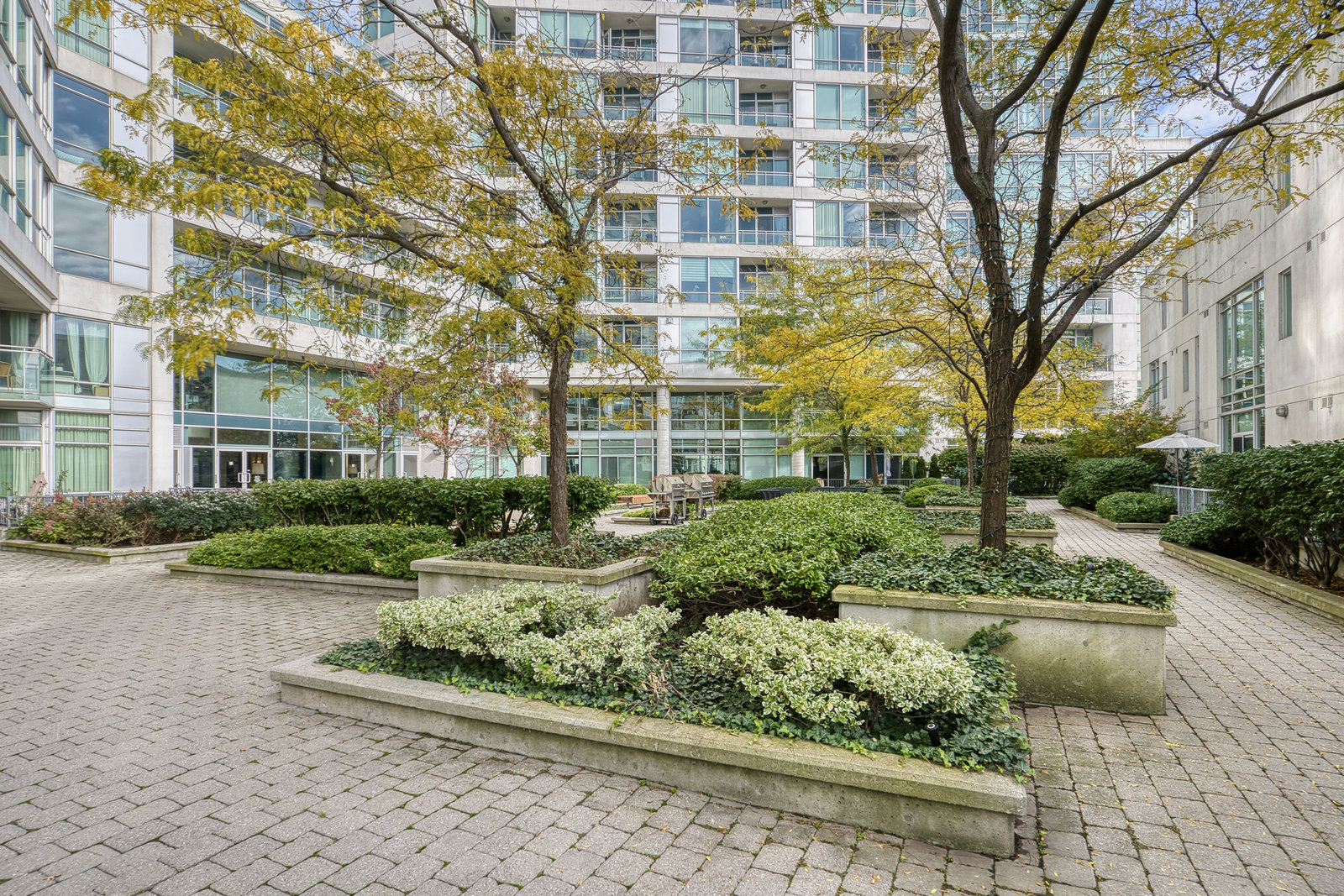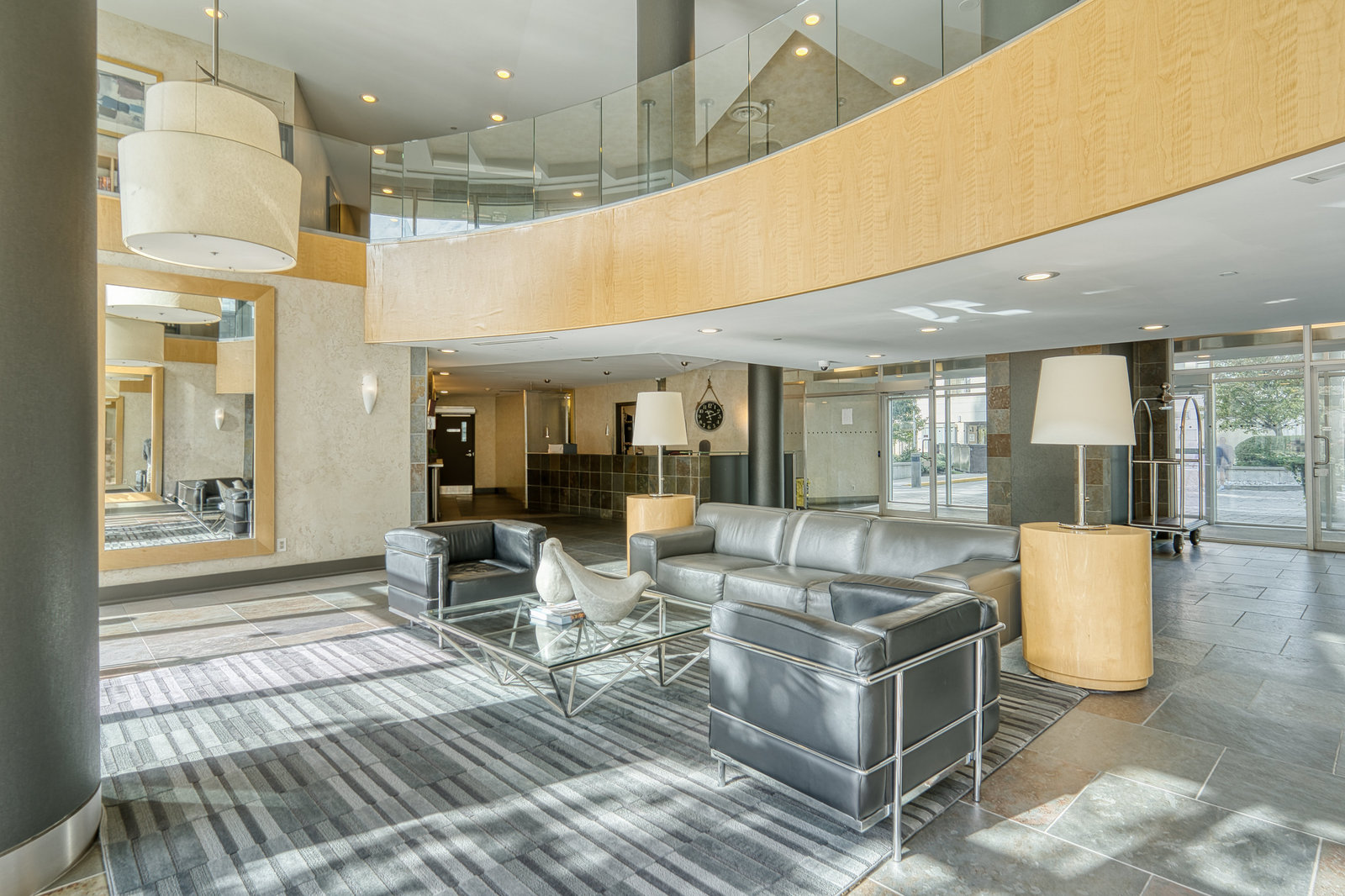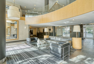 Amenities at Grenadier Landing include a 24-hour concierge, exercise room, media and party rooms, billiards and table tennis, a landscaped courtyard with a BBQ, a library, hobby room, and guest suites. There is also visitor parking and a 7th-floor outdoor terrace with views of the lake.
