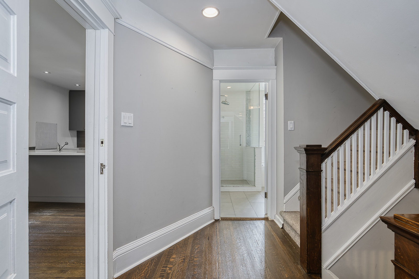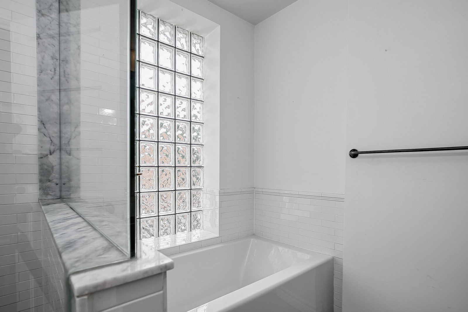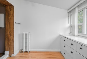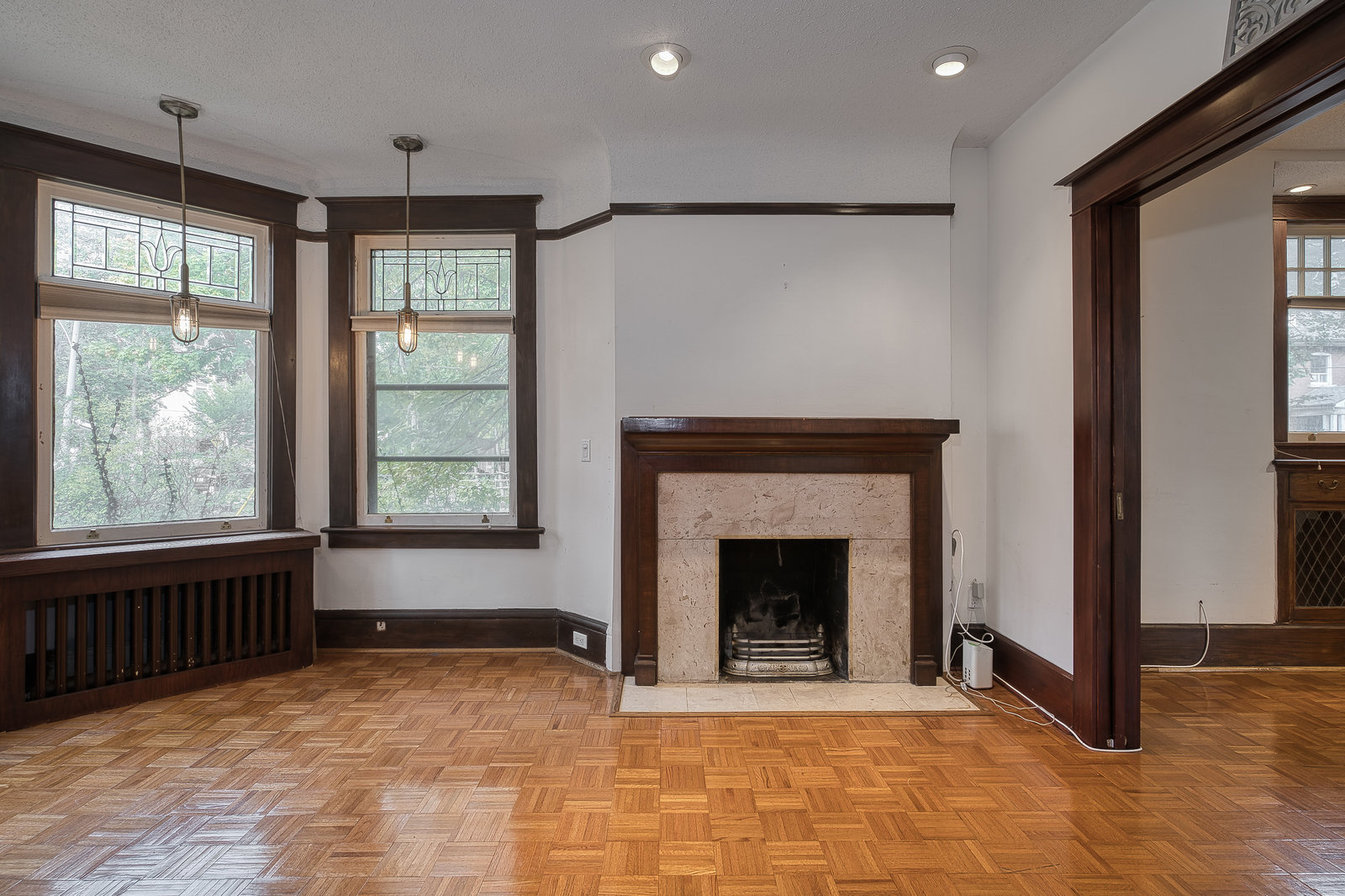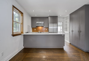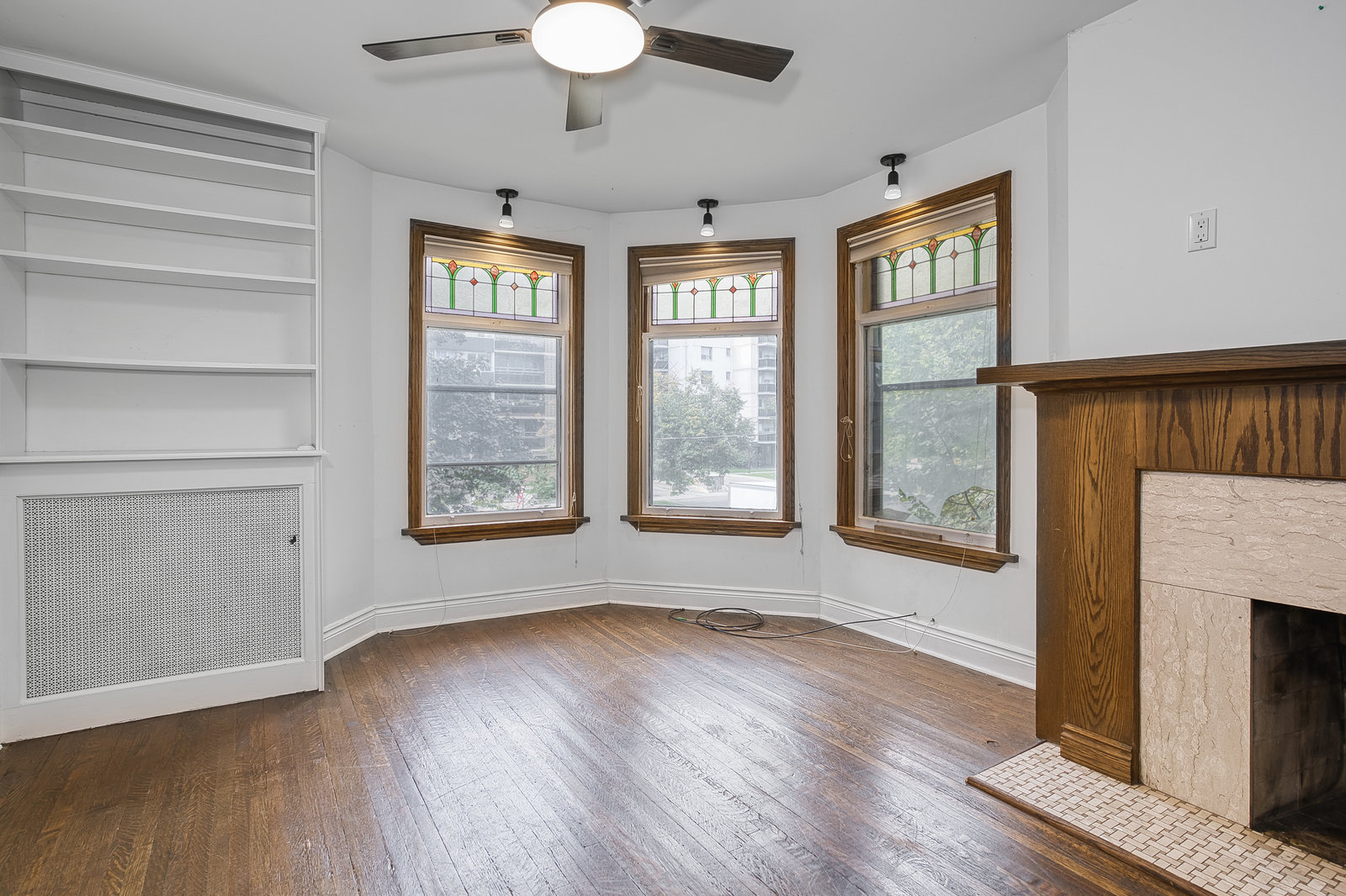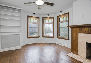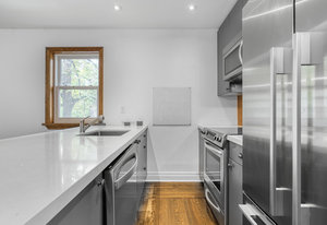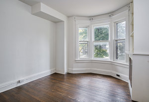 The character filled front foyer leads you to the second floor unit which is thoughtfully laid-out. The updated kitchen with quartz island opens into the dining and living areas with more stunning bow windows. One bedroom plus a bright east-facing sunroom ideal as a second bedroom or office, and a stylish 4-piece bath.
