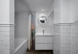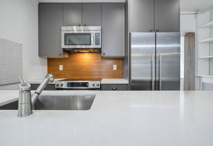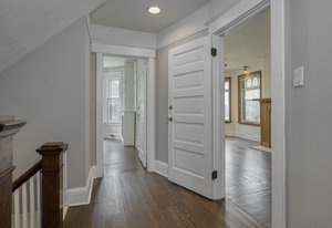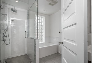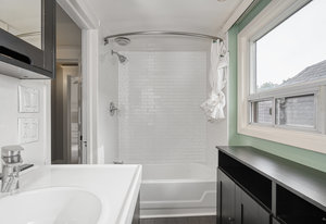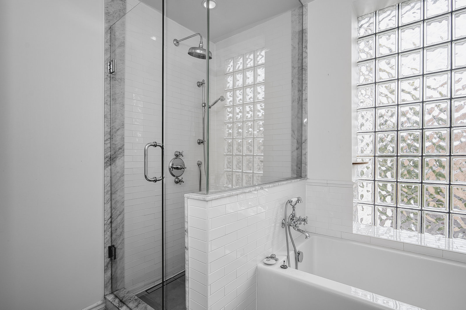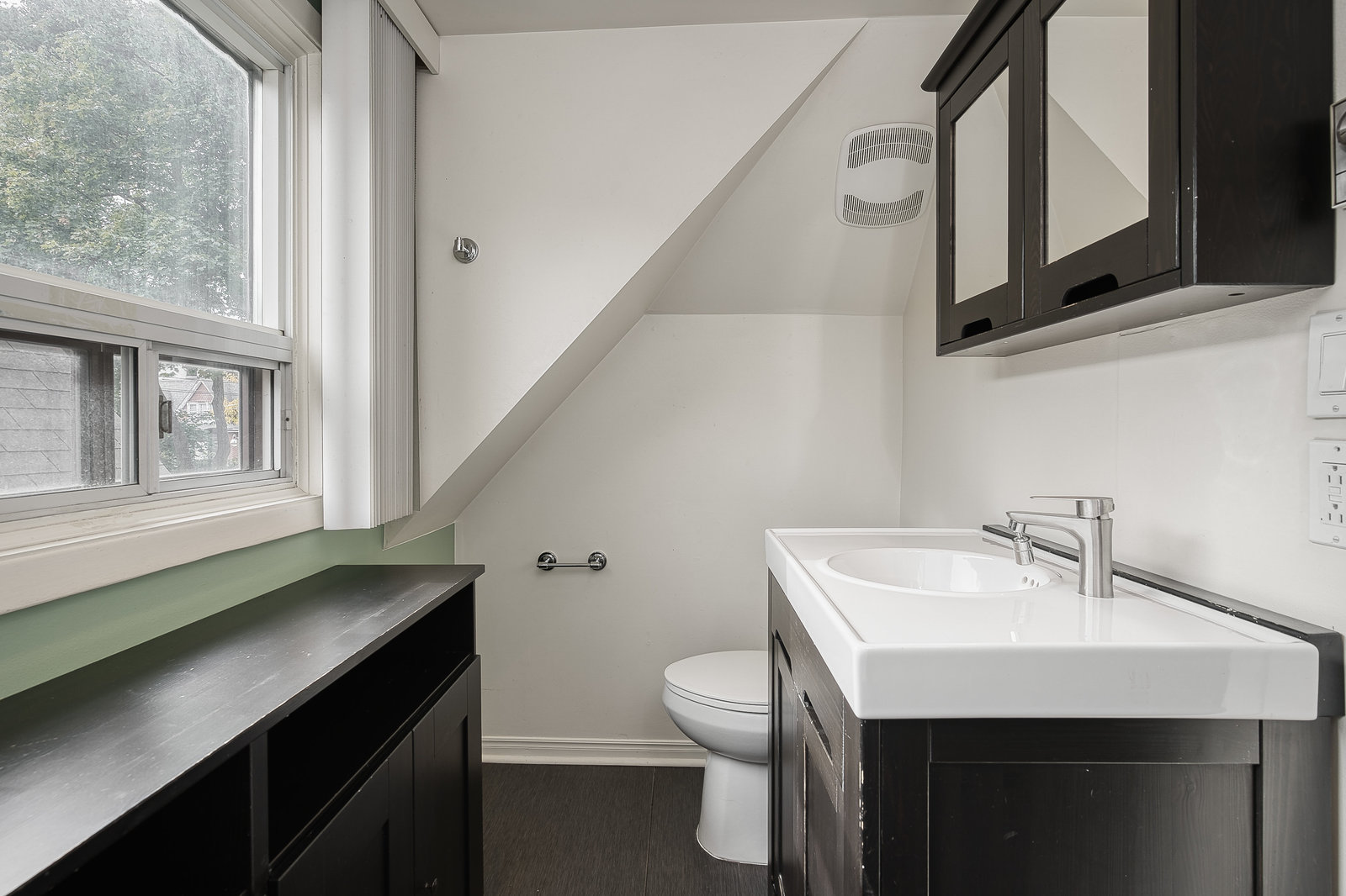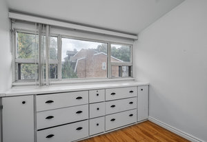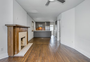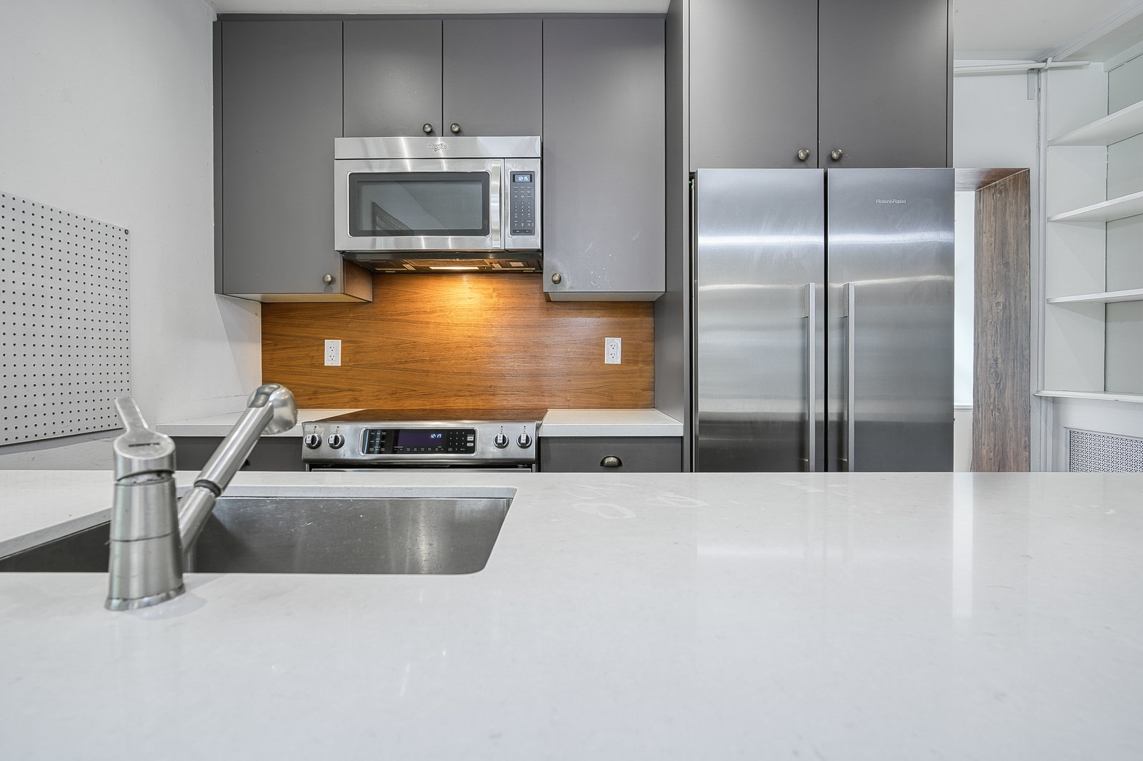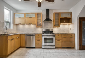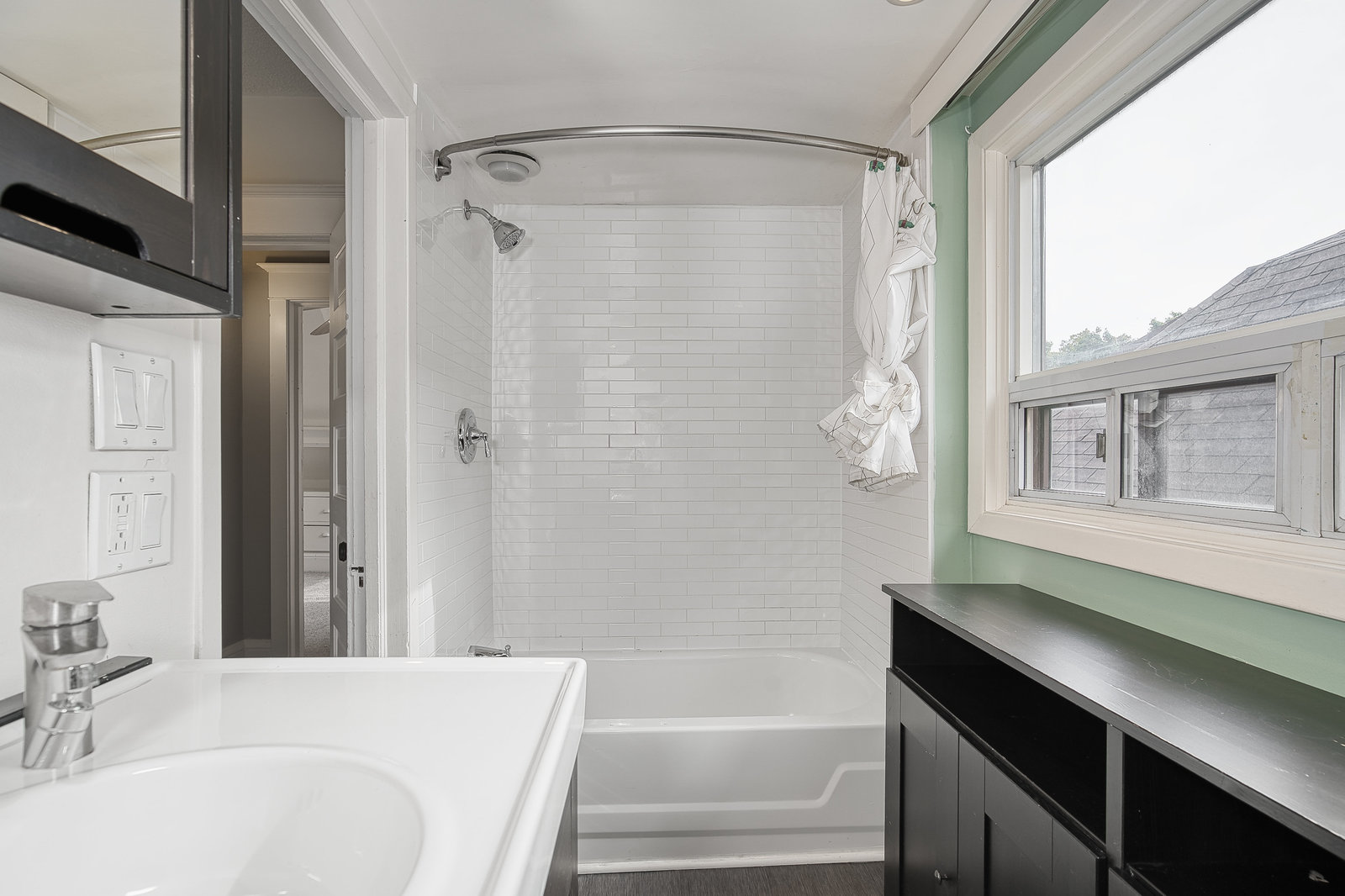 The character filled front foyer leads you to the second floor unit which is thoughtfully laid-out. The updated kitchen with quartz island opens into the dining and living areas with more stunning bow windows. One bedroom plus a bright east-facing sunroom ideal as a second bedroom or office, and a stylish 4-piece bath.