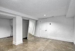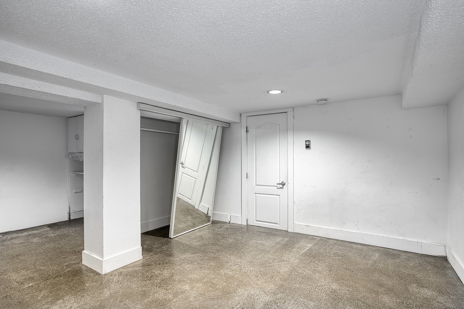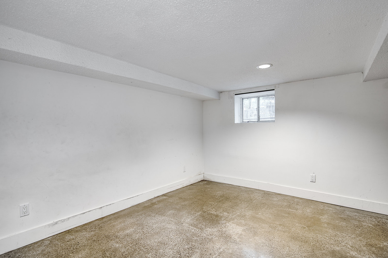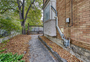Private rear entrance opens to a large kitchen with granite counters and stainless steel appliances, and a powder room tucked away in the corner. Elegant principal rooms feature a spacious living room with a bow window and a formal dining room. The finished basement features heated floors, a generous bedroom, a 4-piece bath, and ample storage.