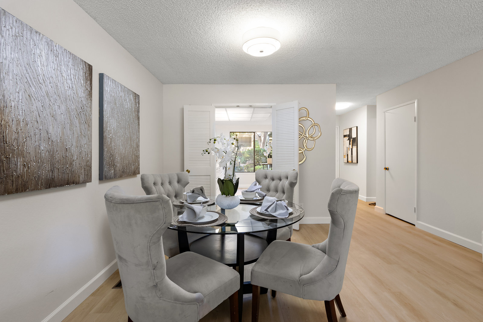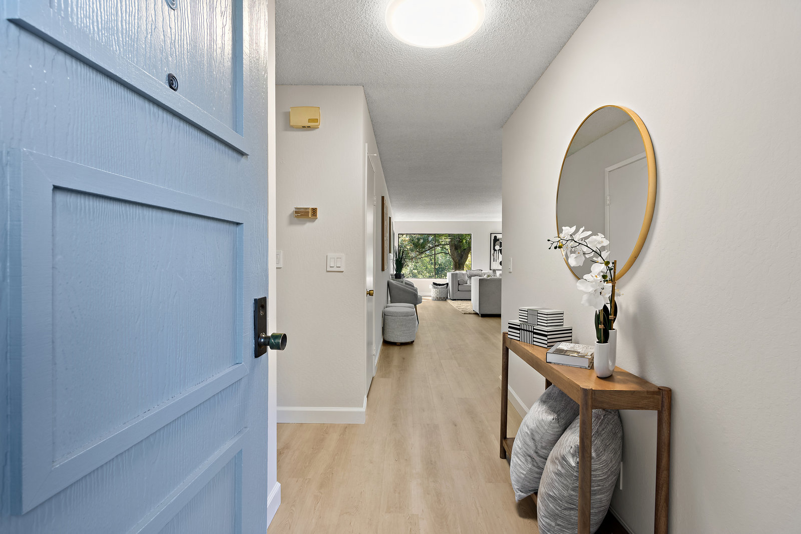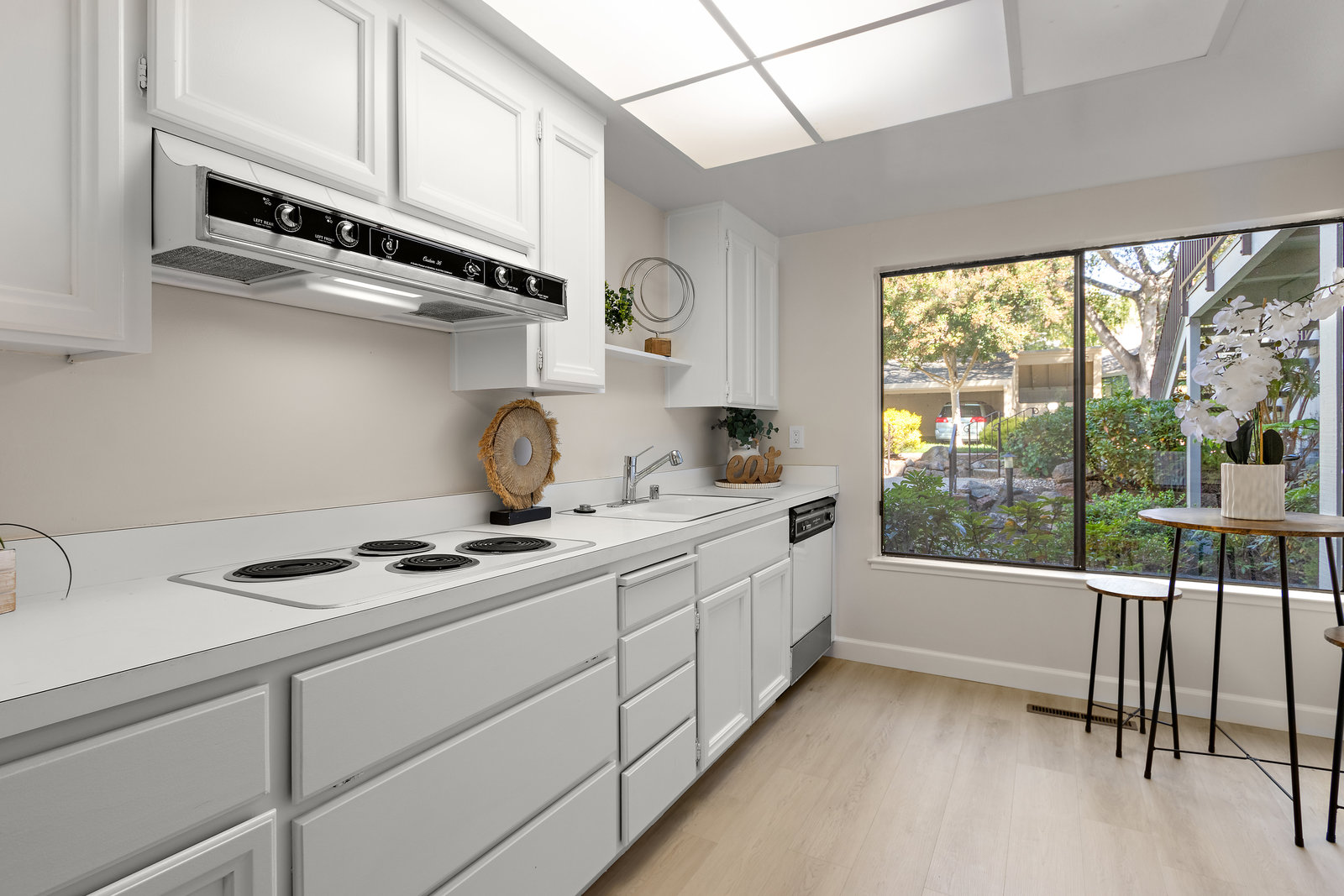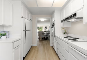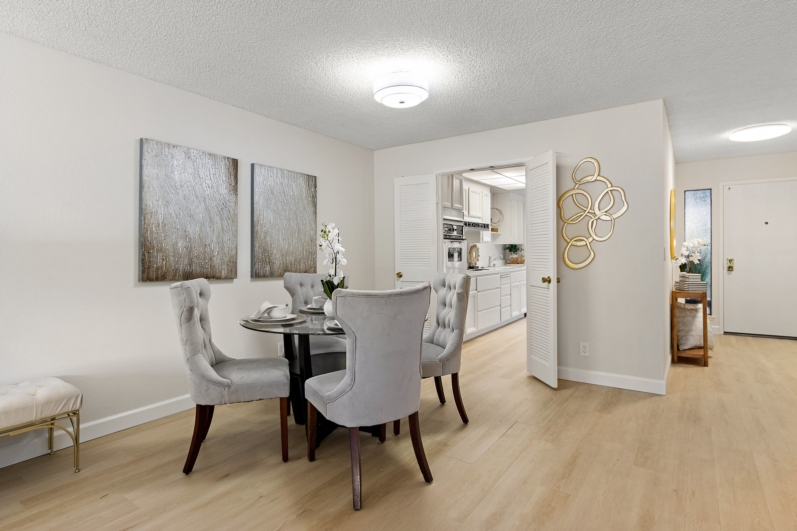 Located in highly sought after lagoon Entry 1Rossmoor Parkway. Walk to Event Center, Creekside and Pickle Ball. Back balcony faces the 3 rd Tee on Stanley Dollar Golf Course providing grandstand views of the play. The home is light filled, has luxury vinyl wood look flooring through out, new paint, baseboards. A spacious great room provides ample living room and dining room space off the kitchen. A utility room in the hallway has full size washer and dryer, HVAC, water heater and storage shelving. A master bedroom with on suite bathroom and double closets has slider doors that open onto the exterior back balcony and grand golf course views. A guest bedroom at the opposite end of the hallway provides more and could be a bedroom or office space. A single car garage with electronic roll up door accompanies this home.