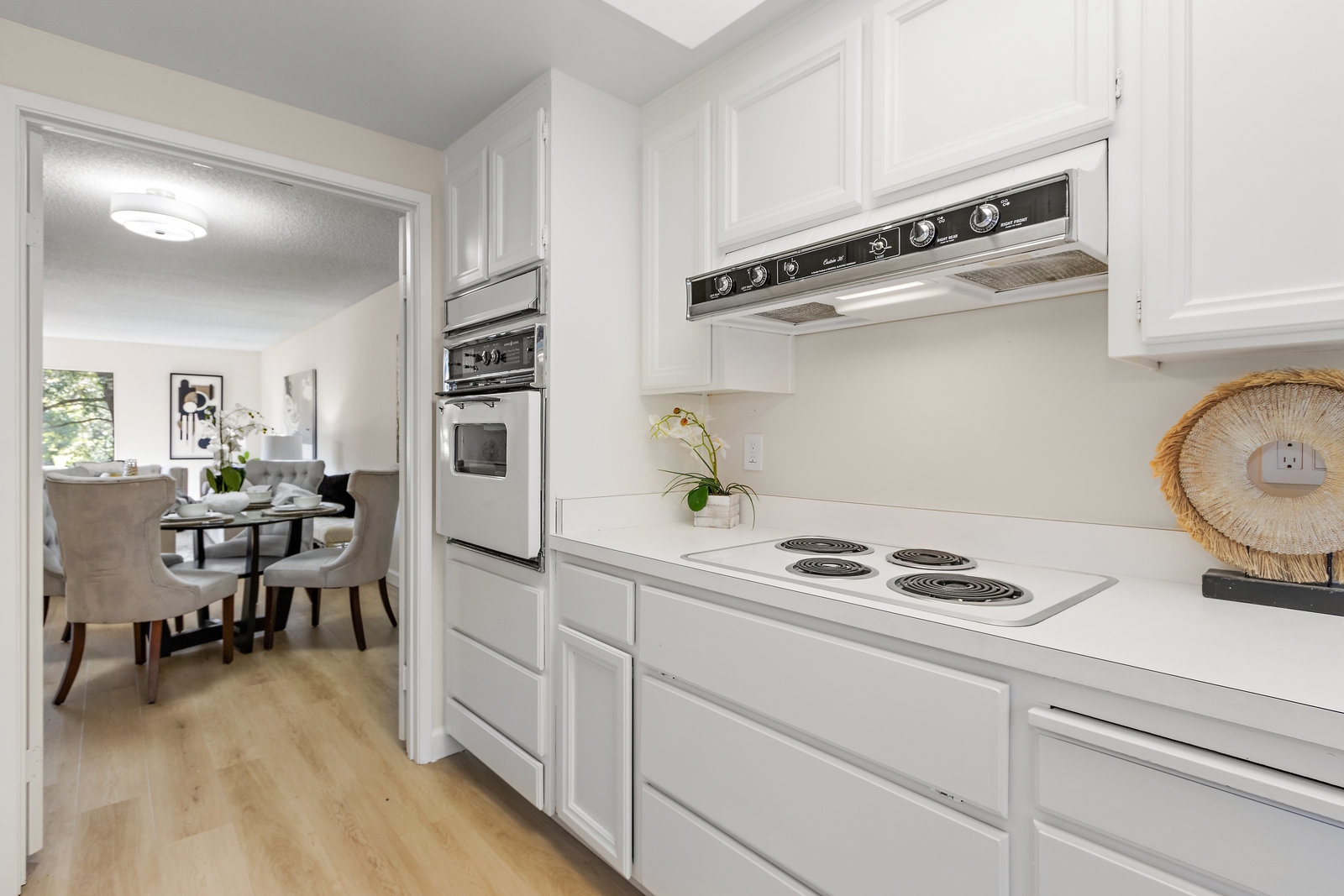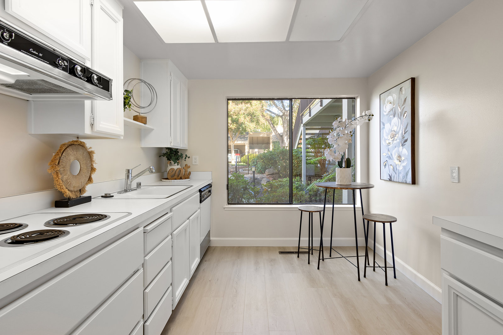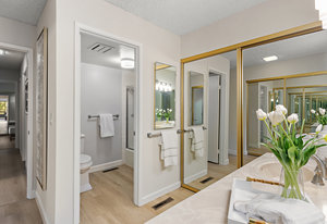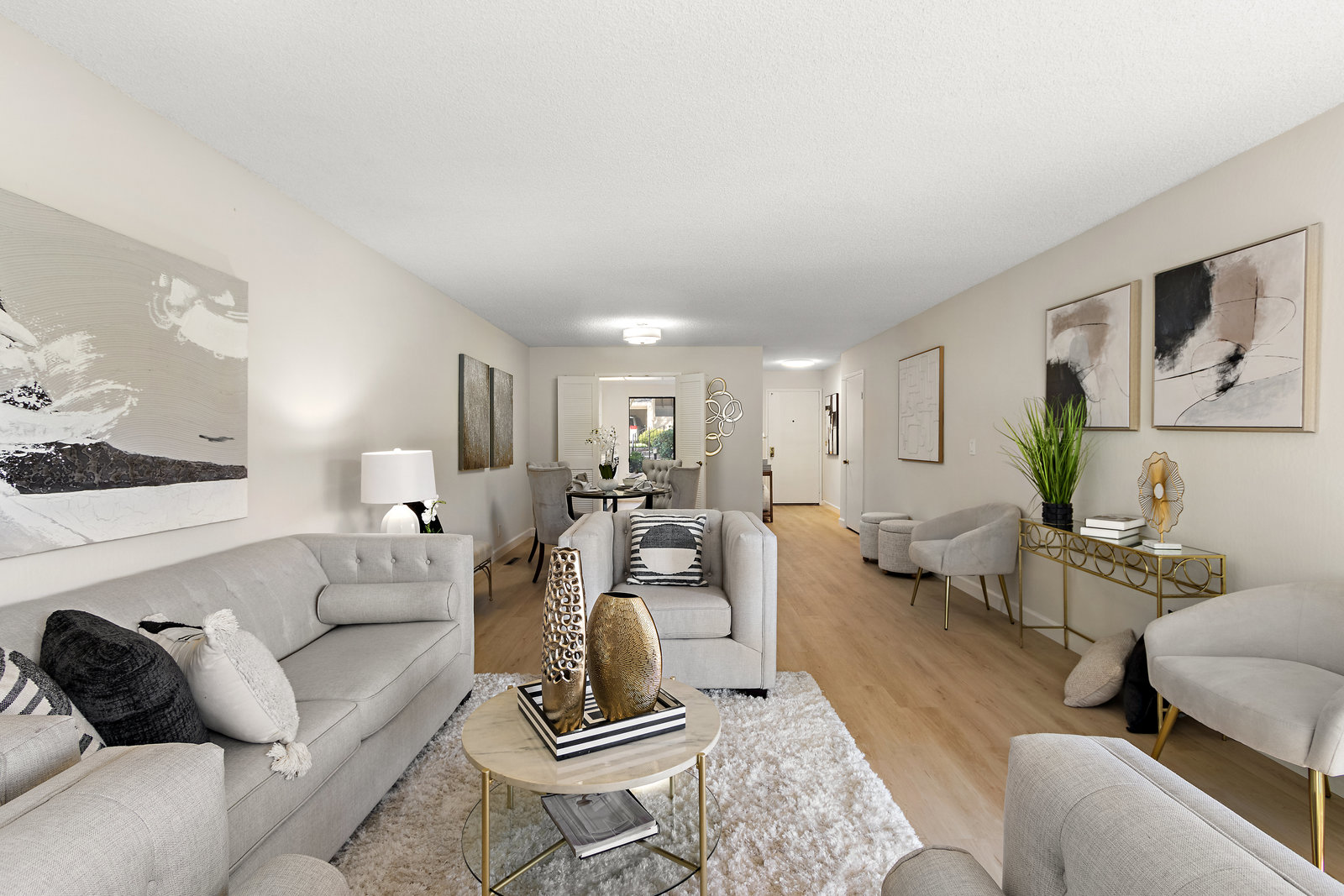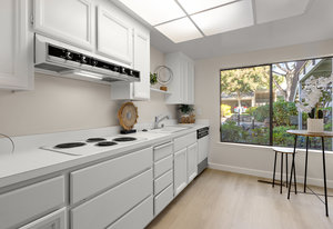 Located in highly sought after lagoon Entry 1Rossmoor Parkway. Walk to Event Center, Creekside and Pickle Ball. Back balcony faces the 3 rd Tee on Stanley Dollar Golf Course providing grandstand views of the play. The home is light filled, has luxury vinyl wood look flooring through out, new paint, baseboards. A spacious great room provides ample living room and dining room space off the kitchen. A utility room in the hallway has full size washer and dryer, HVAC, water heater and storage shelving. A master bedroom with on suite bathroom and double closets has slider doors that open onto the exterior back balcony and grand golf course views. A guest bedroom at the opposite end of the hallway provides more and could be a bedroom or office space. A single car garage with electronic roll up door accompanies this home.