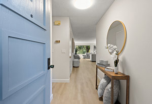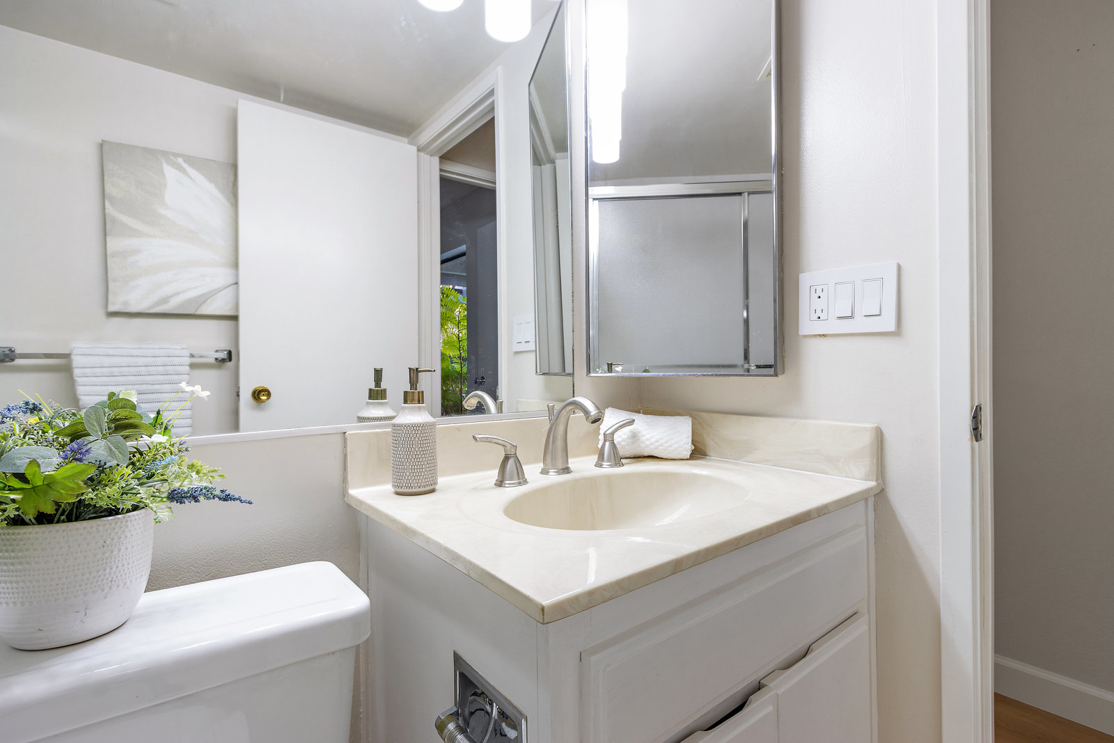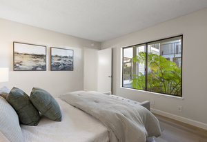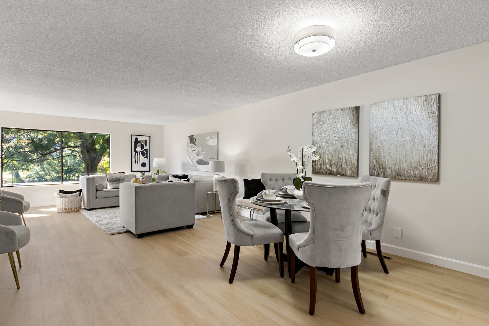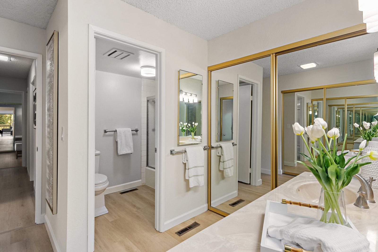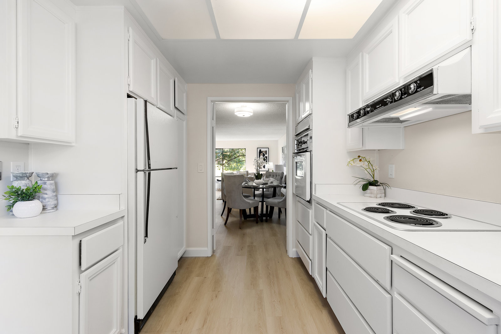 Located in highly sought after lagoon Entry 1Rossmoor Parkway. Walk to Event Center, Creekside and Pickle Ball. Back balcony faces the 3 rd Tee on Stanley Dollar Golf Course providing grandstand views of the play. The home is light filled, has luxury vinyl wood look flooring through out, new paint, baseboards. A spacious great room provides ample living room and dining room space off the kitchen. A utility room in the hallway has full size washer and dryer, HVAC, water heater and storage shelving. A master bedroom with on suite bathroom and double closets has slider doors that open onto the exterior back balcony and grand golf course views. A guest bedroom at the opposite end of the hallway provides more and could be a bedroom or office space. A single car garage with electronic roll up door accompanies this home.