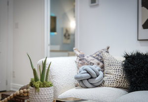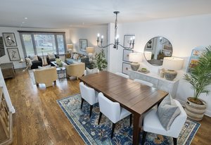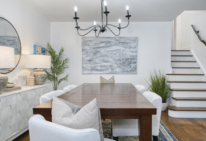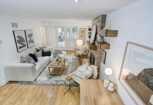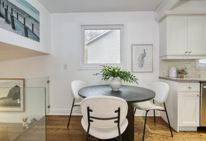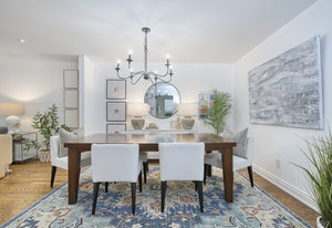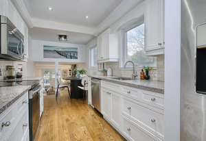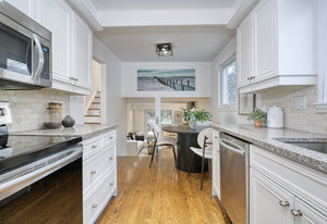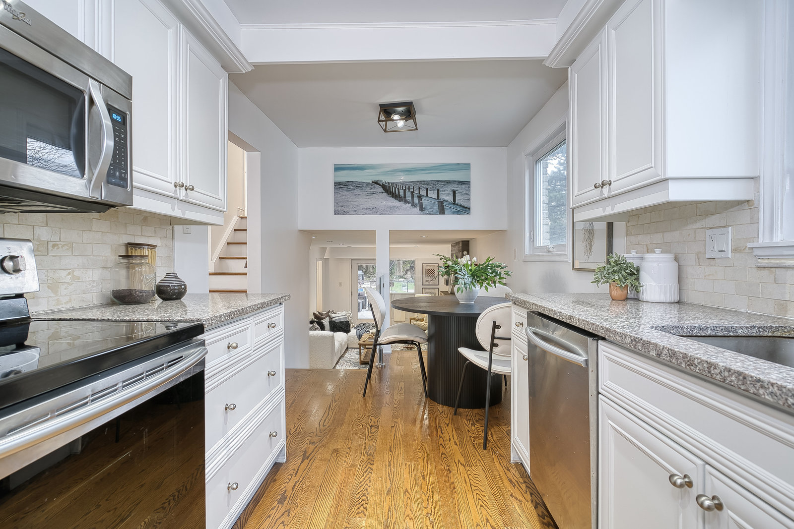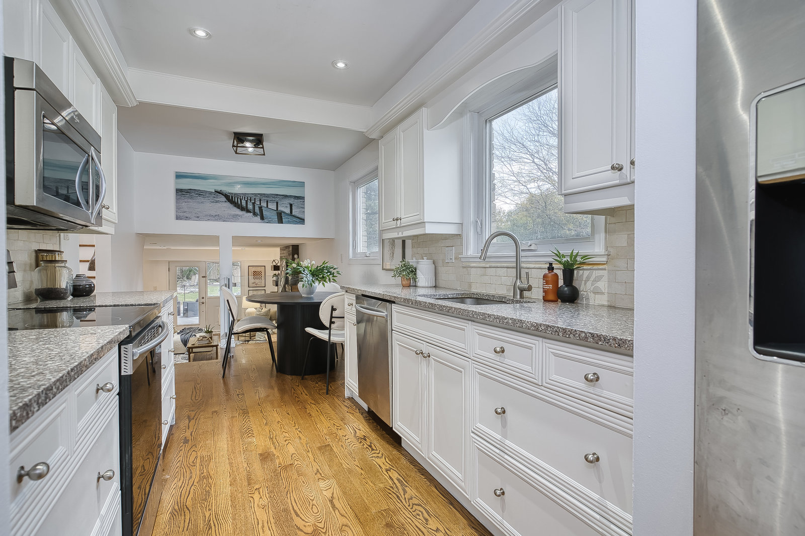 large windows that flood the space with natural light. The modern kitchen features granite