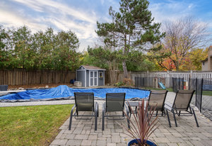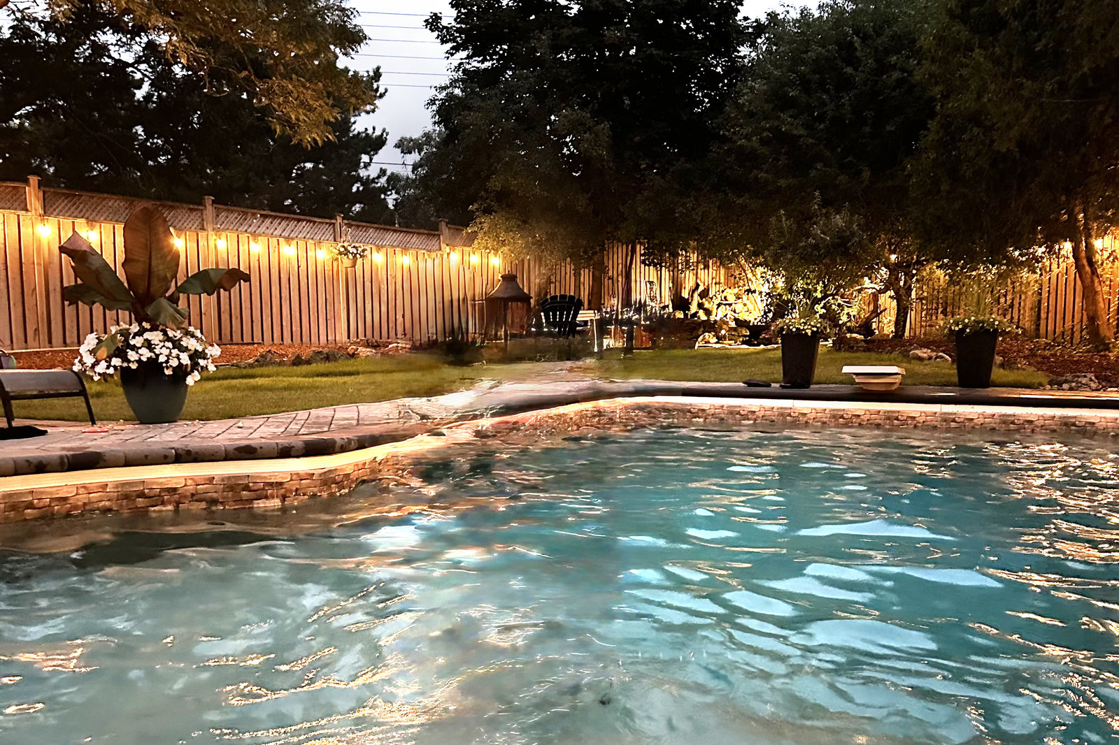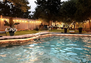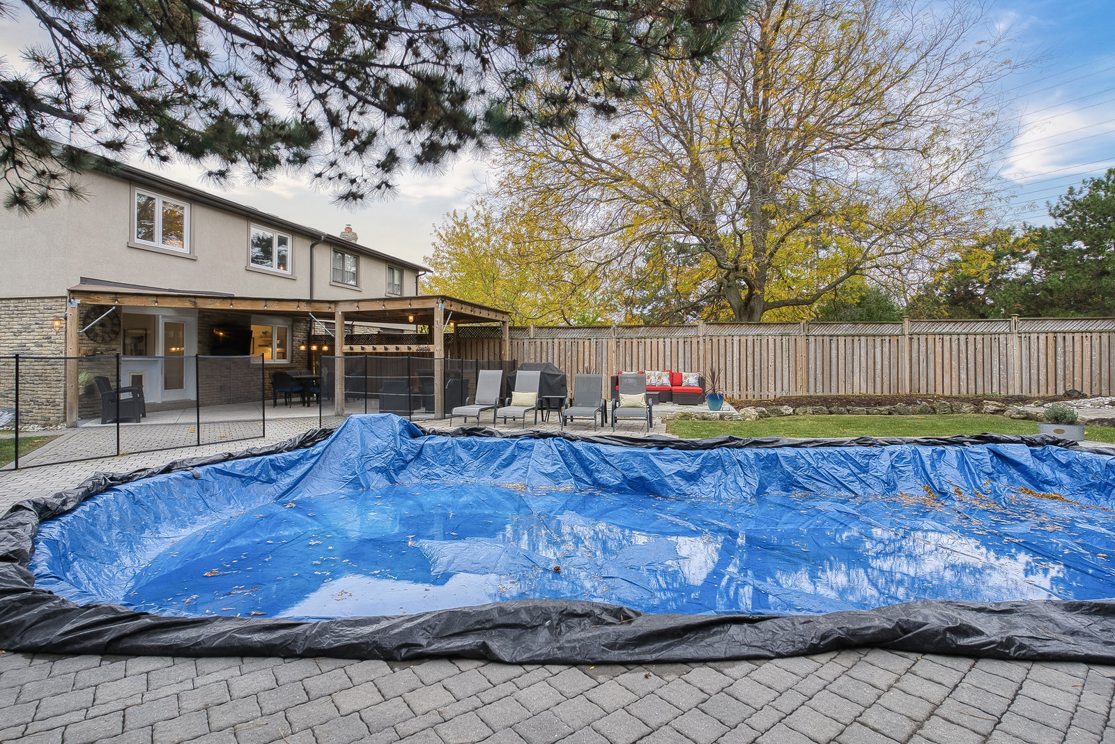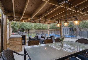 Step outside to your private backyard oasis featuring a covered seating area, heated saltwater