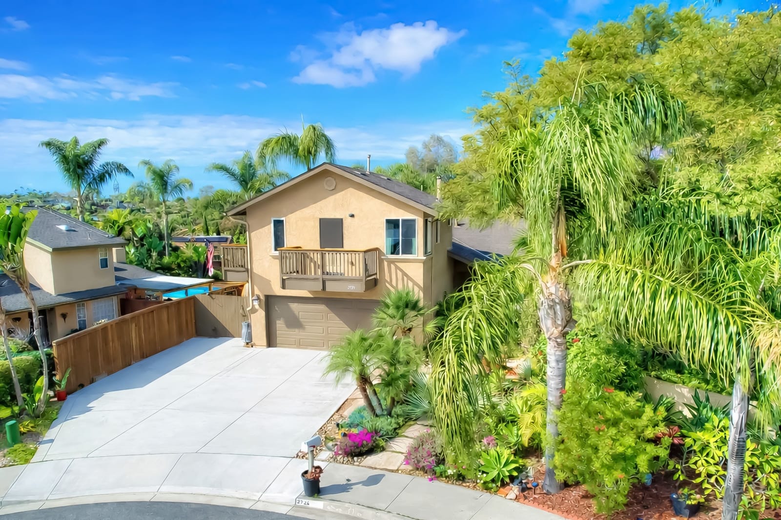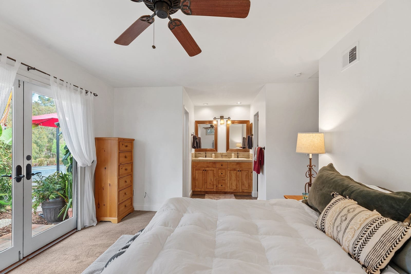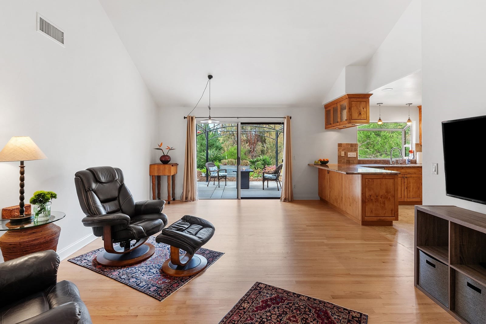 Tucked away on a desirable cul-de-sac, this lovely home offers the perfect blend of comfort, flexibility, and classic Carlsbad charm. Set on an expansive 11,400 sq ft lot with open space behind, the home enjoys peaceful views of lush greenery and mature trees, your own private retreat just minutes from the coast. Adding exceptional versatility is the attached ADU above the garage, included in the 2,172 sq ft of living space. Complete with a living area, kitchen, eating nook, bedroom, and bath, it’s ideal for extended family, guests, or a private retreat. Step onto the balcony and take in gorgeous sunset views, a daily reminder of how special this location is. The main home lives entirely on one level, featuring three bedrooms and two baths, and is thoughtfully designed for both everyday living and entertaining. The updated kitchen is a standout with Alderwood cabinetry with pull-out drawers, granite countertops, stainless steel appliances, under-cabinet lighting, and travertine tile floors. It opens seamlessly to the spacious family room, where vaulted ceilings, a casual dining area, and a sliding door to the backyard invite gatherings to flow effortlessly indoors and out. The private and peaceful backyard oasis offers endless possibilities: sip your morning coffee, unwind at the end of the day, or host memorable gatherings surrounded by nature. A formal dining room opens to a tranquil grassy side patio, ideal for alfresco dinners, while the large living room offers a cozy stone fireplace and a charming barn door at the entryway. The front yard provides a welcoming sitting area, perfect for greeting neighbors or enjoying a quiet moment. The spacious primary bedroom features a walk-in closet, updated bathroom with skylight, ceiling fan, and French doors offering a lovely view and access to the backyard. Beautiful Alderwood cabinets and doors are showcased throughout the home, adding warmth and a cohesive design element. All this, just minutes from the beach, Carlsbad Village, shopping, dining, schools, and freeway access. This is a home that truly offers options, warmth, and lifestyle, a rare opportunity in one of Carlsbad’s popular neighborhoods.