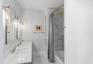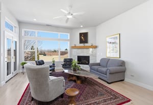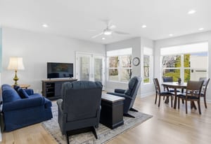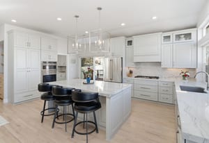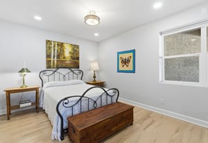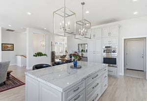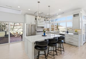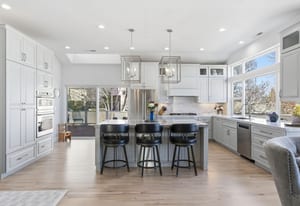 Step onto gorgeous oak hardwood floors that flow through an open-concept layout, illuminated with curated designer lighting and enormously sized windows that bring in an abundance of natural light. The chef-inspired kitchen is a showpiece of both style and innovation, featuring elegant quartzite countertops, a custom island, and a sleek, modern aesthetic achieved through hidden electrical outlets and under-cabinet lighting. The suite of premium appliances, almost entirely updated in 2022, includes designer GE Café Series appliances that ensure top-tier performance for every culinary endeavor.