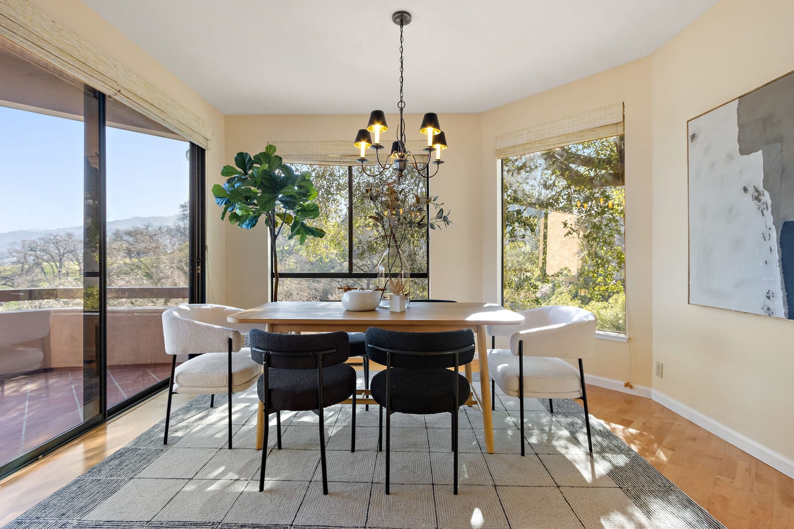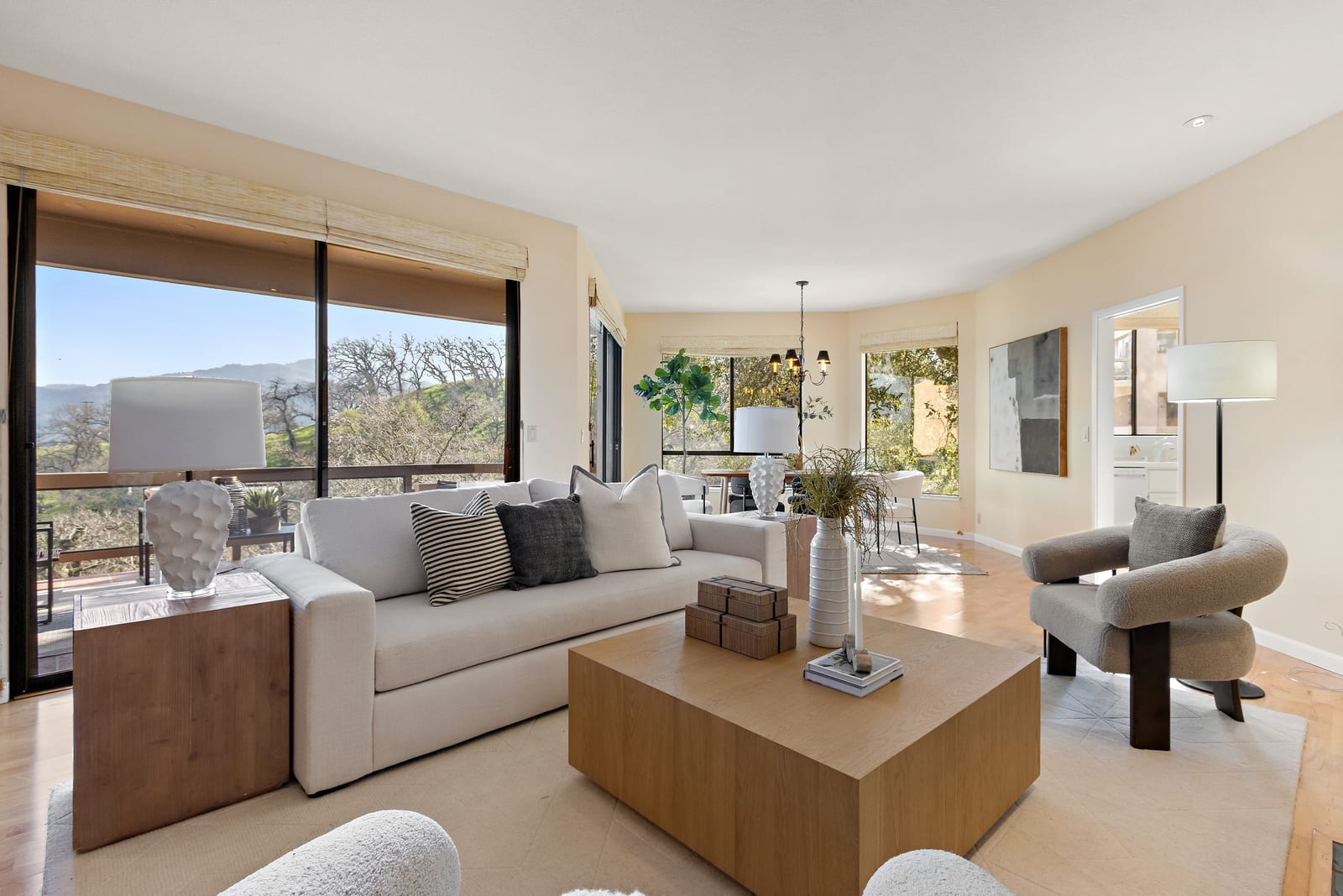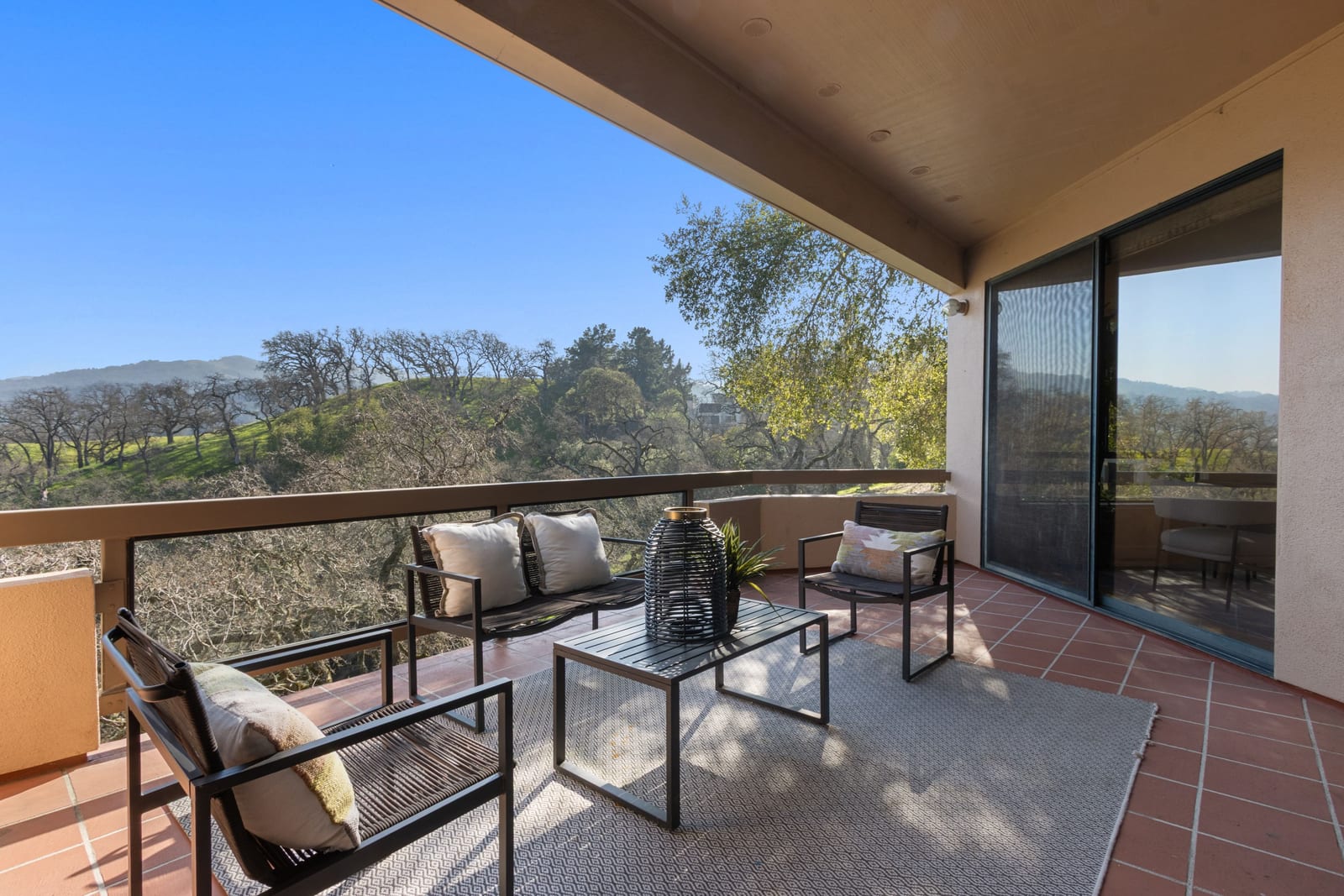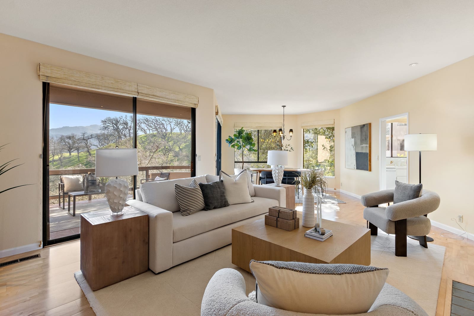 We are proud to present a new Villa Robles model situated in a rare two-story building near the top of Stanley Dollar in Rossmoor. Enjoy fabulous views of the Rossmoor valley, rolling hills, and Mt Diablo from the expansive tiled deck accessible from the Living Room, Dining Area, and Primary Bedroom. This private end-unit condo features a spacious Living Room/Dining Room with a fireplace and spotlight lighting that is surrounded by sylvan views from every window and sliding glass door. The large Kitchen has an abundance of cabinets and counter space as well as a passthrough to the Living Room and a with a cozy breakfast nook for informal meals. Plenty of desirable updates like smooth ceilings, hardwood floors, new carpeting in the bedrooms, and more. Parking and storage is a breeze with an attached garage with interior access off the Kitchen and a large storage loft. Solar panels on the roof provide great energy savings and the laundry room off the Kitchen has a side-by-side washer/dryer and cabinetry. Spend your mornings enjoying the sunrise over the Rossmoor valley in this special property.